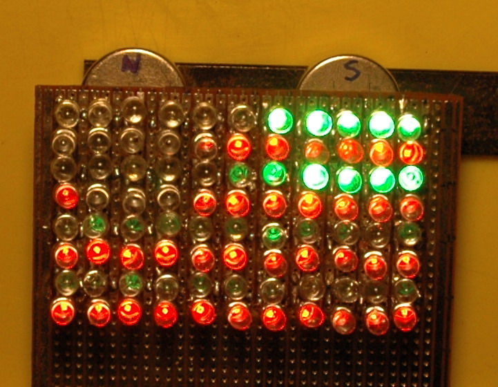 Above, left photo shows no magnetic field. The red LED's are on only.  The center photo shows the green LED's light up with the applied south pole field from a NIB magnet and all turn off with an applied north pole field. The right photo shows the field from a MOT with a DC current passing through it.