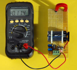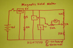 Above, left photo shows the magnetic field sensor reading the strength (in Tesla's) of a small horseshoe magnet. The meter is not yet calibrated so the reading is not correct.  The center photo shows underneath with untidy but fast point to point wiring. The right photo shows the circuit diagram with provision for a switched external sensor.