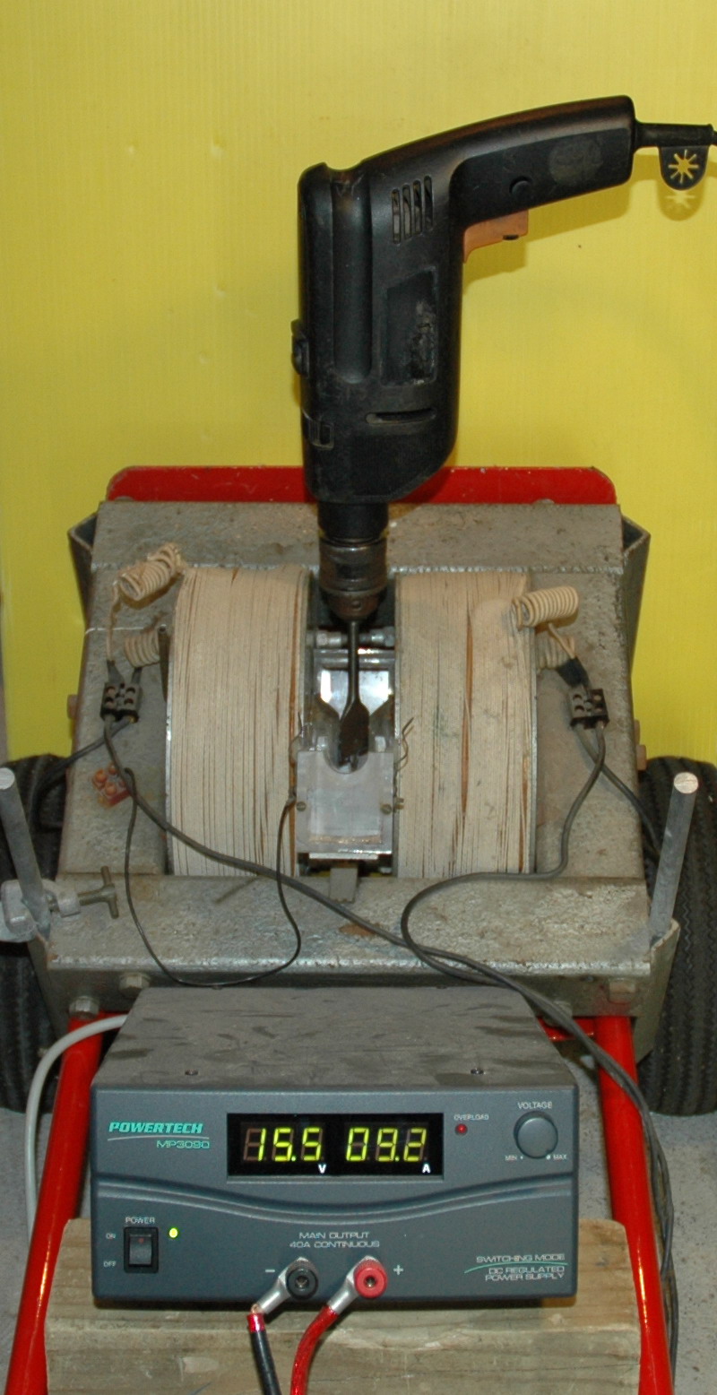 In the photo above a drill is supported by the spade bit between the pole faces.  I haven't tried a higher power yet but might if I have something to show such as plasma in a neon tube or liquid oxygen.