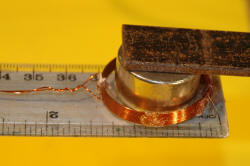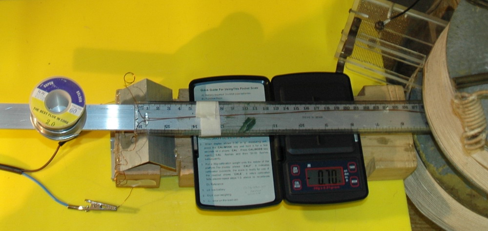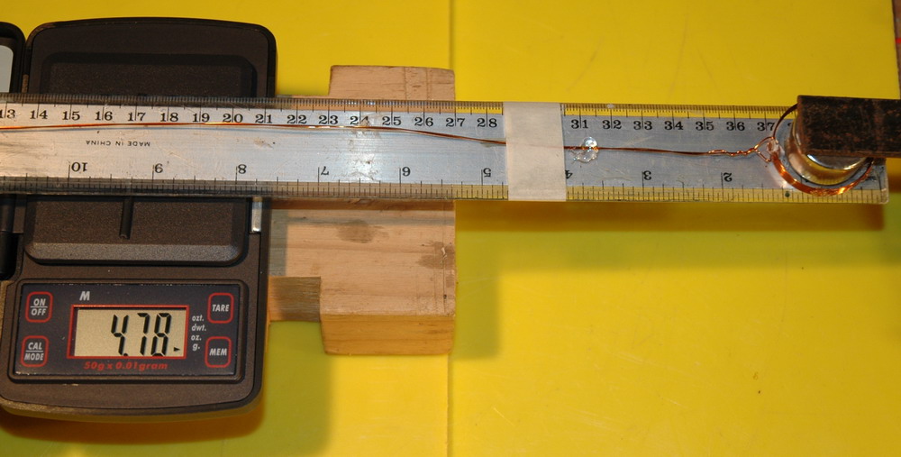 The left photo shows the voice coil in the big electromagnet gap. The right photo shows the balance arrangement with the meter reading 0.70 g with 100 mA running in the voice coil.  Actual voice coil force accounting for the fulcrum is 0.31 g.  Note that this is much smaller than the NIB magnet  .  The electromagnet is on with 43 V at 25 A = 1075 W and doesn't even get warm for short runs.