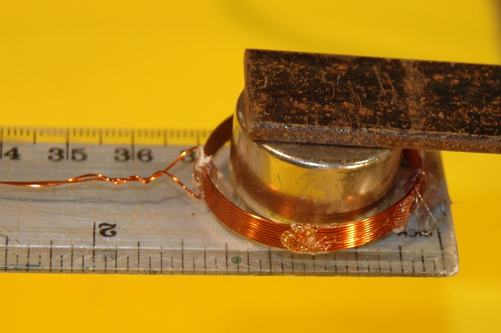To measure the field generated by the electromagnet above I made a coil that could be placed in the magnetic field. A known current can be passed in it, the force measured and hence the field calculated from the formula: