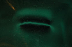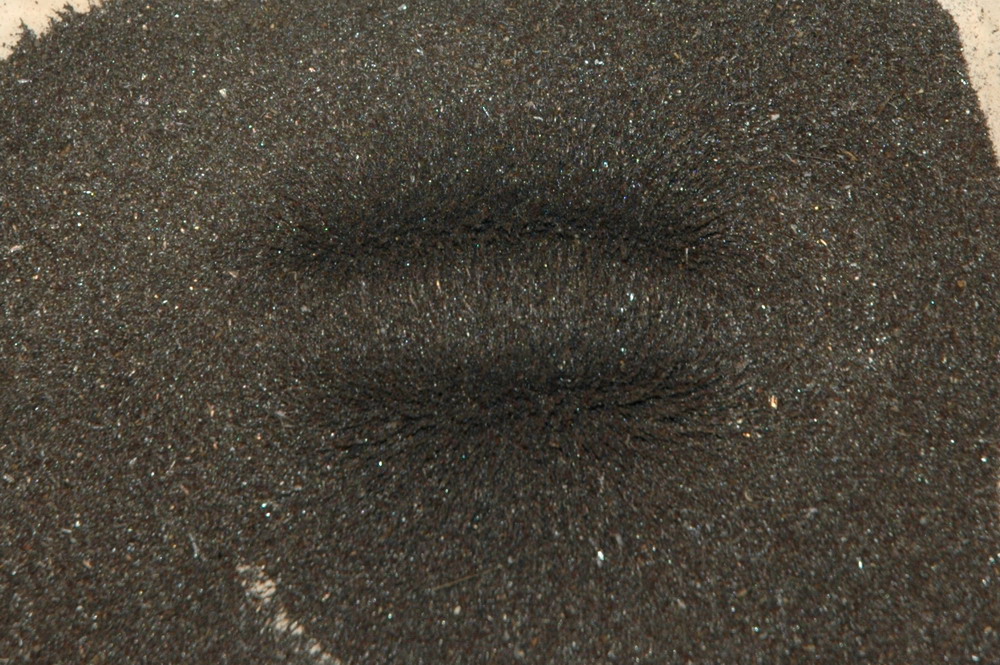 Above, left photo shows the field after placing the magnet in the poles of the big electromagnet. Power was 37 v 20 A.  The right photo shows the same view in iron filings. Note how the magnet poles are now on either side of the magnet rather at the ends.