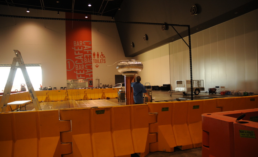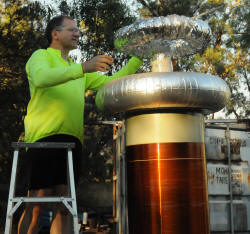 Much other equipment was constructed for this show including a bank of 6 arc welders to be used as needed for voltage isolation or ballast, and two 3 phase distribution boxes. Also extended black backdrops and a vast foil earthing system / partial Faraday cage not to mention a new capacitor bank and power factor correction. Above left shows the generator, capacitor bank and TC controller getting packed. Center shows the enormous pavilion and my fenced off area. They removed the carpet so they could drive trucks in. Right shows my team of (L to R) Michael, my son who did the music, Chris (son), Jane (wife), Jaime (Chris's g/f) and me. Above left is the repositioned enclosure and center shows one of many discussions with the safety officer, Joshua. The right photo is the final setup ready to go. Note there is a network of suspended wires completely circling the TC for protection and reduced fields for camera safety. On the day I decided not to go with the rigging of an elevated shield in view of the height of the roof. Note the large foil covered area of about 50 feet which is the RF earth which connects to all the elevated wires and frames. There was no direct link to the pavilion building earth but there may have been through some expansion joint covers. The mains earth was kept separate. I ran the ARSG gap and blower gap motors through back to back arc welders as isolation transformers. There was no clear return path for capacitative currents induced into the 50 foot ceiling. There was no ground available for over 100 m that was not a mains ground. Using this method of a "Faraday cage" open at the top, there was no evidence for interference with sound or cabled video cameras. It was close enough to have sparks within perhaps 10 feet of the judges (it could have safely been a lot closer with my design - tested to within 2 feet). The grounding with downwires from the frame allowed confidence in preventing capacitative voltages appearing on equipment and operators. It is my belief that this is more important than RF interference. Certainly this was as close as my operators have been and no tickle from holding the variac!