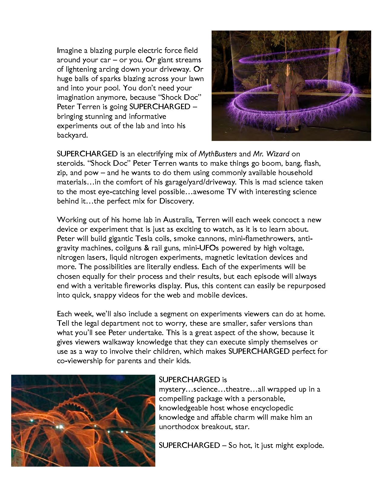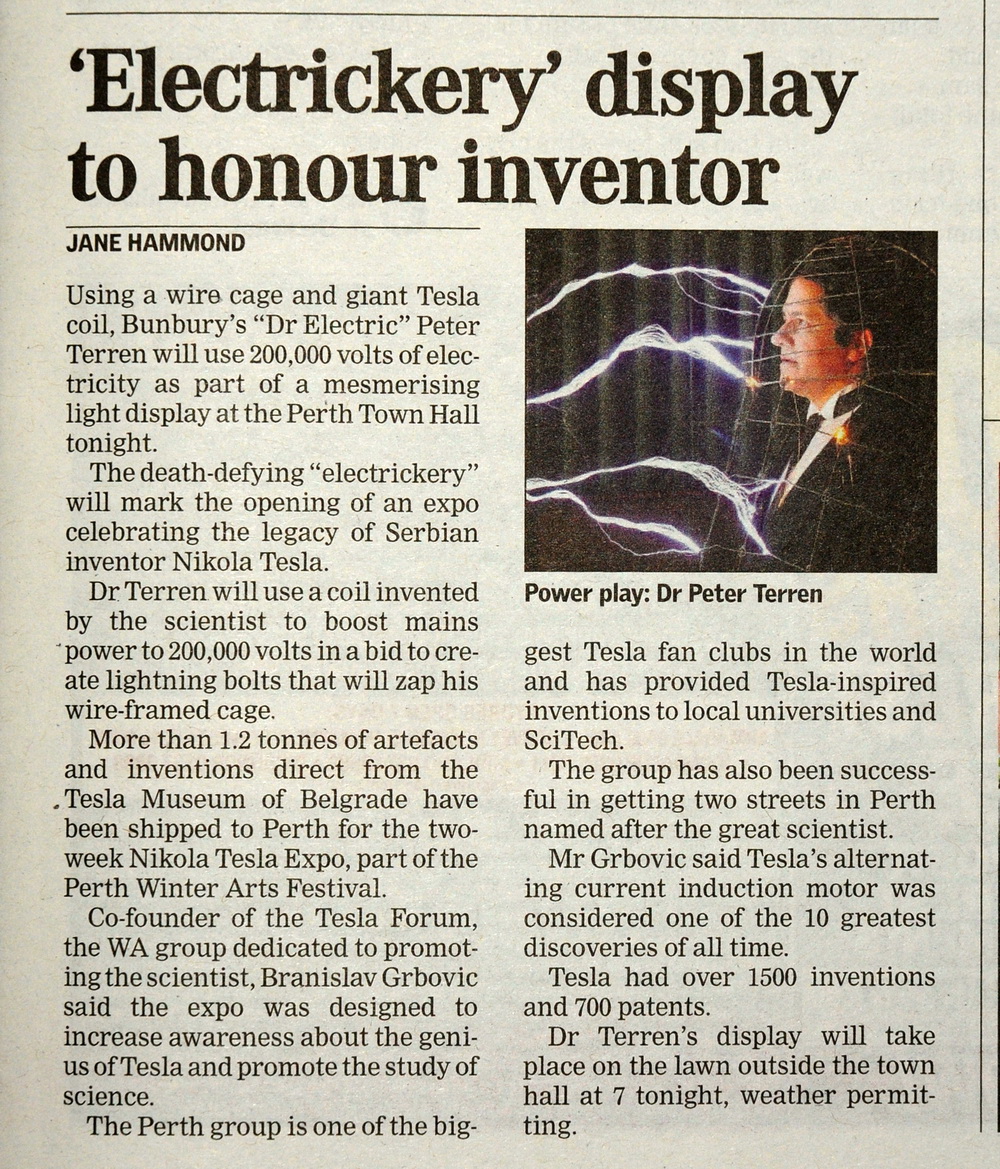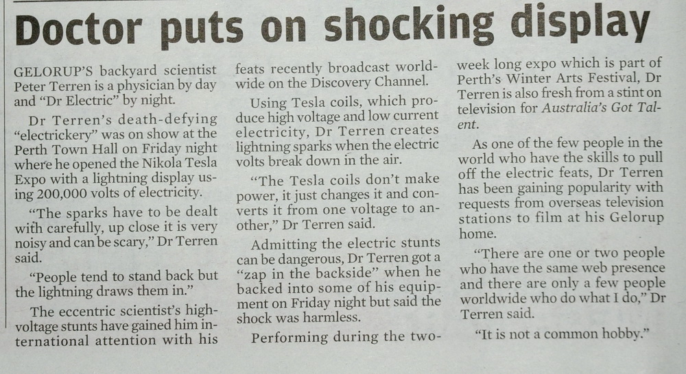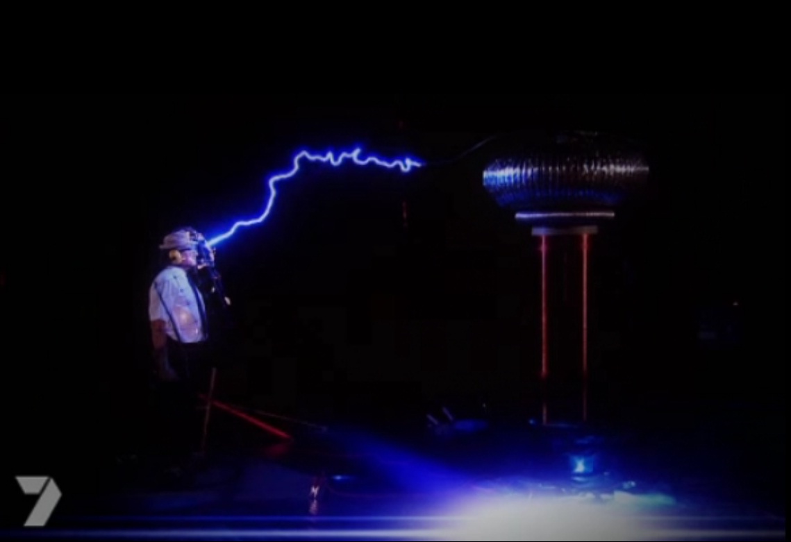 Media coverage of Tesladownunder on this page includes: Australia's Got Talent 2011 Channel 7 Discovery USA TV "Is it possible?" 2010 USA Channel 9 TV A Current Affair 2009 Australia Channel 7 TV Today Tonight Australia Jan 2009 Channel 7 TV Today Tonight Australia May 2009 WIN TV Australia and 16 other countries "Elec-trickery" Discovery Channel TV episode 1 Canada Discovery Channel TV episode 2 Canada Discovery Channel TV episode 3 Canada Discovery Channel TV episode 4 Canada German Pro Sieben TV "Galileo" Media that didn't happen (yet)
