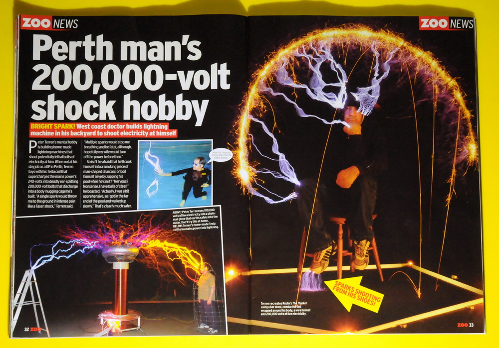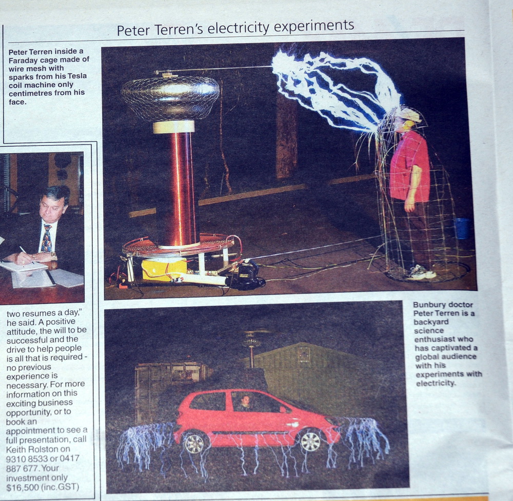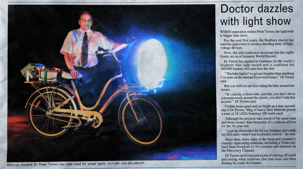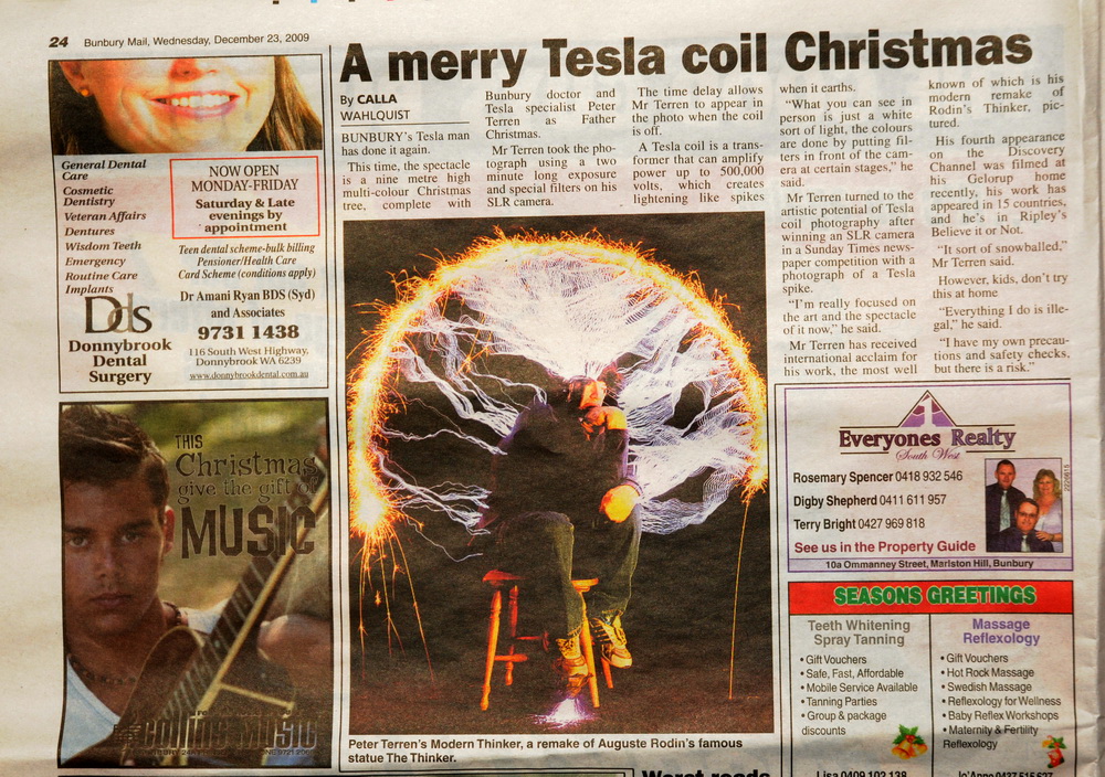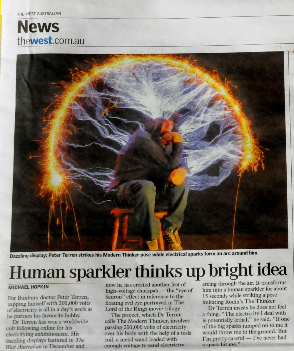 Feb 3, 2011. Engineering website requesting use of photos. Pending Jan 30, 2011. Evokke iPad magazine interview. Pending. Jan 27, 2011. Ripley's Believe it or not. Plans to put the Modern Thinker in the 2011 edition. Pending. Jan 26, 2011 Movie requesting Tesla effects. "Fragments of Olympus". Referred to KVA effects. Jan 24, 2011 Brazilian Textbook seeks Thinker picture. Pending. Jan 23 2011. Scitech promotion with a radio station using a Faraday cage that I was to make. Failed re public liability issues. Jan 20, 2011. Entered my ISP's contest for "Top Geek". Probably 250 entries. Didn't make it into the top 10%. Seems like a young girl who likes anime is more geeky. Sexy, yes, geeky, no. Fail. Jan 11, 2010 Applied to NASA for a project on worlds bightest flashlight. Pending. Jan 19, 2011 Commercial shoot in Sydney. Failed re too far to travel. Jan 9, 2011 German TV interview Redaktion Explosiv. Failure re making myself too expensive. Dec 1, 2010. Christmas pageant entry with my bike failed due to public liability issues for God's sake! Bunbury Council have officious bureaucrats. Last laugh - my bike was on national TV and they weren't. Nov 28 2010. Applications for Guinness World Records for Flashlight and Bike lights. Pending. Nov 26 2010 Chinese Hunan TV in Chungsha wanted me to ship my Tesla stuff over for an interview. Failed re equipment not readily transportable. Nov 26 2010. Request to do a New Years show in Melbourne for Euchronia. Sadly, too far, too expensive. Nov 17, 2010 Russian group wanting me to do a cheap exhibit for a Russian Museum. Too cheap, too far. Nov 12, 2010 Artistic director wanted a quiet TC for the film "Iron Sky". Recommented a crackle tube. Oct 1, 2010. Barcroft media accepted videos of Bike and Flashlight but late delivery and not looked at. An expensive fail. Aug 28, 2010 South Korean TV. Did a short article on home videocam. Didn't hear if it was shown.