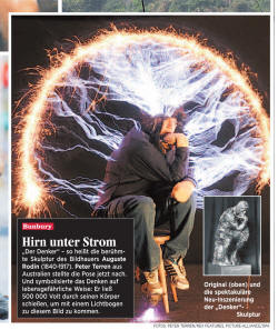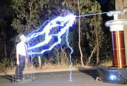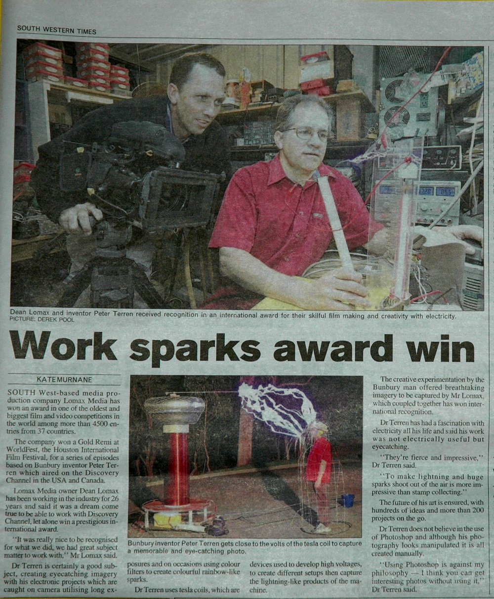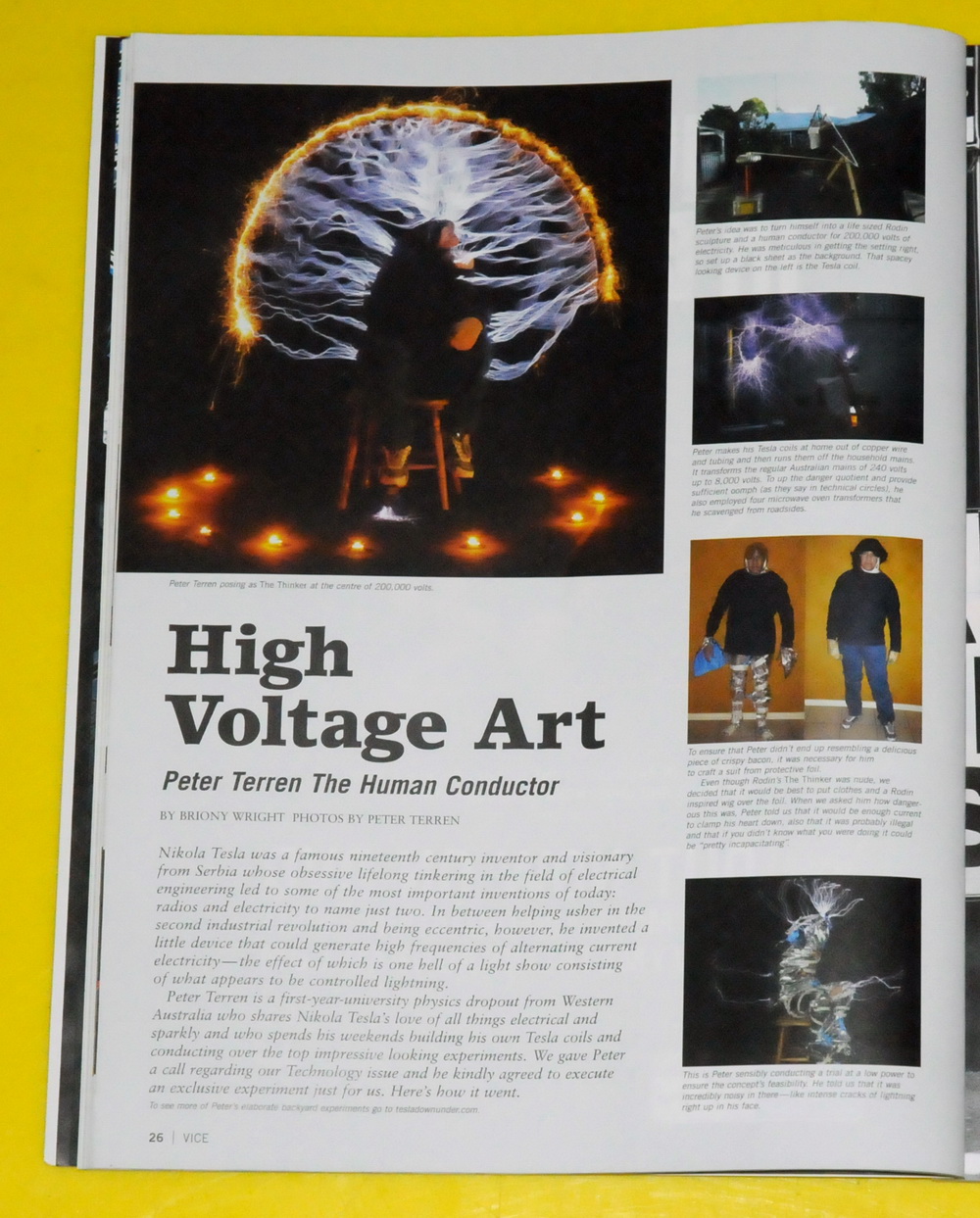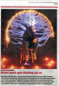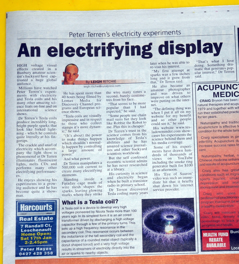 Feb 3, 2011. Engineering website requesting use of photos. Pending Jan 30, 2011. Evokke iPad magazine interview. Pending. Jan 27, 2011. Ripley's Believe it or not. Plans to put the Modern Thinker in the 2011 edition. Pending. Jan 26, 2011 Movie requesting Tesla effects. "Fragments of Olympus". Referred to KVA effects. Jan 24, 2011 Brazilian Textbook seeks Thinker picture. Pending. Jan 23 2011. Scitech promotion with a radio station using a Faraday cage that I was to make. Failed re public liability issues. Jan 20, 2011. Entered my ISP's contest for "Top Geek". Probably 250 entries. Didn't make it into the top 10%. Seems like a young girl who likes anime is more geeky. Sexy, yes, geeky, no. Fail. Jan 11, 2010 Applied to NASA for a project on worlds bightest flashlight. Pending. Jan 19, 2011 Commercial shoot in Sydney. Failed re too far to travel. Jan 9, 2011 German TV interview Redaktion Explosiv. Failure re making myself too expensive. Dec 1, 2010. Christmas pageant entry with my bike failed due to public liability issues for God's sake! Bunbury Council have officious bureaucrats. Last laugh - my bike was on national TV and they weren't. Nov 28 2010. Applications for Guinness World Records for Flashlight and Bike lights. Pending. Nov 26 2010 Chinese Hunan TV in Chungsha wanted me to ship my Tesla stuff over for an interview. Failed re equipment not readily transportable. Nov 26 2010. Request to do a New Years show in Melbourne for Euchronia. Sadly, too far, too expensive. Nov 17, 2010 Russian group wanting me to do a cheap exhibit for a Russian Museum. Too cheap, too far. Nov 12, 2010 Artistic director wanted a quiet TC for the film "Iron Sky". Recommented a crackle tube. Oct 1, 2010. Barcroft media accepted videos of Bike and Flashlight but late delivery and not looked at. An expensive fail. Aug 28, 2010 South Korean TV. Did a short article on home videocam. Didn't hear if it was shown.
