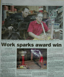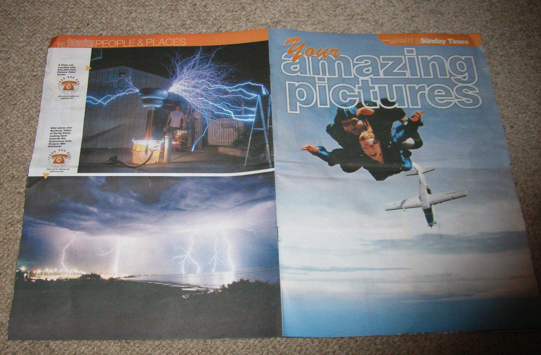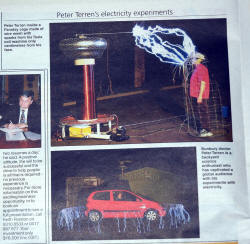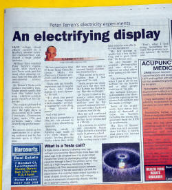 The July 1st West Australian paper page 5 article and the online article of the Tesla Expo 2011 ![]() The Post, July 16 page 30 on the Tesla Expo 2011. (circ 32,000). Online version here (32MB) Above, is the Metro newspaper page 3 article in the UK , 7 Dec 2007 (1 million circulation). This is my biggest print article. A number of newspaper online editions have covered the "Electrickery" story