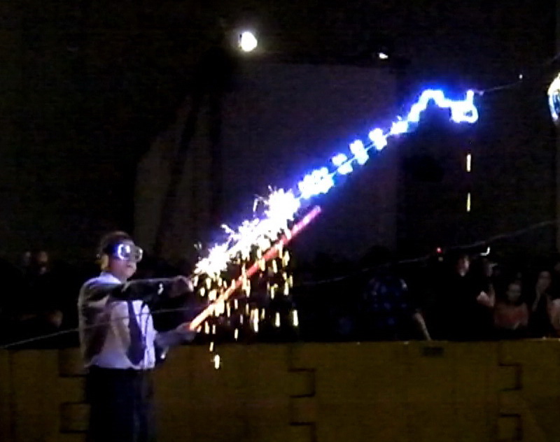 The Cosmology Gallery Opening showed my pulse capacitor bank exploding some wire to simulate the Big Bang. Also showed the mini Tesla coil in action. It appeared on other channels as well.