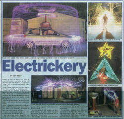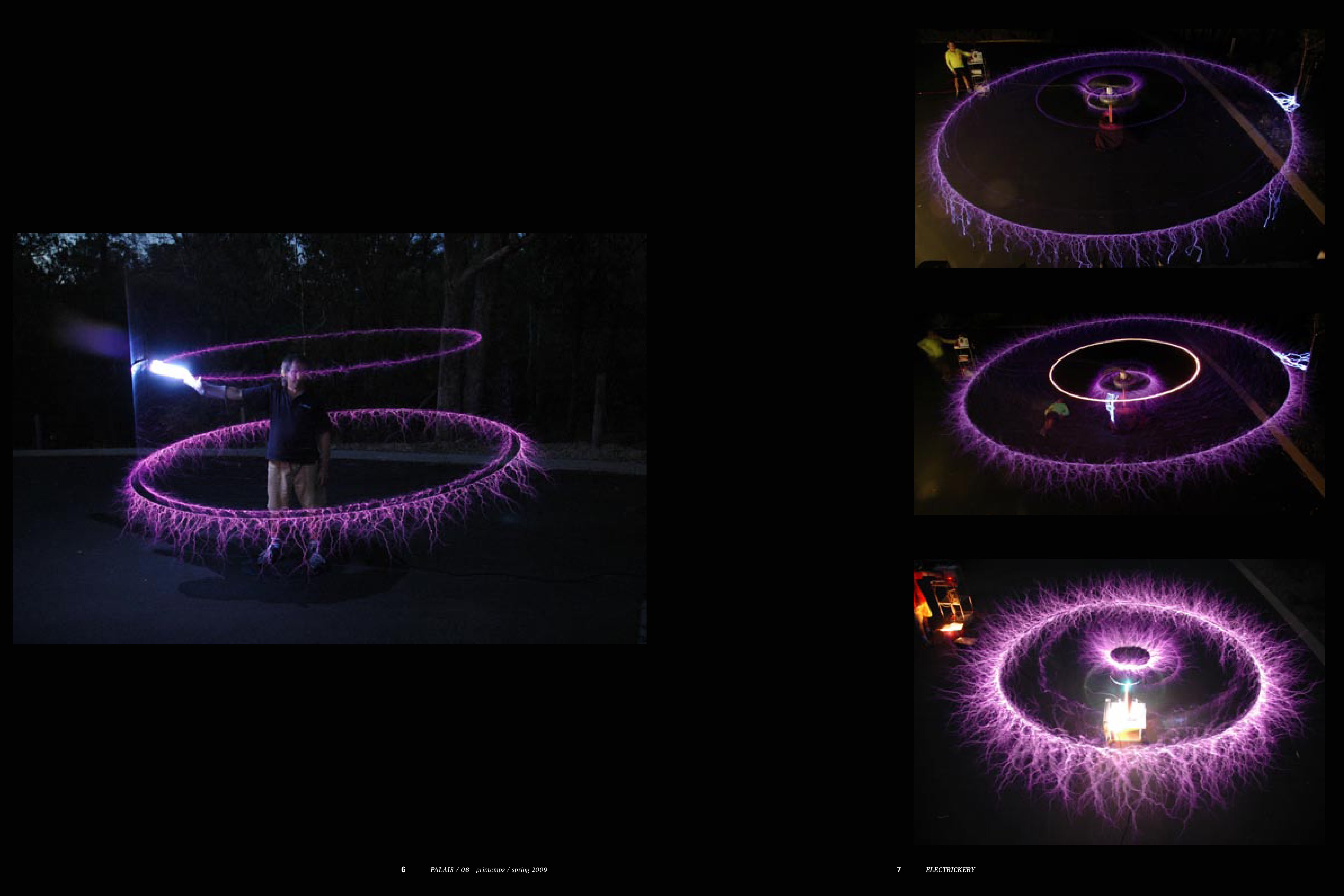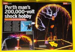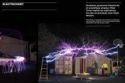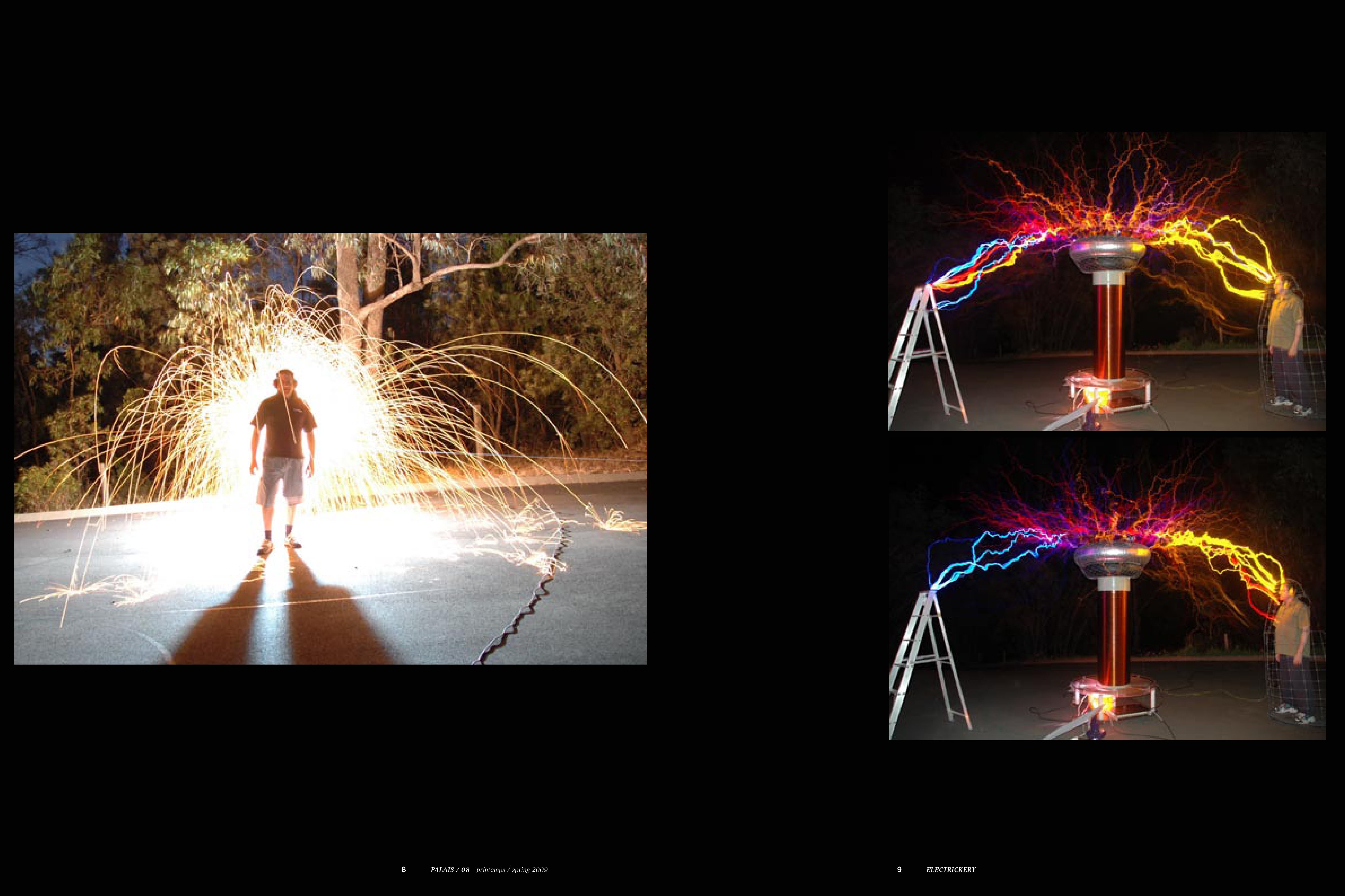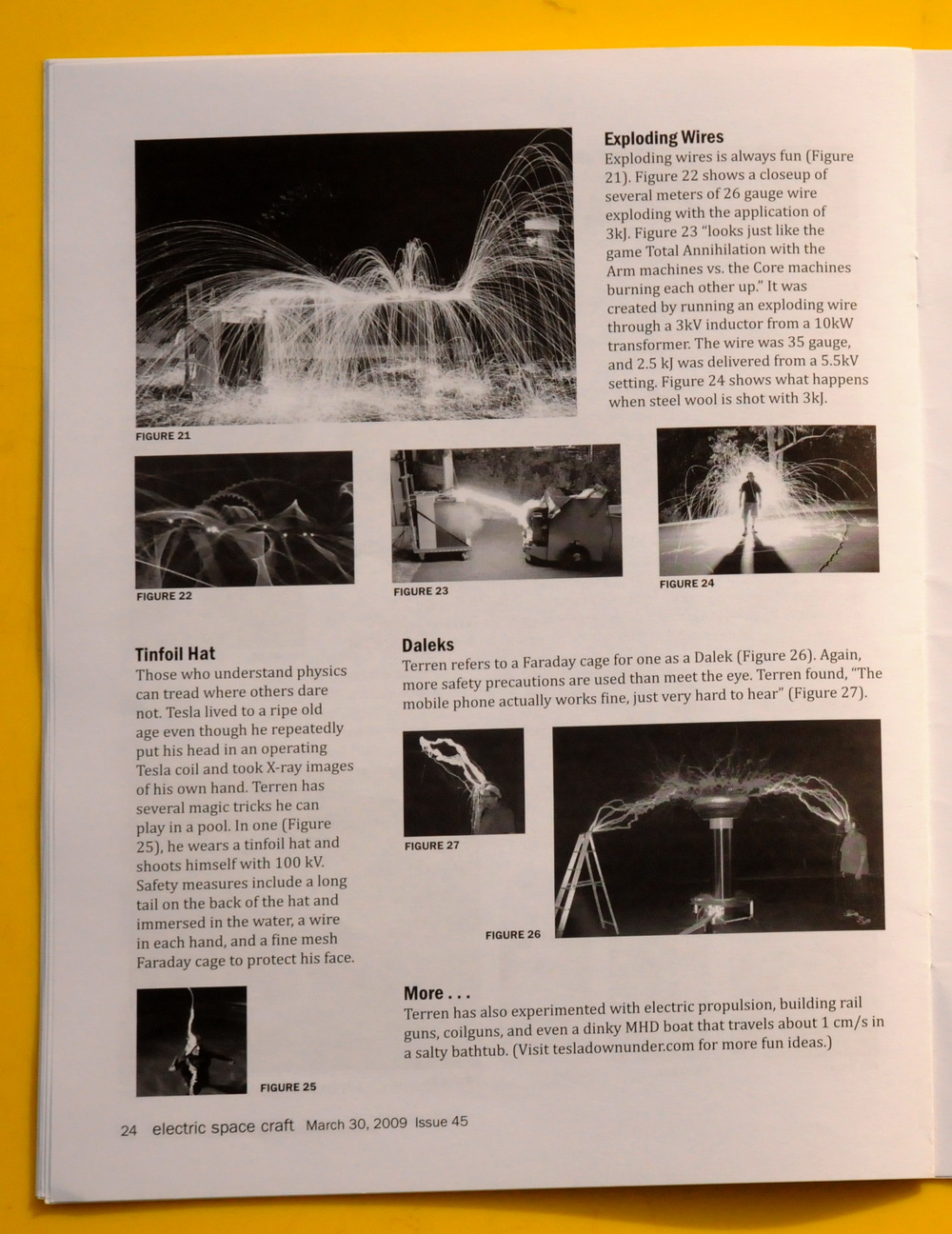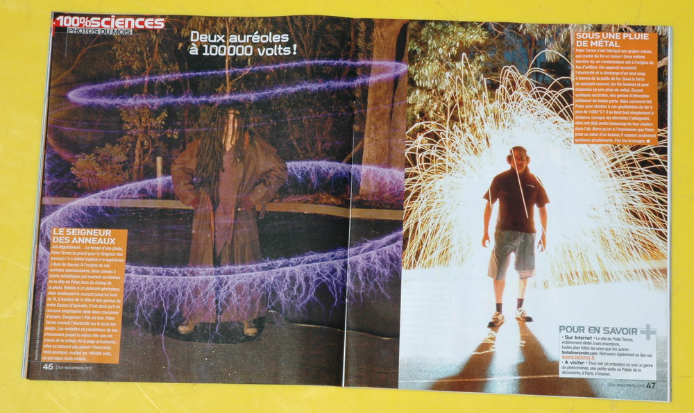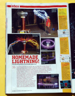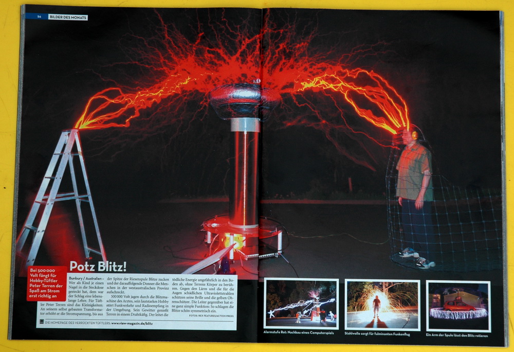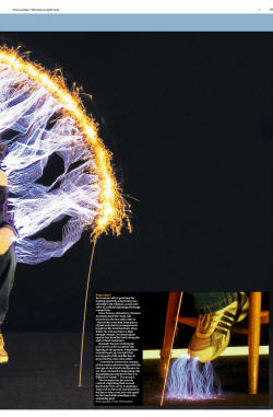 A French magazine for an exhibition, Palais de Tokyo (above) had a feature in Feb 2009. The exhibition also had a distinctive V shaped bipolar coil by Finn Hammer in an art installation. Above shows my colored sparks integrated into a fashion spread by Anka Bardeleben in Feld Hommes 2008. ![]() (click to enlarge) Above is Ripley's Believe It or Not 2010. There was one full page of my stuff (out of 256 pages). Also had my Tesla Envy video on their online link. Look out for the Modern Thinker to be in the 2011 edition.
