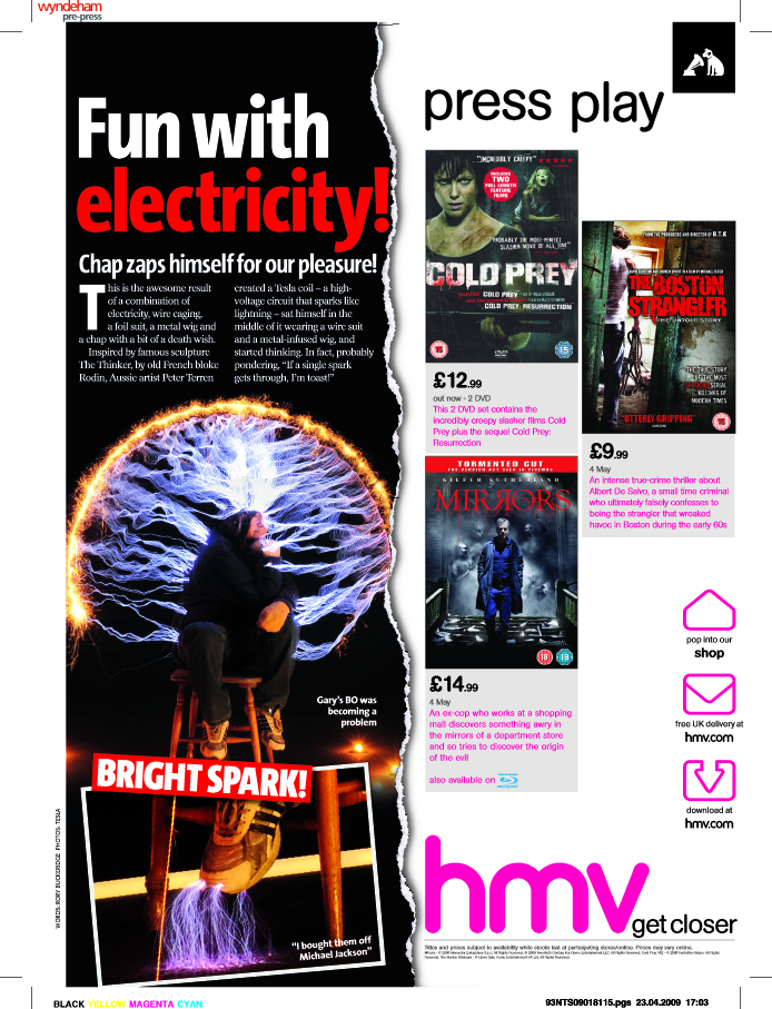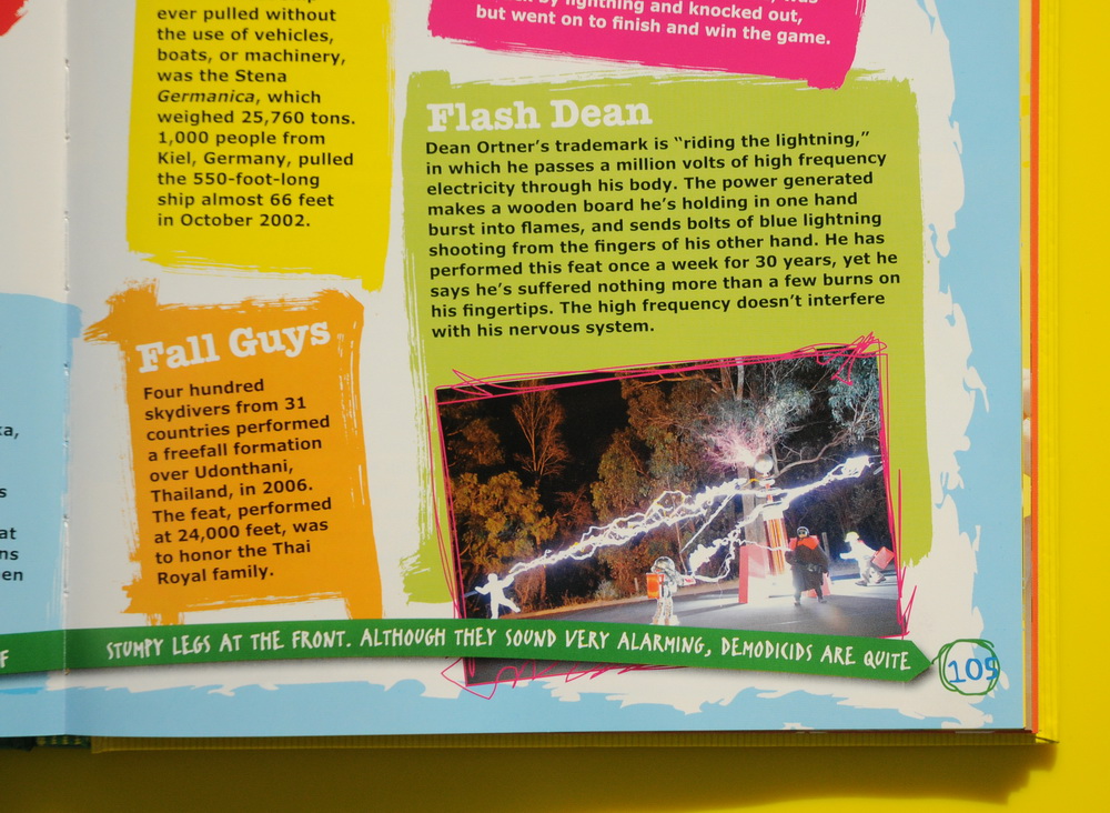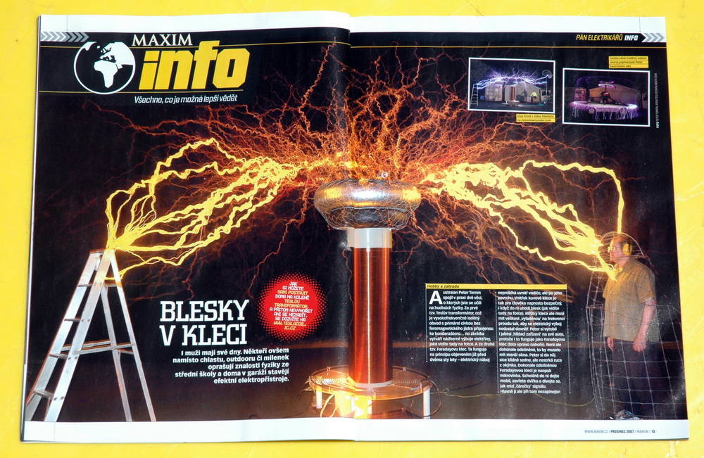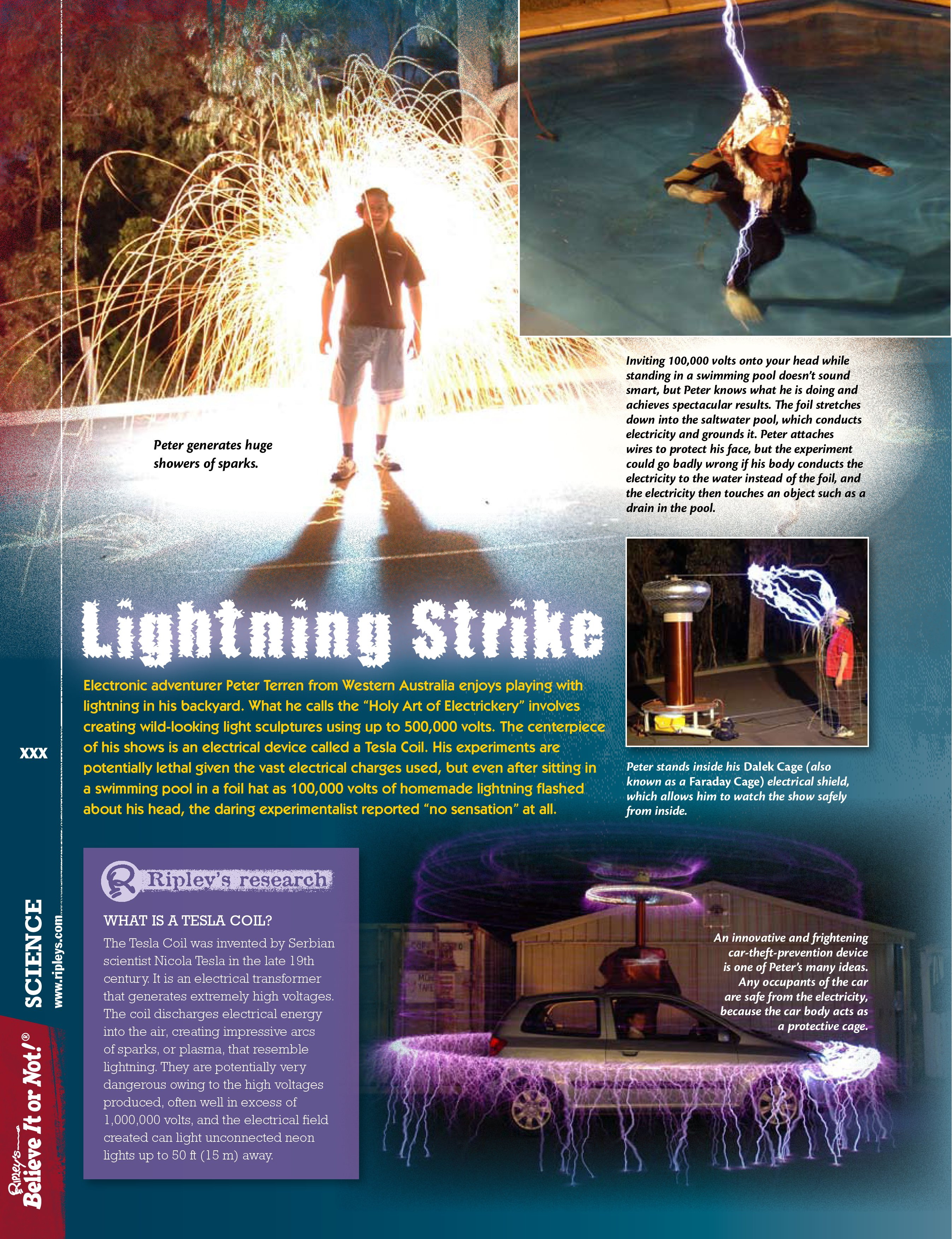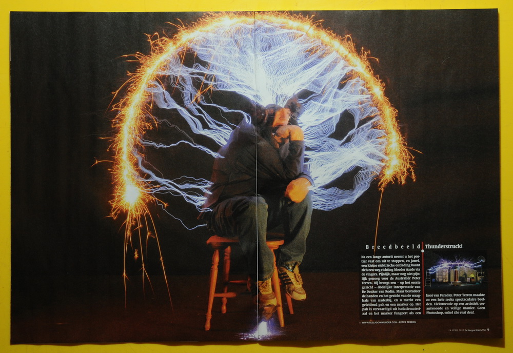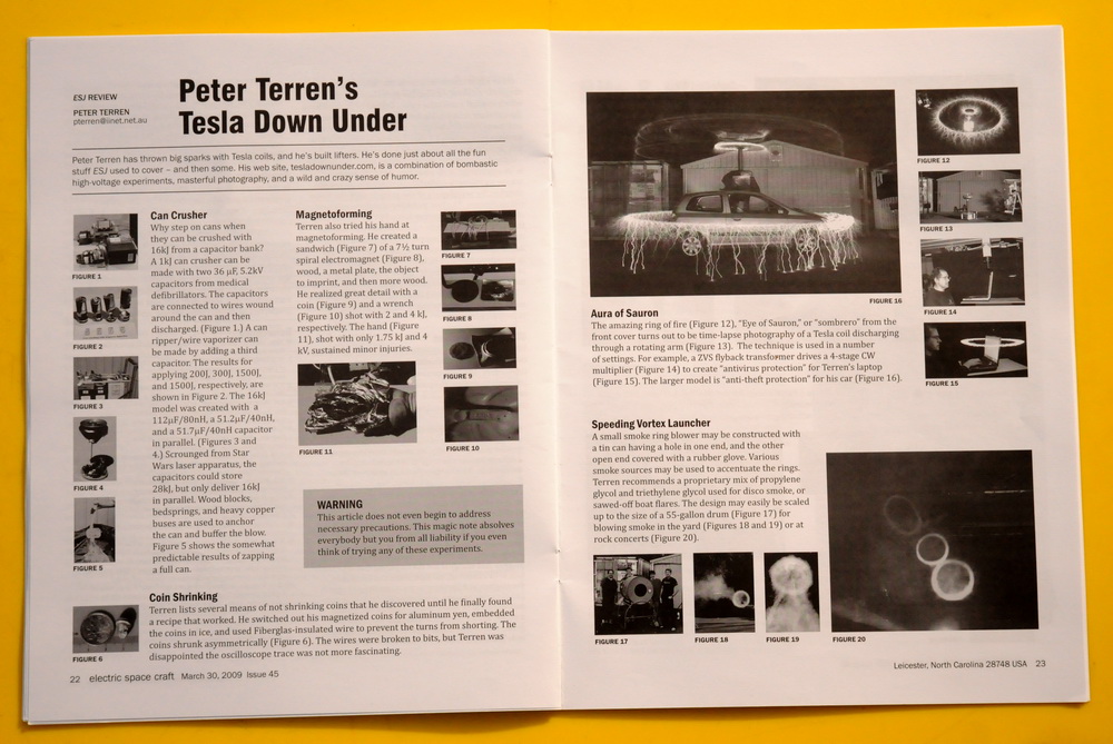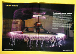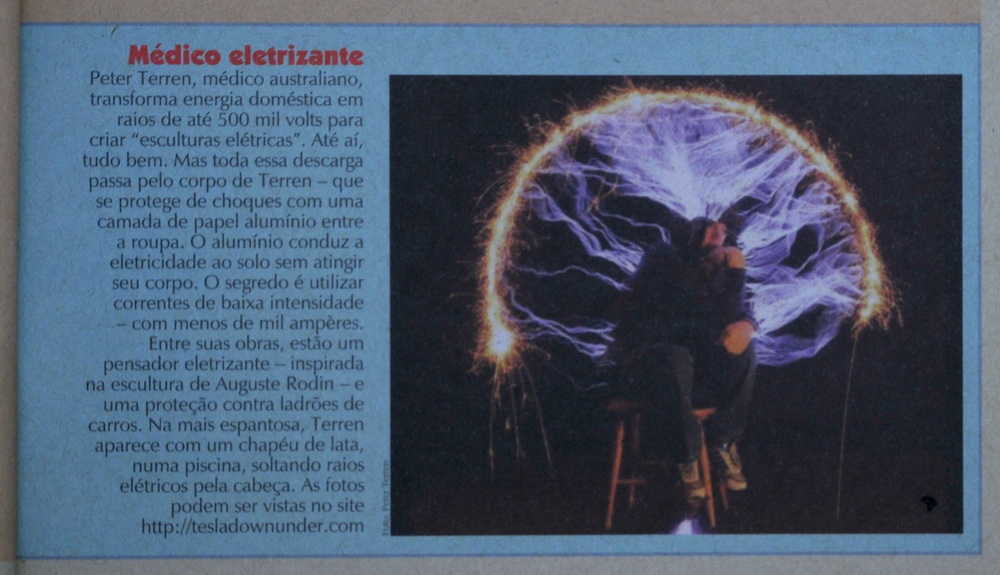 A French magazine for an exhibition, Palais de Tokyo (above) had a feature in Feb 2009. The exhibition also had a distinctive V shaped bipolar coil by Finn Hammer in an art installation. Above shows my colored sparks integrated into a fashion spread by Anka Bardeleben in Feld Hommes 2008. ![]() (click to enlarge) Above is Ripley's Believe It or Not 2010. There was one full page of my stuff (out of 256 pages). Also had my Tesla Envy video on their online link. Look out for the Modern Thinker to be in the 2011 edition.