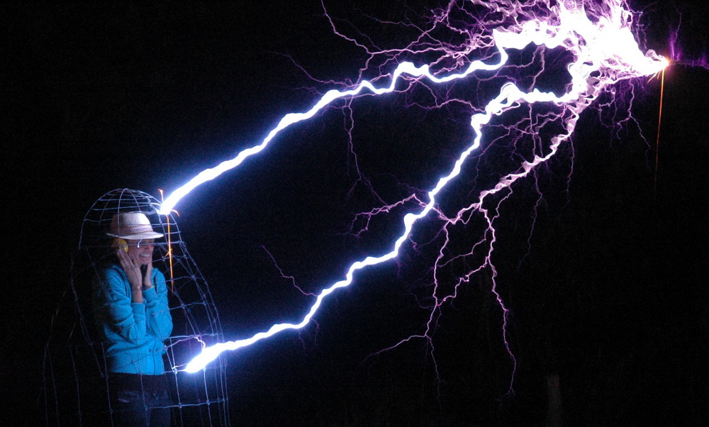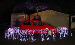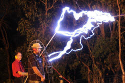 HotFM had a segment by Chippy and Nay in which the Tesla coil was one of the "12 Dares of Xmas". Above is Chippy from HotFM in the cage. I was outside gradually leading the sparks closer to him. YouTube is here.
