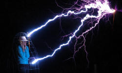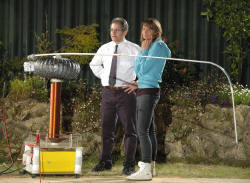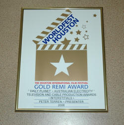 Above is the Gold Remi Award from the Houston International Film festival awarded to Discovery Channel Canada for this first video segment. Dean Lomax was the cameraman and Dennis Porter the producer. There are about 5000 entries and about 1000 winners in hundreds of categories. In this pdf winner list search for "electricity" will take you to the entry. Discovery Channel TV episode 2 shown Sept 11, 2007 in Canada. Cameraman Dean Lomax shot episode 1 and 2 in 11 hours. Runs 3:45 mins and includes capacitor discharges, big TC construction. If you have a fast broadband link then view it direct in higher resolution from the Discovery Channel here otherwise click the video below.
