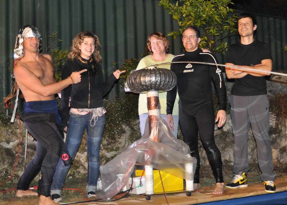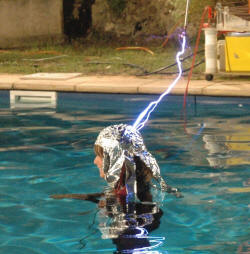 The Canadian Discovery Channel - Daily Planet has done 4 videos of my stuff. Nice high quality production which took about 6 hours shooting for each 5 mins. And the first one won an award. Discovery Channel TV episode 1 shown Sept 4, 2007 in Canada. Runs 5:14 mins and includes smoke rings, electric shocks, capacitor discharges and sparks in the pool. If you have a fast broadband link then view it direct in higher resolution from the Discovery Channel here otherwise click the video below.