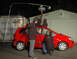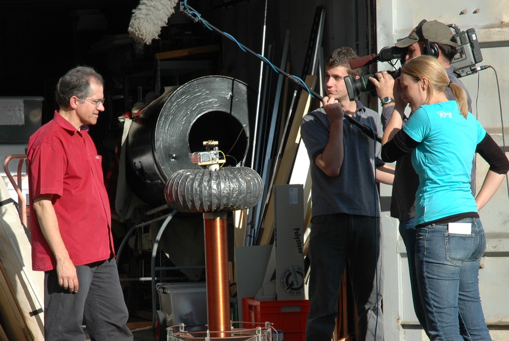 Maximus Film Germany. Filmed Feb 5 2010. Screened ?April 2010 and rescreened Sept 1 2010. Two segments, one of which is about crazy inventors. Director was Susanne Bogner, camera by Oliver and host was Harro. Topics included the mini-coil, exploding watermelons, the Faraday cage and the swimming pool. It includes a test with a sparks onto a dummy in Germany. Also some 3d computer graphics showing me moving my arm to show current flows. Very clever. Video runs 14 mins.