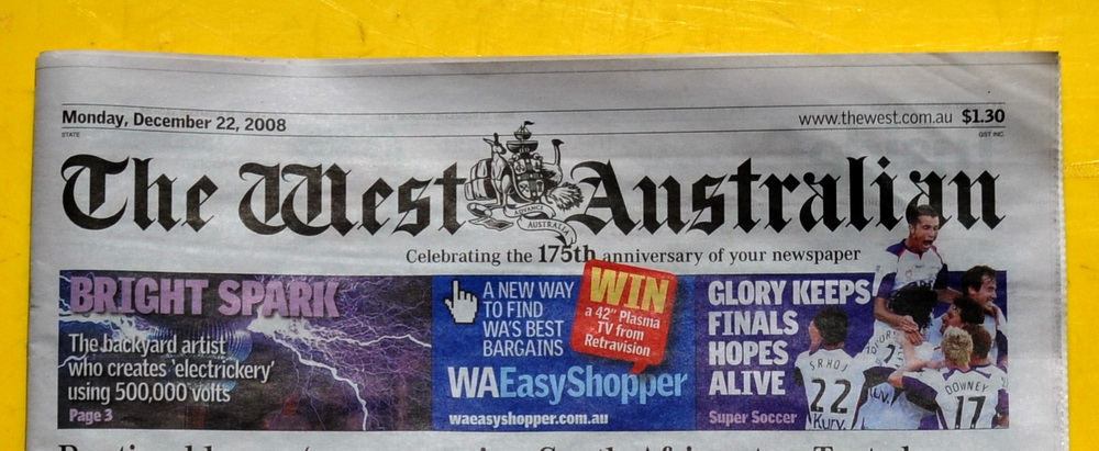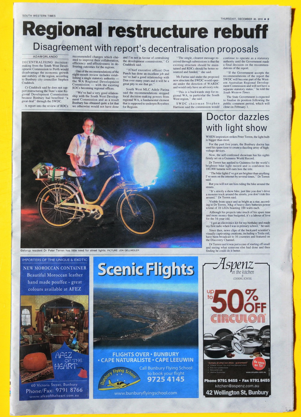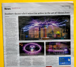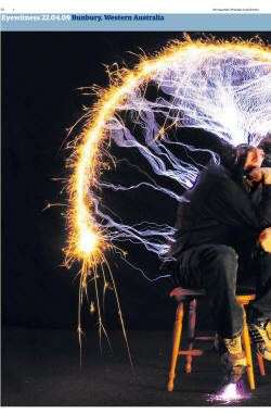 A Finnish Astronomy magazine, above used one of my twilight shots to demonstrate a crescent moon. My Comet McNaught photo made it to the front cover of the Chinese Astronomical Journal (top left), International Comet Quarterly (top right, bottom right) and to page 3 of our local paper (bottom left). Hey, my photos are in 3 astronomical journals and I don't even have a telescope. Other magazines have featured photos and articles including Australian Medicine magazine May 2003 and Jafmate. Some that didn't make it include Shanghai morning post, the Sun, Trader monthly (went broke), The SouthWest Times did an article on 30th December 2010 for the World's Brightest Bike Light. This is one of the only photo shopped images on my site (done by the paper not me). To remove the lens flare over my trouser area and to tighten the beam. I use it as an example as it is clearly apparent even on a photo of the print article. Did I tell you I didn't like photoshop? The Electrickery article (Dec 2008) written by Asher Moses went on to stimulate many other online, print and TV news clips. Above, is the article in the West Australian newspaper (circulation 200,000) of 22/12/08 on page 3. Above, a few months later in the same West Australian newspaper (circulation 200,000 22/04/09) on the Modern Thinker page 15. Above is the Bunbury Mail (circ 25 000) Xmas article on 23/12/2009. Above, the Bunbury Mail newspaper (circ 25,000) had an article on 14/01/09. Above, the Guardian newspaper (UK circ 350,000) had this as the page 18-19 centerfold on 23 April 2009. Above, the Independent newspaper (UK circ 215,000) from 23 April 2009. Above, the Modern Thinker pic used in an advert for an Australian medical locum service 2008. The Tesla Expo 2011 was covered by Vesti which is a Serbian paper. Here is the Online version
