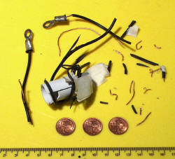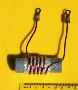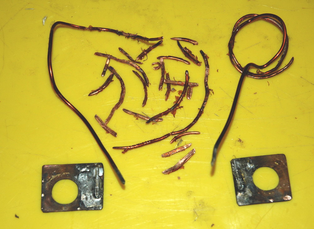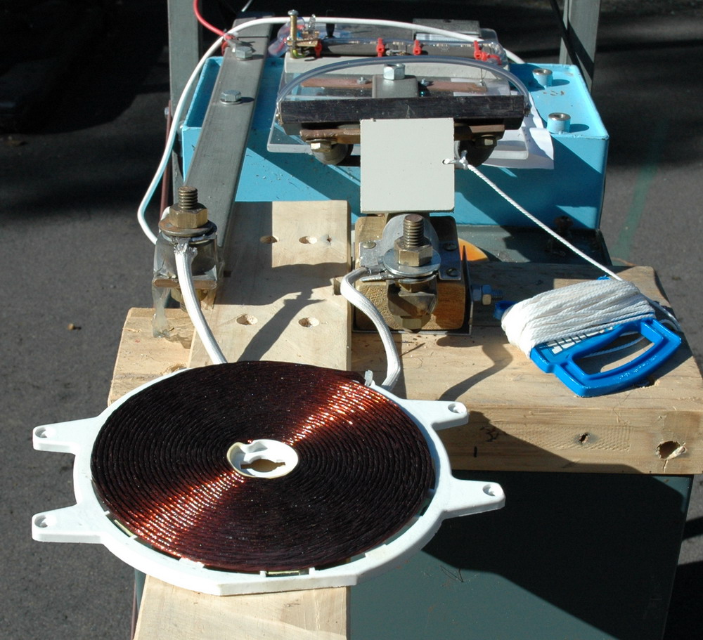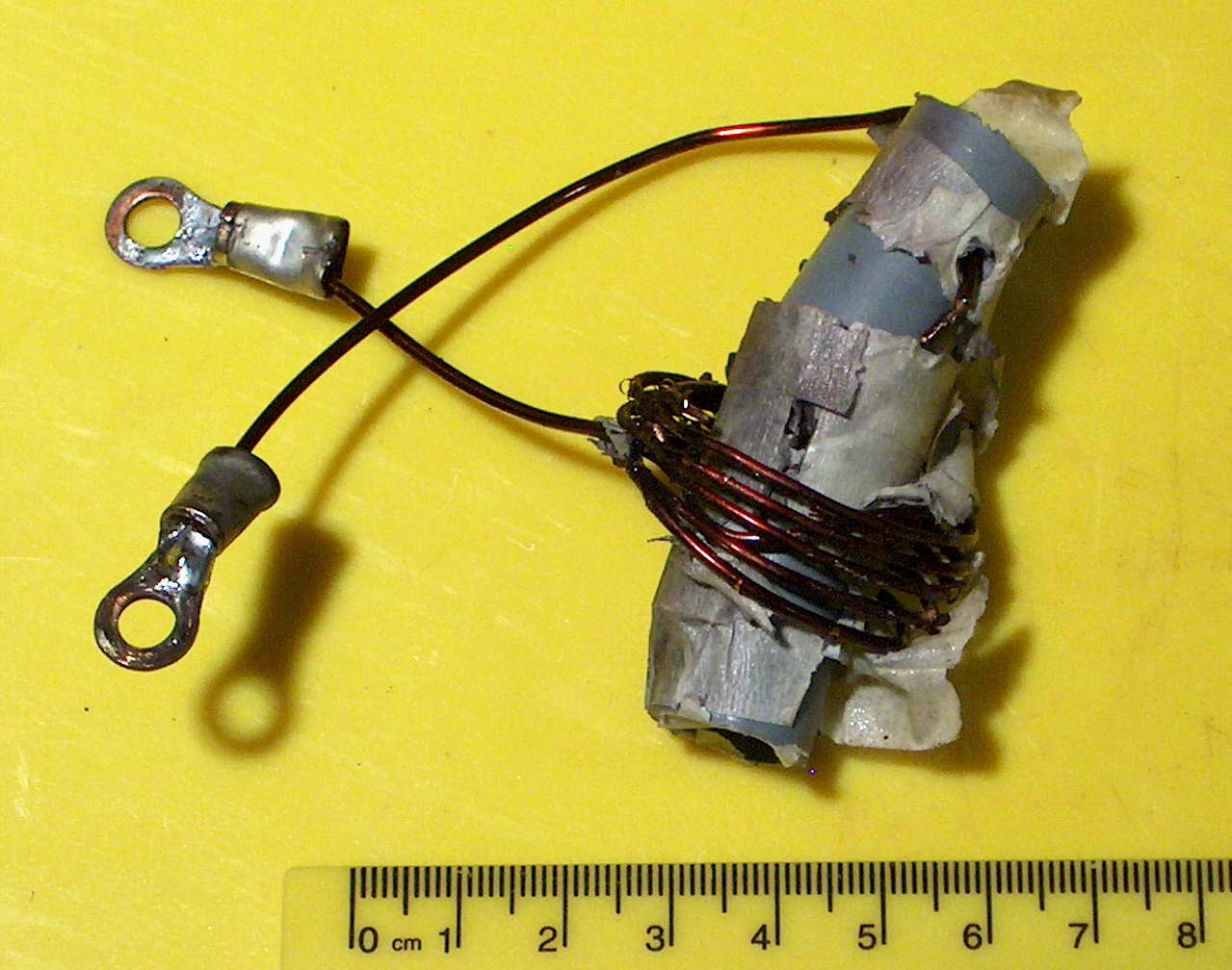 induced current and resists the effect of coin shrinking. Left photo shows the pieces that I could find of the first coil. The second coil, (centre photo) used heavier wire and a wooden surround and it still blew the wood apart and broke the wire in one part (right photo).