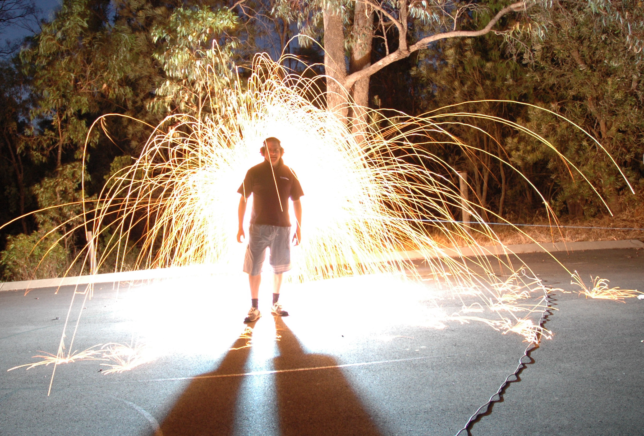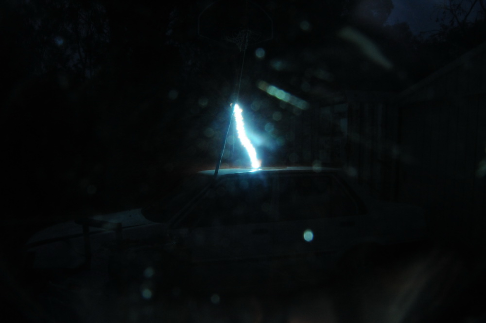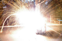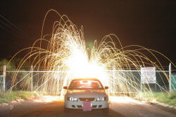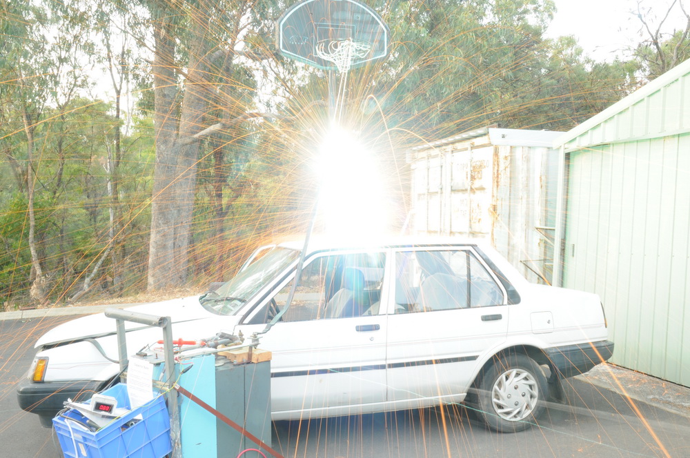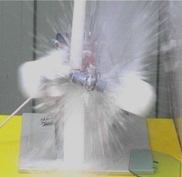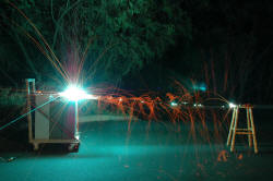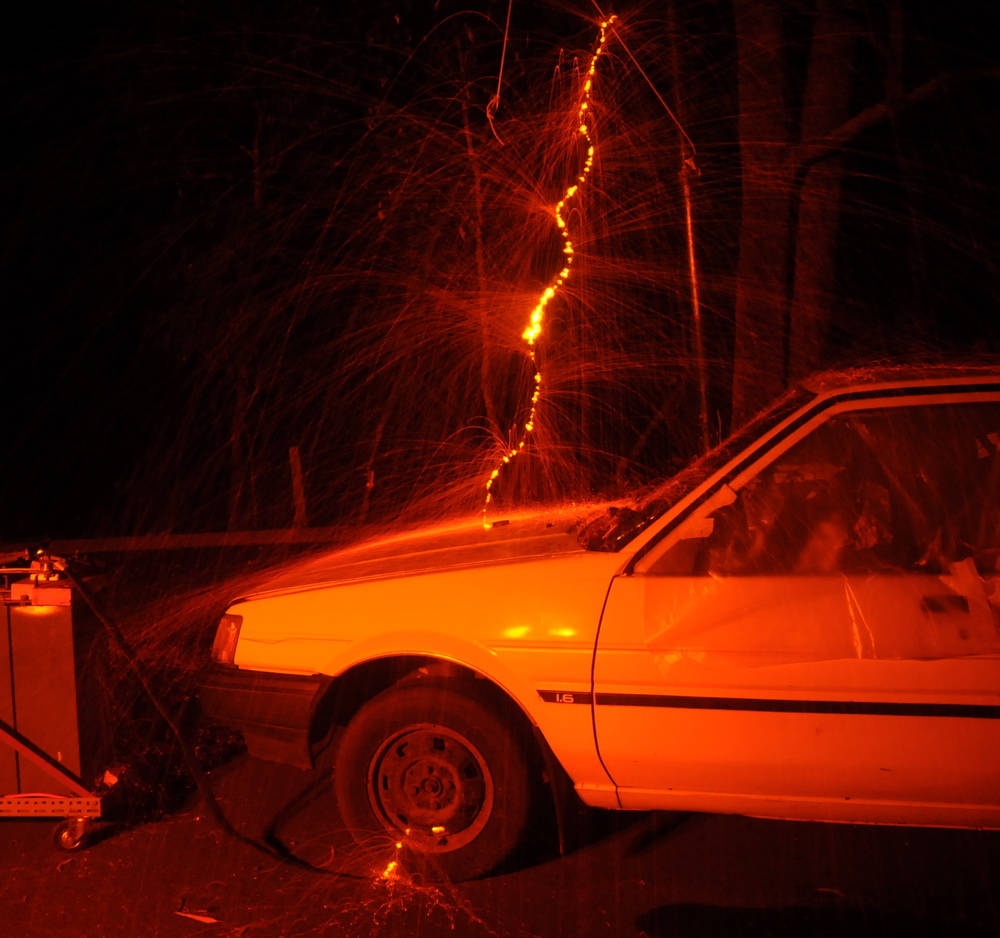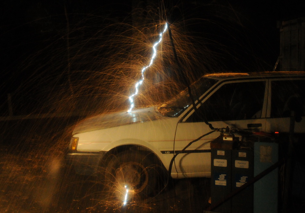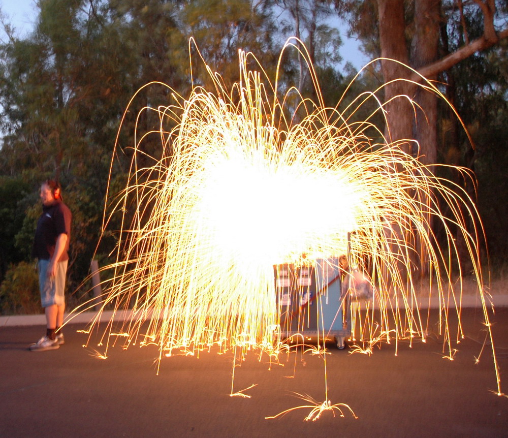 Bunny 2007 The flash and bang is huge but most of the energy is directed outwards and the damage is surprisingly small. Interestingly much of the paint is blown off the aluminum foil. The explosion photo is taken just after sunset with a 2.5 second exposure to allow me time to pull the switch and for reasonable spark length. I had to back of the f stop to 13 to reduce total light pickup.