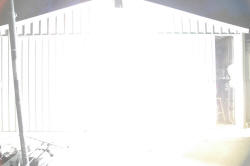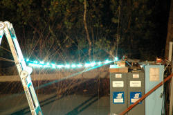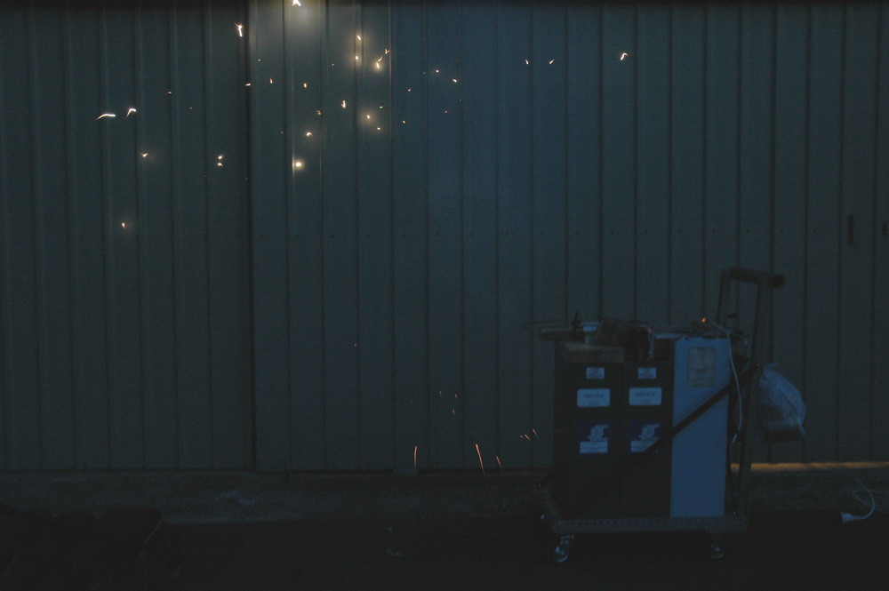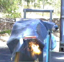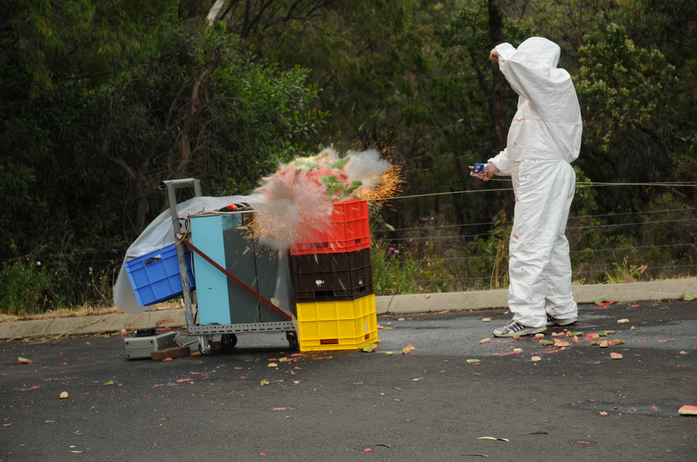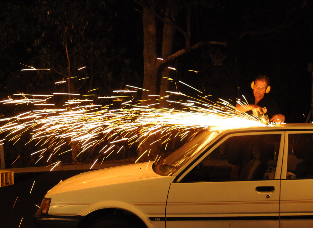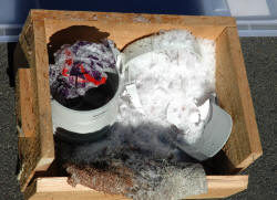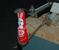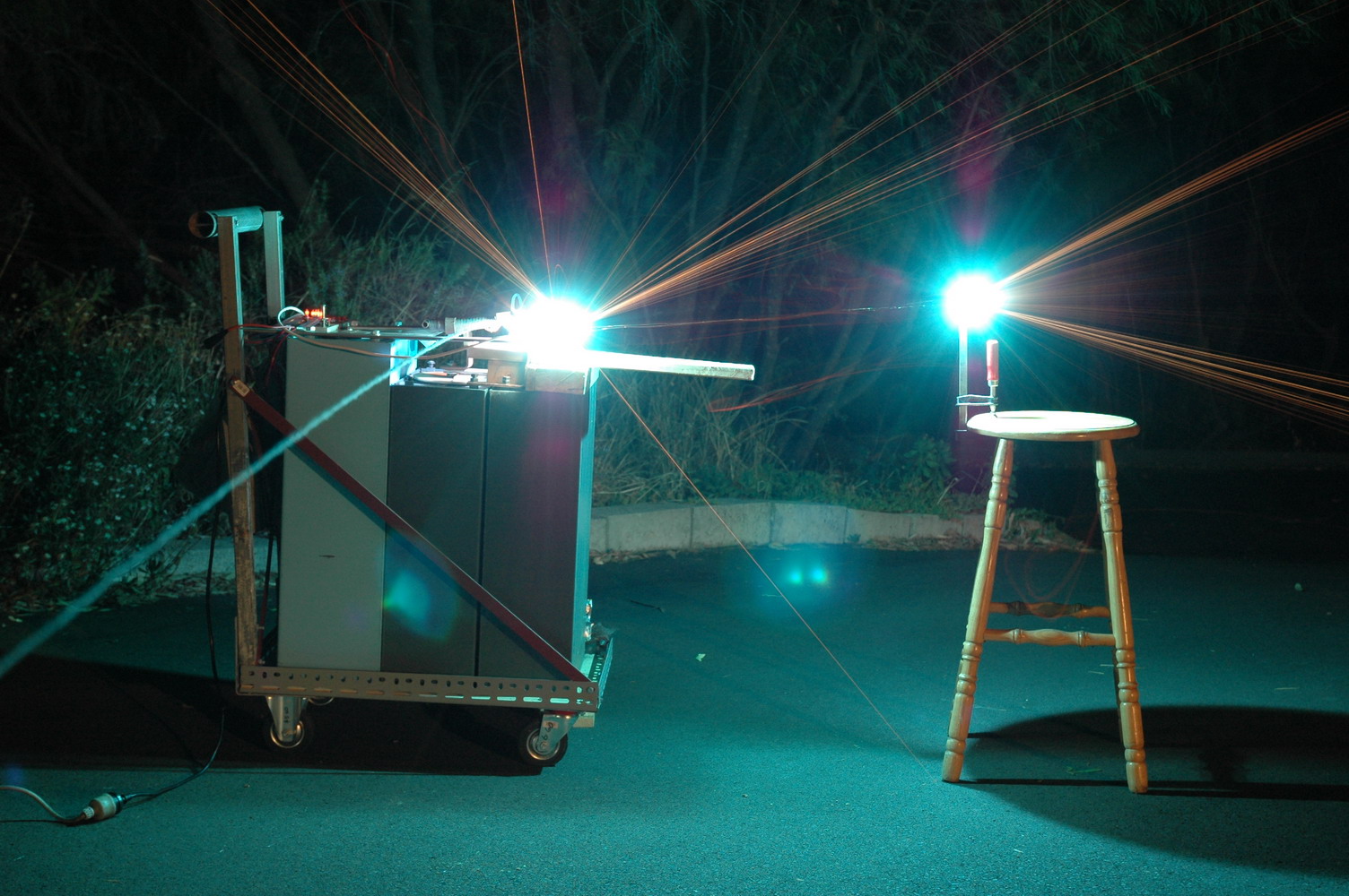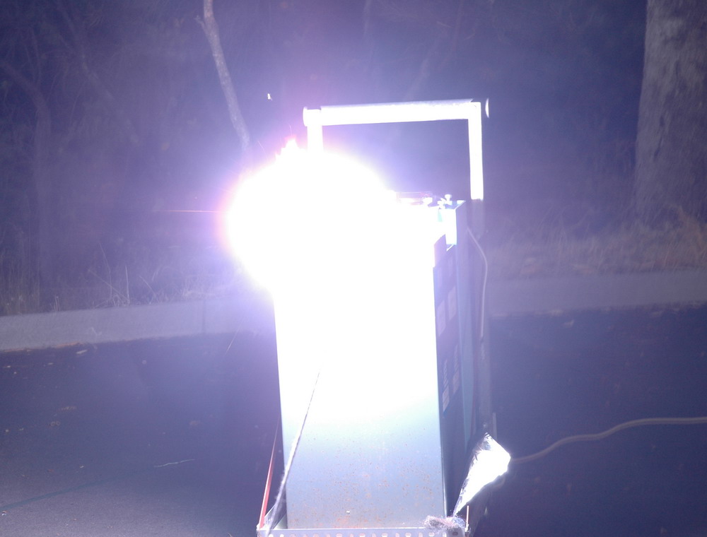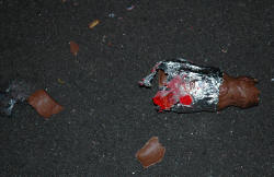 Bunny 2007 The flash and bang is huge but most of the energy is directed outwards and the damage is surprisingly small. Interestingly much of the paint is blown off the aluminum foil. The explosion photo is taken just after sunset with a 2.5 second exposure to allow me time to pull the switch and for reasonable spark length. I had to back of the f stop to 13 to reduce total light pickup.