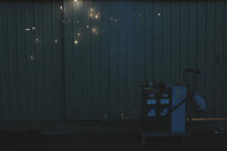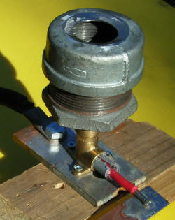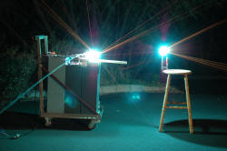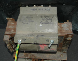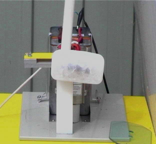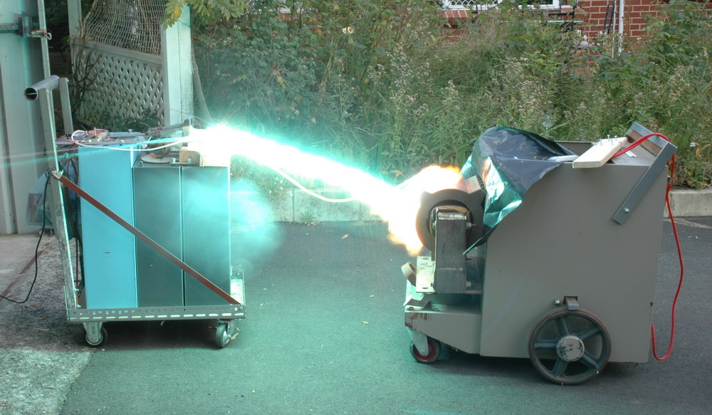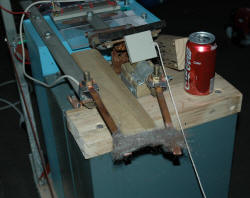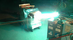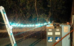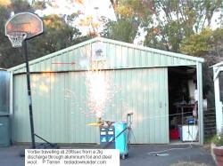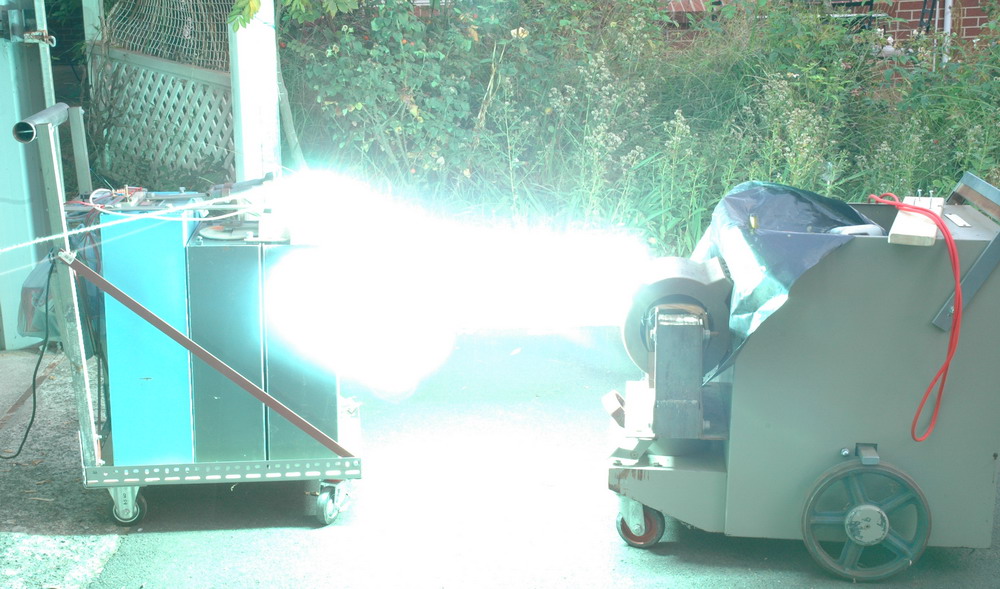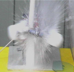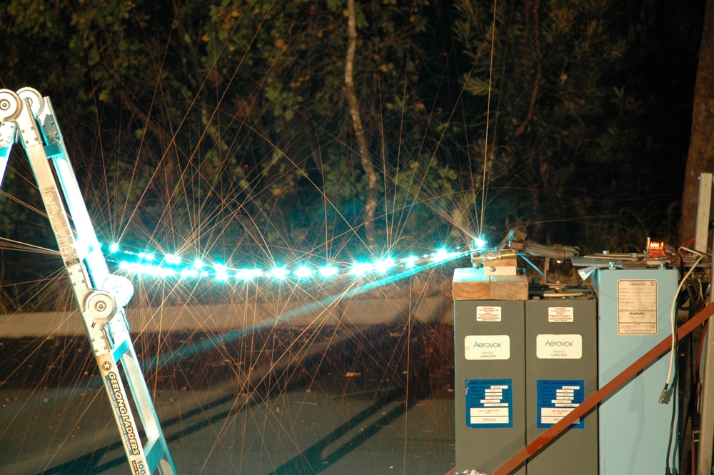 This shows exploding wire at 2 kJ of which only about 500J is used. The wire is 30 gauge and is about 3 m long. More exploding wire. The left photo above shows a 26 g wire exploding with 3 kJ. The red marks are the red hot copper wire fragments. The centre photo shows detail of the exploding wire. The right photo shows the result with 20 g wire. The left photo above looks just like the game Total Annihilation with the Arm machines vs the Core machines burning each other up. It actually is an exploding wire run through an inductor. The inductor is a 3 kV winding of a 10 kW transformer. Wire is 35 G and power is 2.5 kJ at 5.5 kV. Look at the right "machine" which is just a 100 kV mobile x-ray supply which is also supporting the unrelated transformer. The flash seems to envelop the transformer. I wonder if this is due to the magnetic fields as it is not present on a shot without the inductor but arising from the same spot. The centre photo shows a different view of the same flash enveloping the transformer. The right photo shows the transformer close up with the epoxy encased secondary. Above photo shows the 2.5 kJ shot using the same 35 G wire but without the inductor. The flash and bang is much greater. Above photo shows an exploding iron wire with the return path being an aluminium tube. Looks good in high resolution. Another wire exploding site from Bob LaPointe.