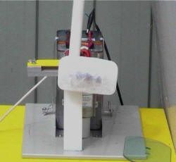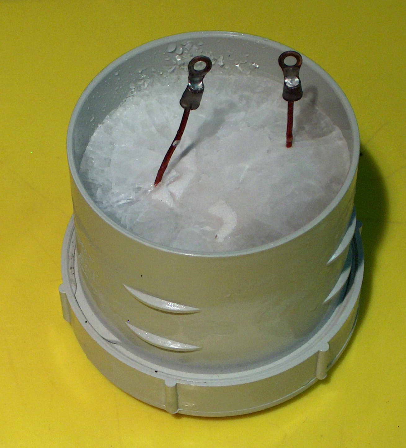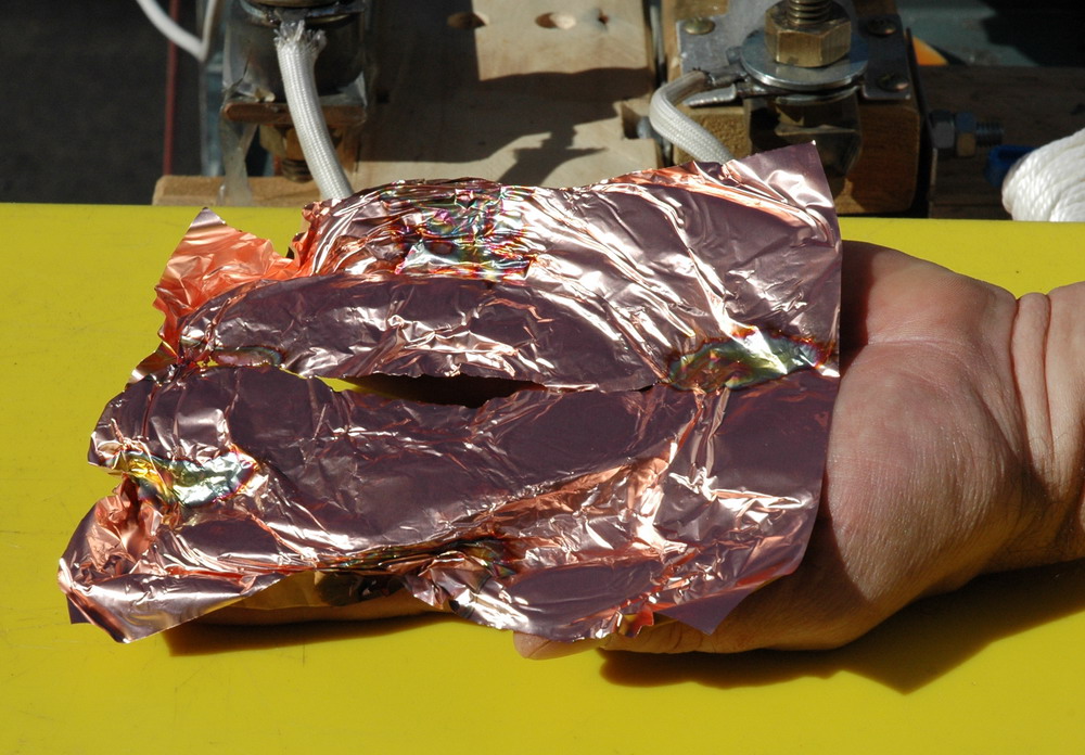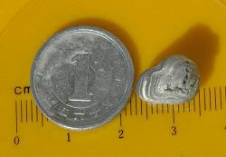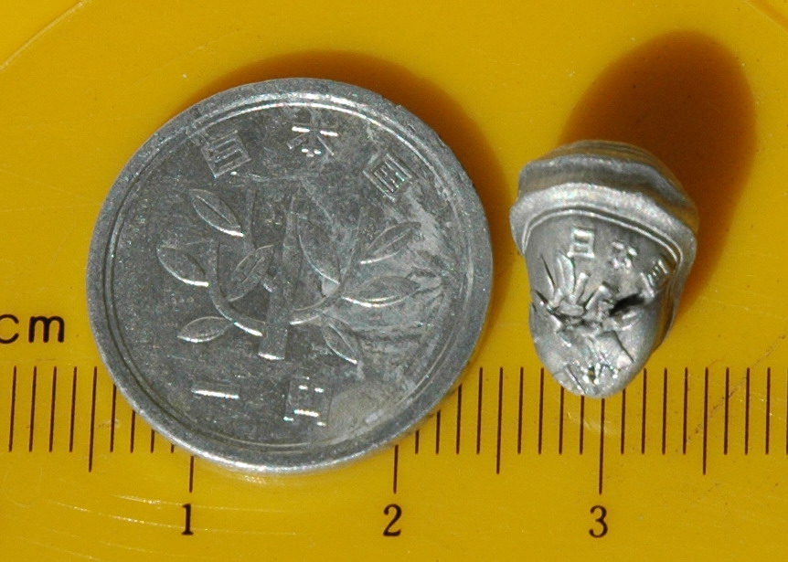 shrinking results 2006 The left photo shows the ice was shattered as were all the PVC components and a panel was broken off the box. It wasn't that loud using hearing protection and much less than an exploding wire. The right photo shows the wire fragments. Interesting how one part of the coil is almost unscathed apart from doubling its diameter where the other half is fractured, compressed and in pieces. The left photo shows the coin shrunk to 50% of the former diameter of 20 mm. It is now 10 mm x 14 mm. The coin was a little unsupported on one side so I expected a bit of a lopsided result. It is interesting trying to see the corresponding detail of the Japanese characters. The right photo shows the numeral 1 which looks like it is fracturing out.
