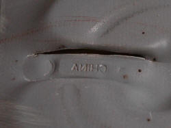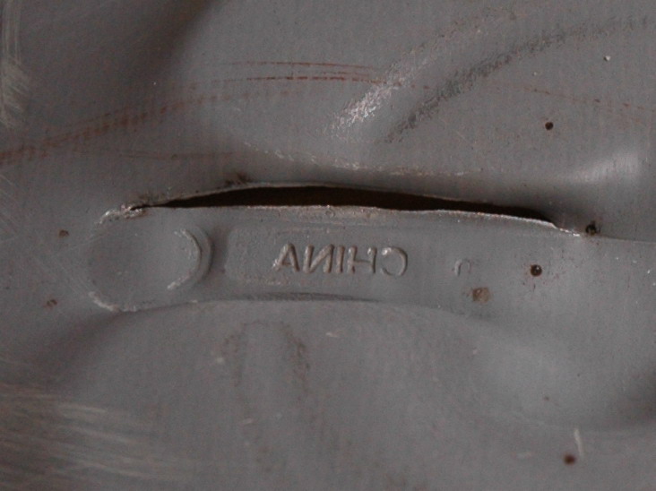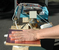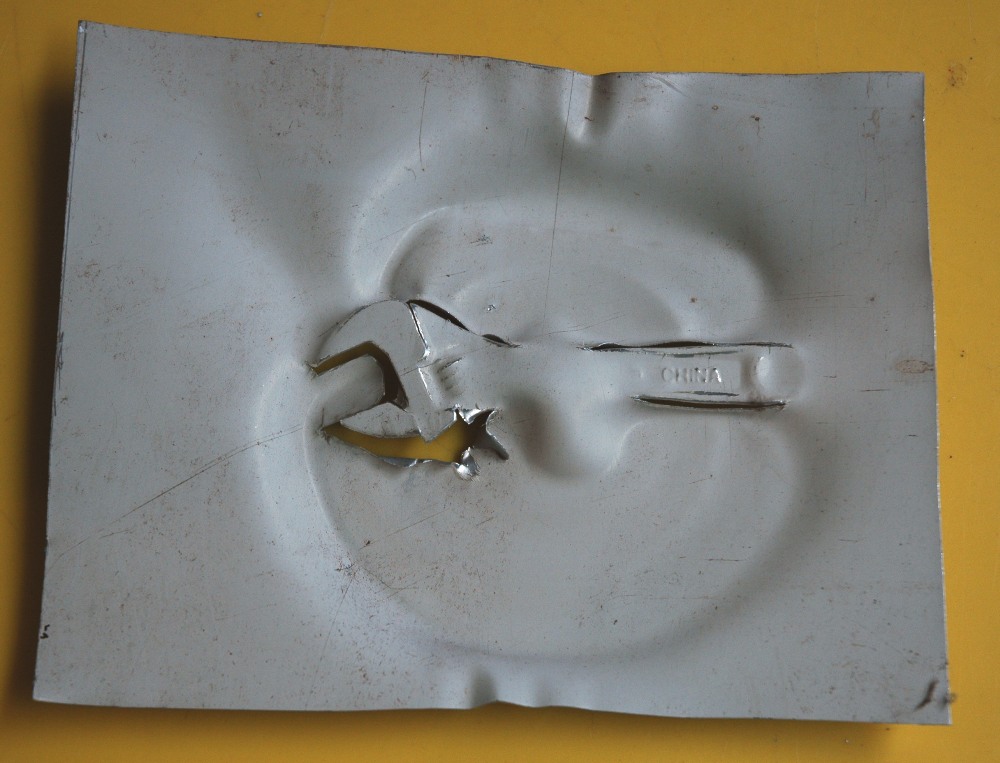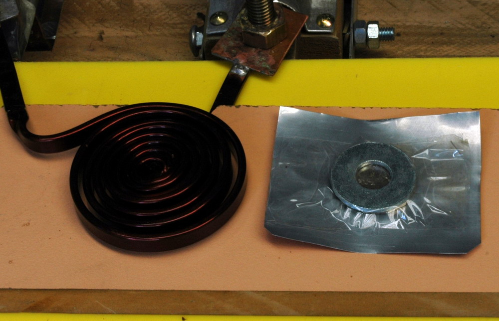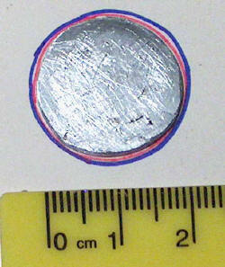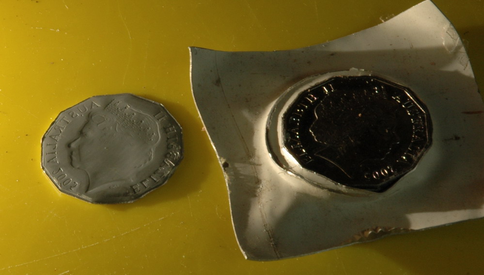 Jan 2006. This is the result of a 4 kJ shot with a mini wrench above the aluminum, which leaves a sharp impression except in the centre where the work coil does not cover. The level of detail can be seen in the reversed "China" label. The left photo above shows the rewound work coil 7 1/2 turns with much less dead space in the centre. Next to it is the 50 cent coin covered by a large magnetic washer to provide down force against the up force of the aluminium. The middle photo shows the setup lashed together. The right photo shows the latest coin shot at 2 kJ. An Australian 50 cent coin is neatly cut off and imprinted in reverse. And now for some body part magneforming.