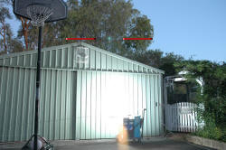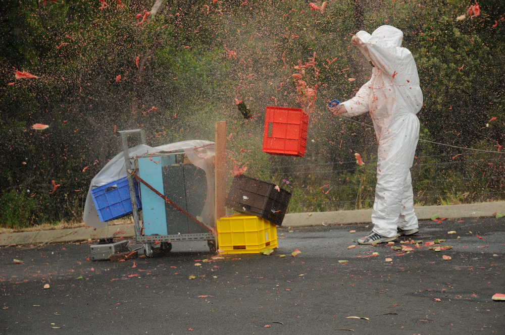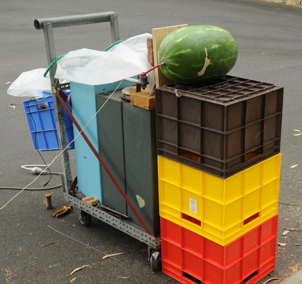 Each photo in the animated sequence above is taken at 5 frames per second i.e. 0.2 seconds apart.. I am covering my face with an acrylic plate and am pulling the string to trigger the big spring loaded switch. I have looped it around the fence as the string had got wet hence conductive to the 10 kV I was using. You have to be very alert re safety, particularly when circumstances like filming disrupt your routine. The first shot above shows the moment just after power is applied and it is likely the capacitors have dissipated all their charge already. The iron wire has melted and tiny droplets of liquid iron (the orange spray) have sprayed out the ends along with a puff of grey smoke. Note that an AK47 bullet has about 2kJ of energy and the power used here is 10 kJ. The fine iron wire is soldered on to a thin steel rod which is pushed through the watermelon then cut off. The connection looks dodgy for 100 kA doesn't it. It really just needs to be the seed for a lightning like bolt to form which will dissipate the energy within the watermelon as a sudden pressure wave.