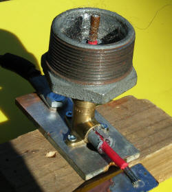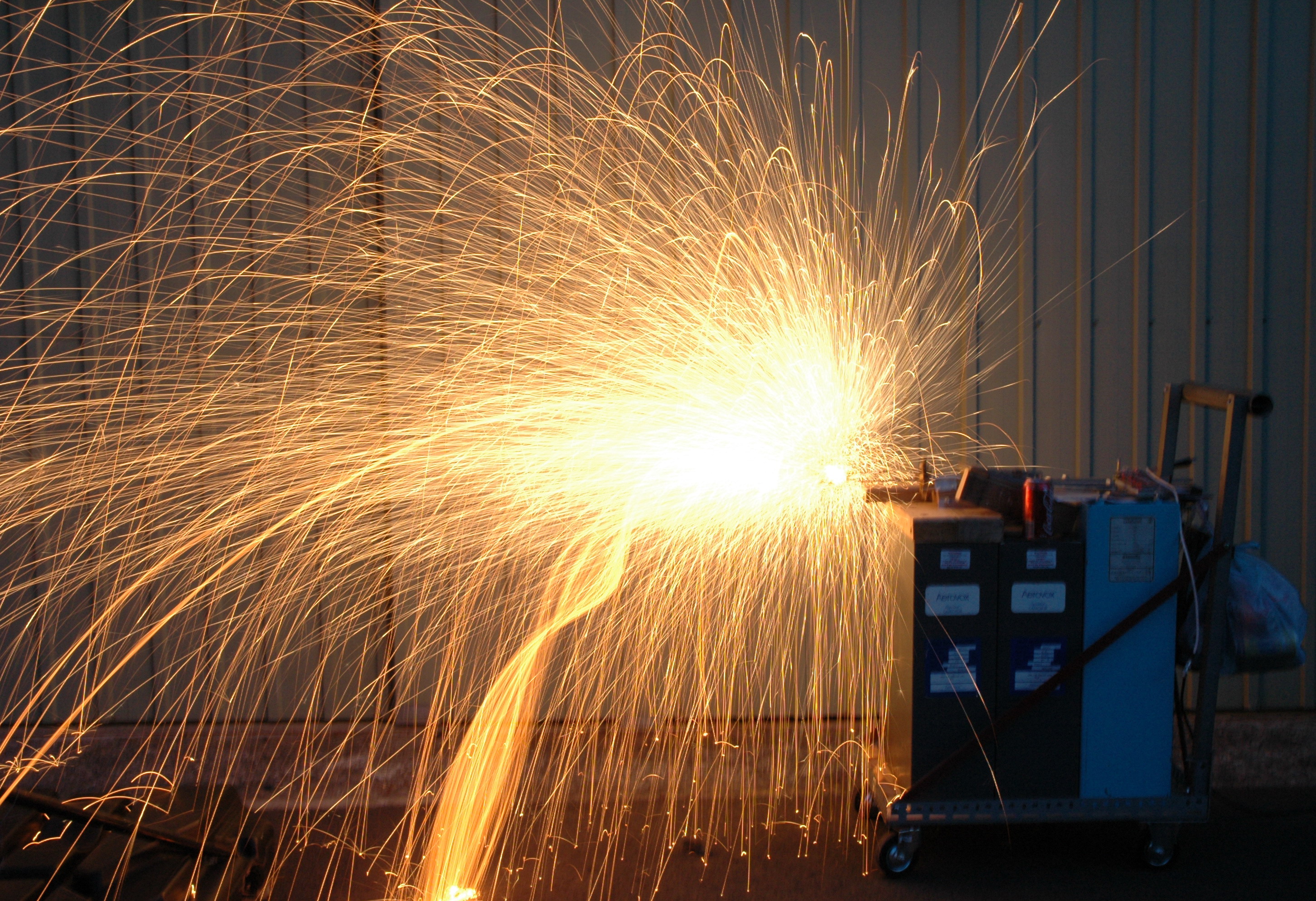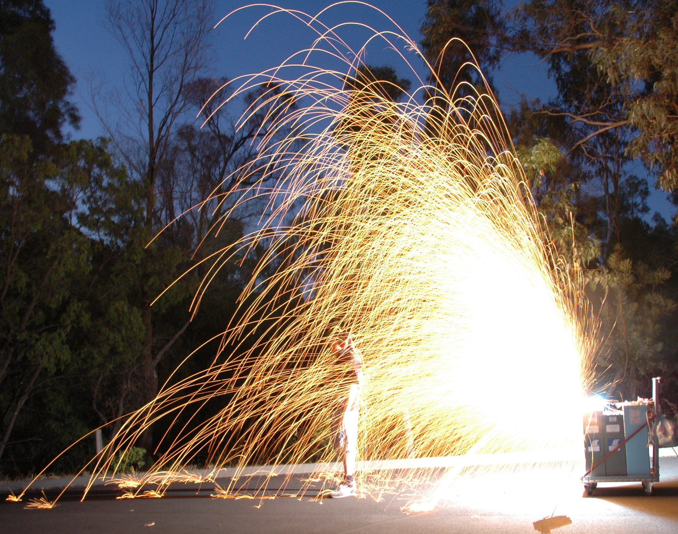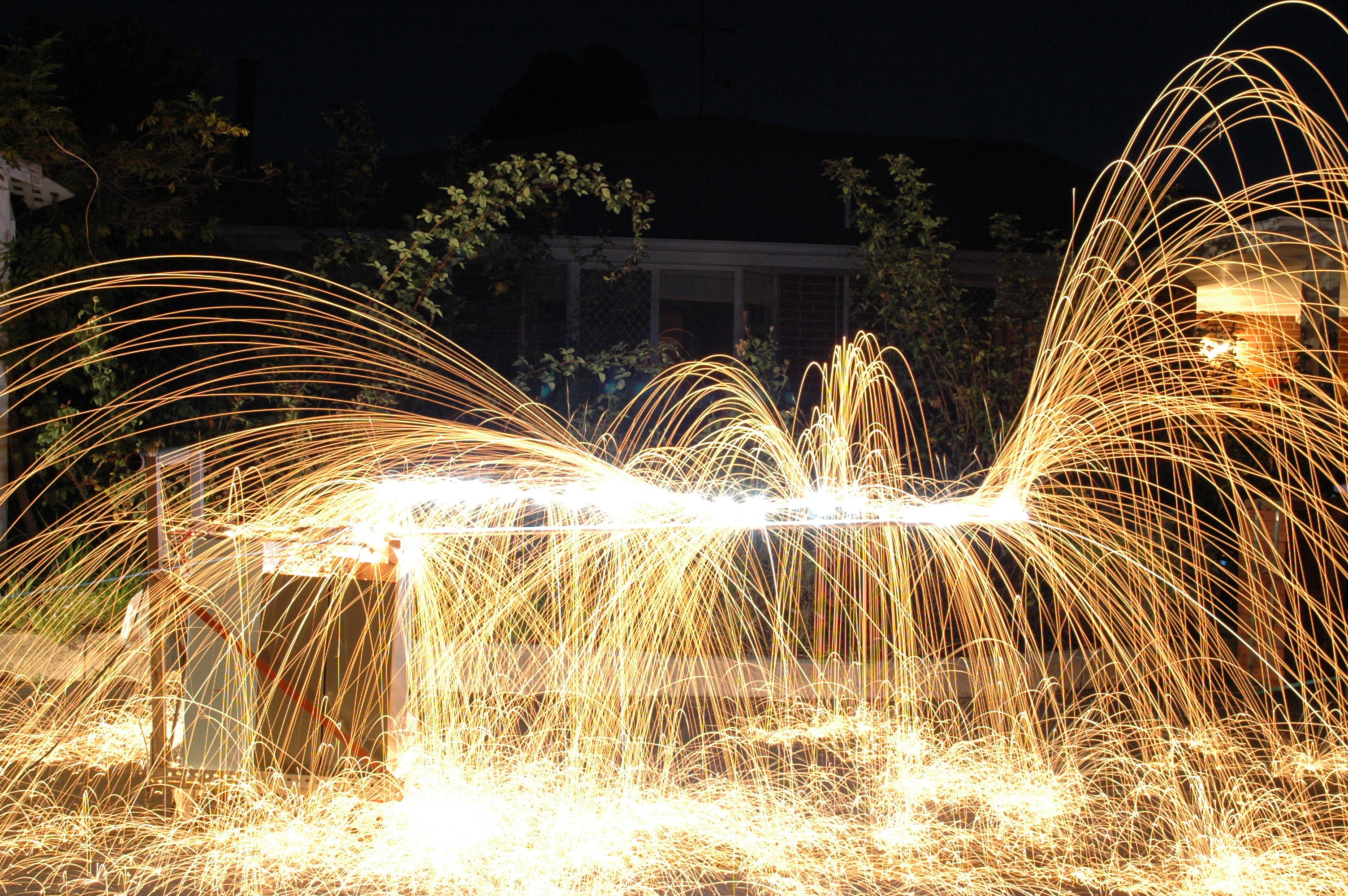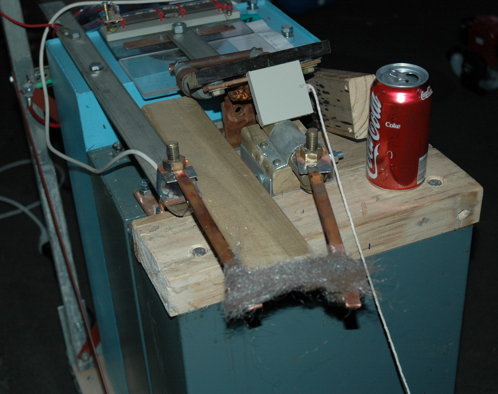 Left photo shows a small skein of steel wool (used as an abrasive cleaner) placed across the electrodes and fired at 2 kJ. The high resolution photo is nearly 2 MB but has lots of fine detail of the shower of sparks and is a nice desktop photo. The right photo shows the setup.