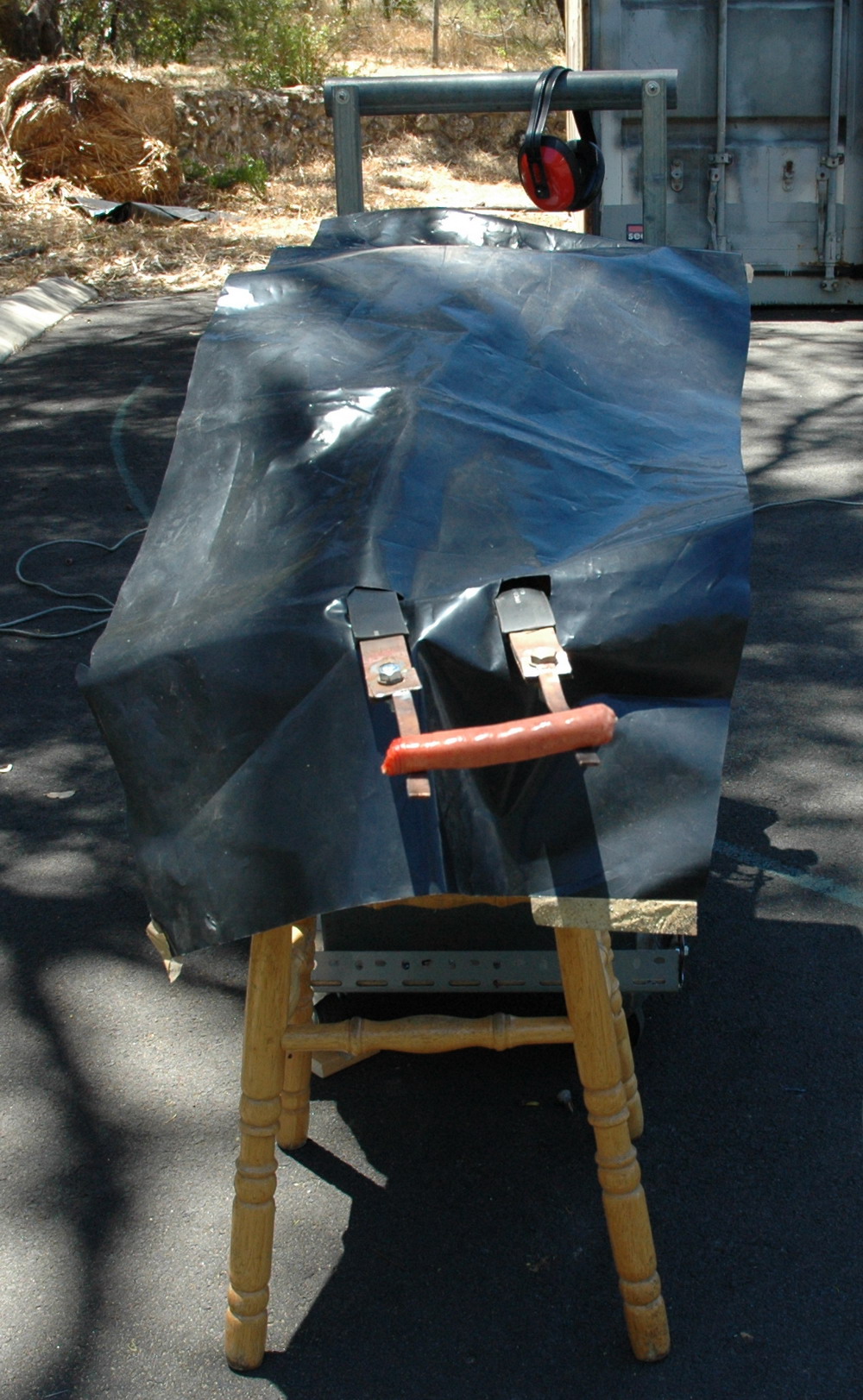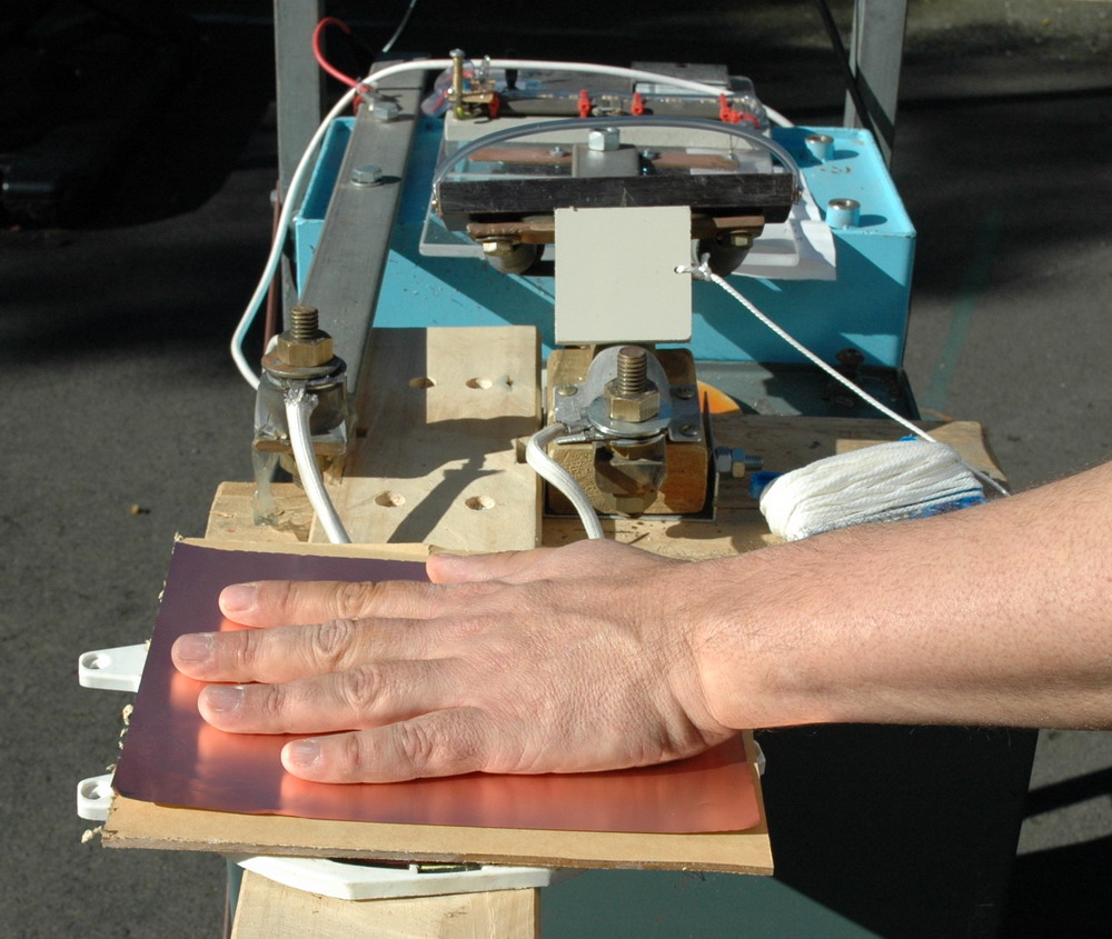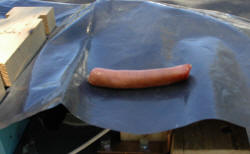 A series of 3 kJ shots with steel wool with me in the picture. I have a cap and earmuffs as safety gear but the sparkles are harmless and just tend to bounce off skin, just like angle grinder sparks. My son suggested the central front on shot to give a Terminator like look. I took it out on the trailer and took a shot at 5kJ in a local industrial driveway. Left photo shows a 4 inch strip of aluminium foil placed across the electrodes and fired at 2 kJ in a similar manner to the above. The photo is a whiteout due to the huge flash and bang. The right photo shows a mistimed shot with the burning aluminium fragments floating down after the shot. You can still see the remnants of the smoke from the shot. The left photo above shows a hot dog across the terminals . The centre photo shows the flash at 3 kJ. The right photo shows the result. There was no charring, explosions or even any marks. Why? Well, a fatty sausage (wiener / hot dog) has a resistance which is surprisingly high at 200 k Ohm. So the cap bank charged to 3 kJ at 7 kV will deliver a peak current of only 35 mA. Certainly not like the 100 kA it could deliver.