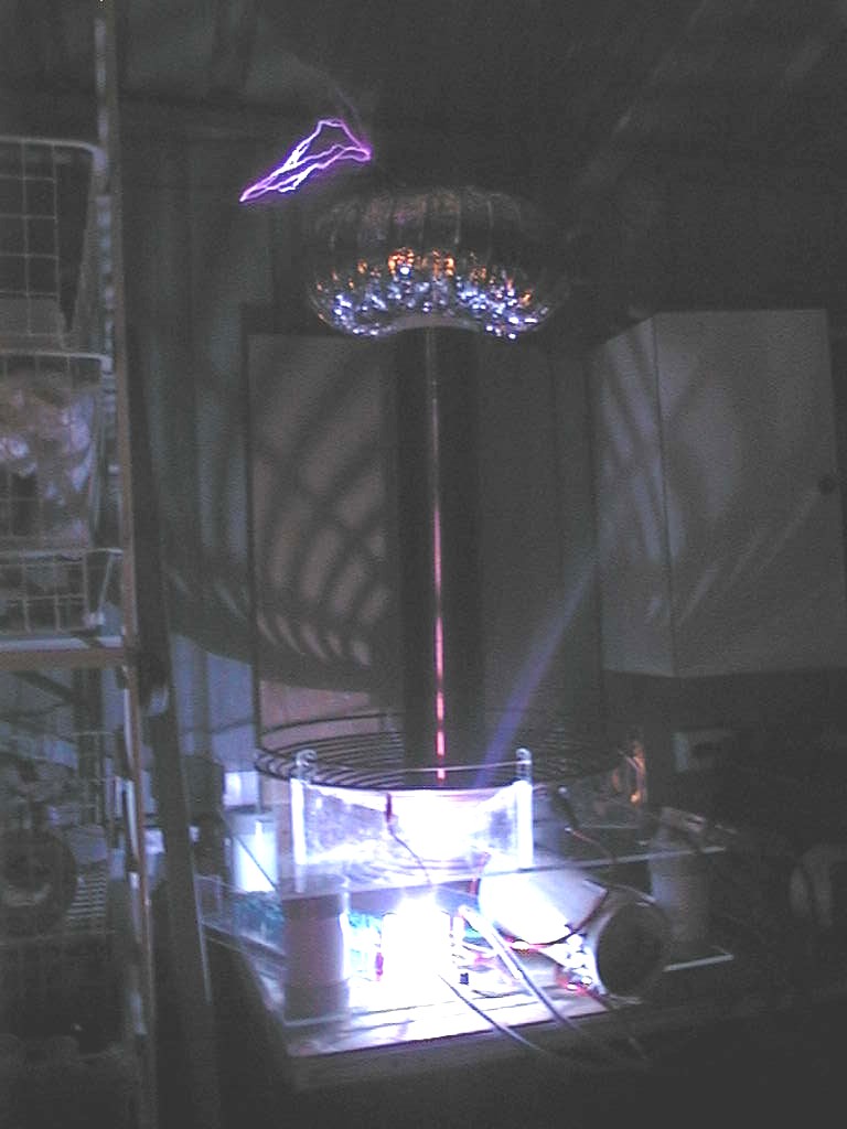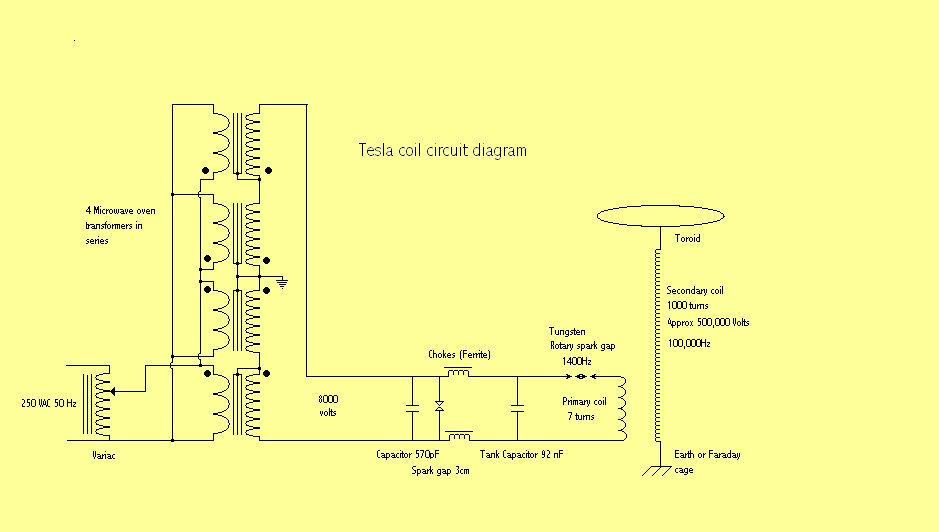 2003 From the Tesla coil sparks page. A Tesla coil such as this one with sparks of 8 feet equates to about 500,000 Volts. It is very hard to measure this voltage directly. See calculations of voltage in Tesla coil 6 inch. The largest spark that I am aware of at 325 ft was from a 5 MV Marx generator, not a Tesla coil. Interestingly, real lightning is only estimated to be 10 - 120 MV . Lightning length appears to be determined by cosmic ray shower activity and is vastly extended in length due to relativistic electrons initiated by the cosmic shower. A simplified circuit diagram of my latest coil is shown below and also includes various filter circuitry and safety spark gaps to prevent the very high voltages from wreaking havoc with the lower voltage side. It includes 4 microwave oven transformers (MOT's) driven by a variac. These supply about 8 kV to the primary coil, capacitor and spark gap. This circuit is resonant at about 100 kHz and drives the secondary coil and toroid which are resonant at the same frequency.