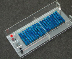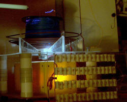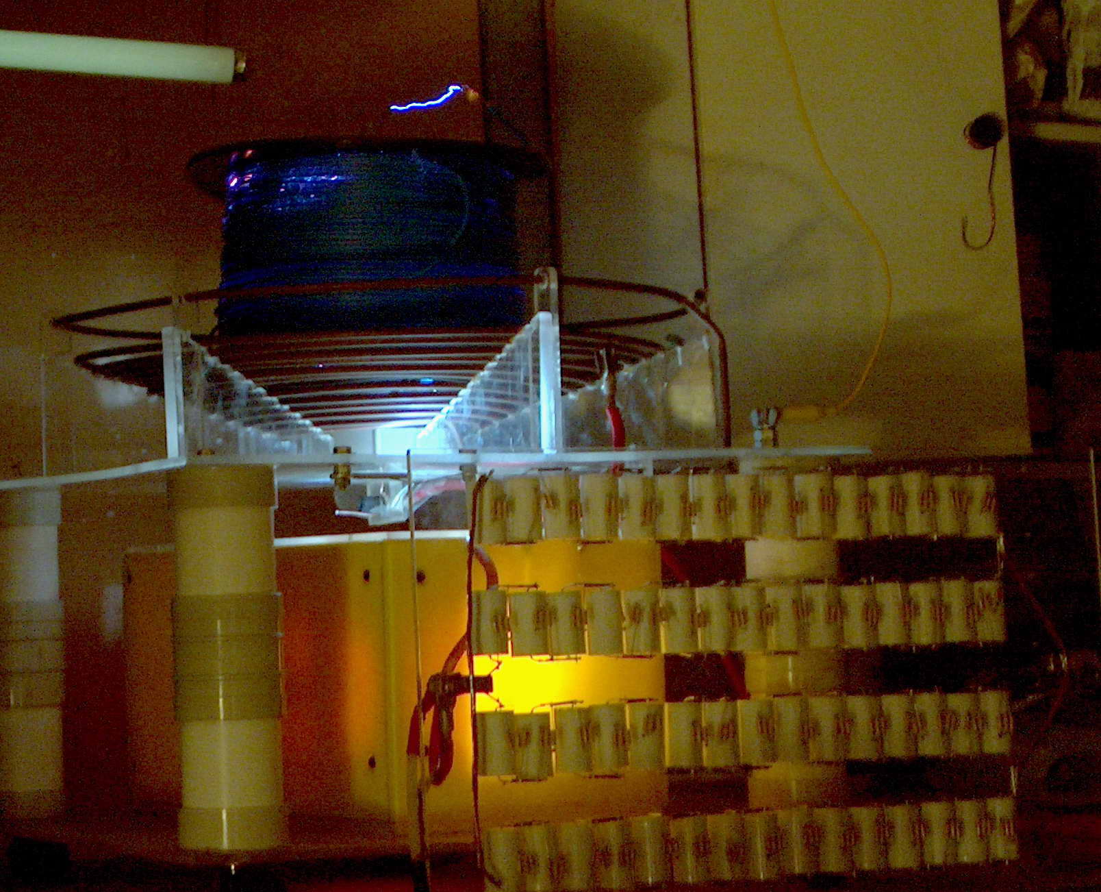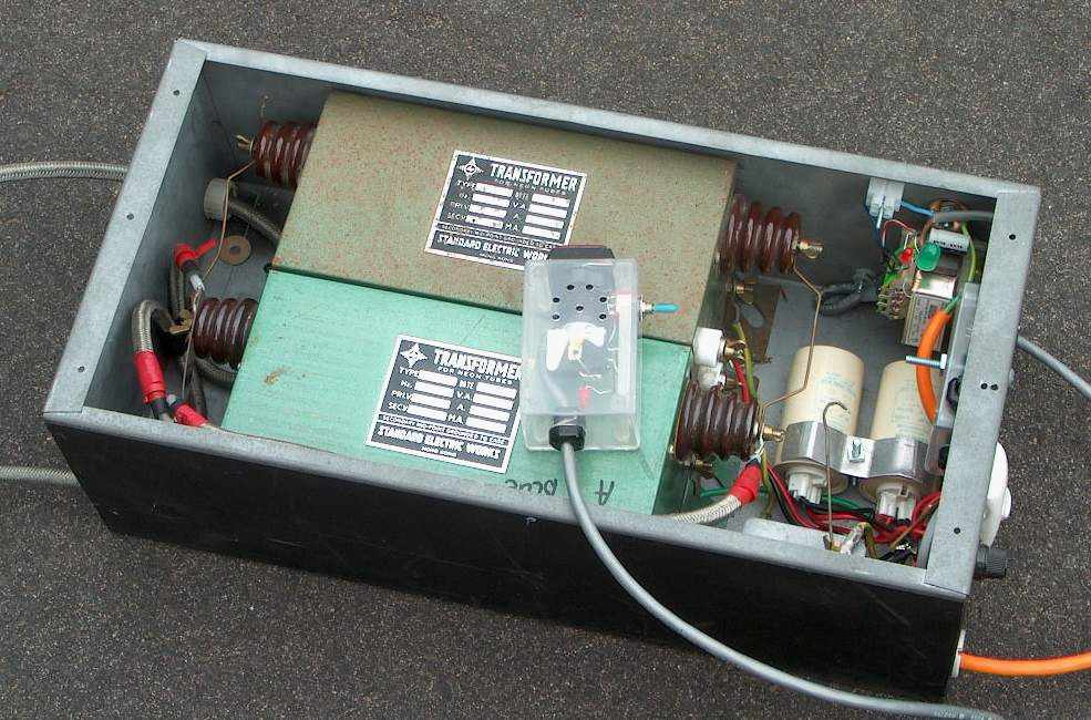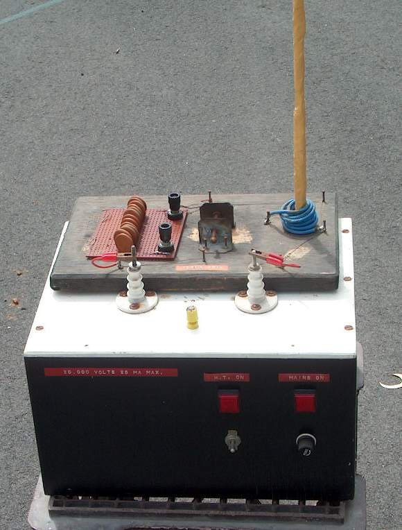 higher gave racing arcs! My first proper Tesla Coil (circa 1975) I later developed this idea with an old transformer (above) from a dump which in retrospect was an old unpotted NST (neon sign transformer). I used a single static gap with a 12 inch ferrite cored coil of 11 primary and 100 turns secondary giving 2 inch sparks with 26 small ceramic capacitors with 2 strings of 13 x 10 nF at 2.5 kV each. It ran nicely for about 20 years! Years after I made it I heard that Tesla had beaten me to that discovery by quite a few years! This photo is a mock up with most of the original parts. Developing my 4 inch coil 2003 This is my neat 2001 dual NST supply (above), now has half of one of the NST's defunct having overstressed it on my ARSG (asynchronous rotary spark gap). It used two old NST's bought for A$40 from a local neon place and rated at 12 kV 30 mA each. It uses two power factor correction capacitors of 15 uF each. I used a remote power switch driving a relay. This is how NOT to make 20 nF 30 kV capacitors. I used 200 x 10 nF (= 0.01 uF) 3 kV ceramics. Even wired as 10 nF 60 kV, I would blow a capacitor every 30 seconds or so. They appeared to be substantially less well rated than the long lasting ceramics in my first TC. There were no equalizing resistors in either setup. It was later sawn in half for a voltage multiplier shown later. The sparks grew bigger with successive improvements up to about 20 inches. Having gained a lot of experience and having read widely on the internet increased my desire for more performance. Time to move up: 'bigger is better'. (Remember this was 2003). Head off to see the later 4 inch, 6 inch and 18 inch coils from the menu at the top of the page.