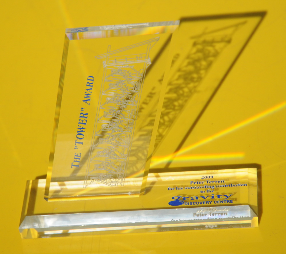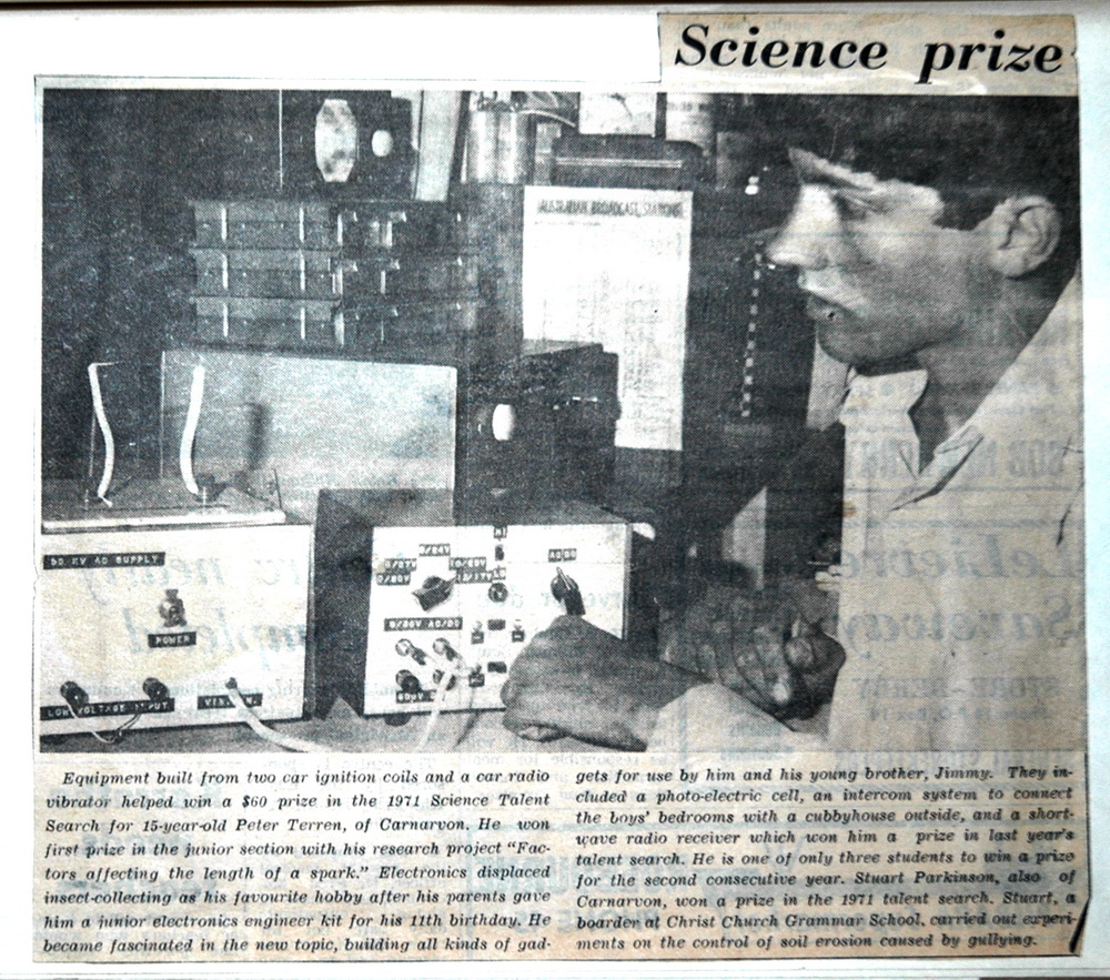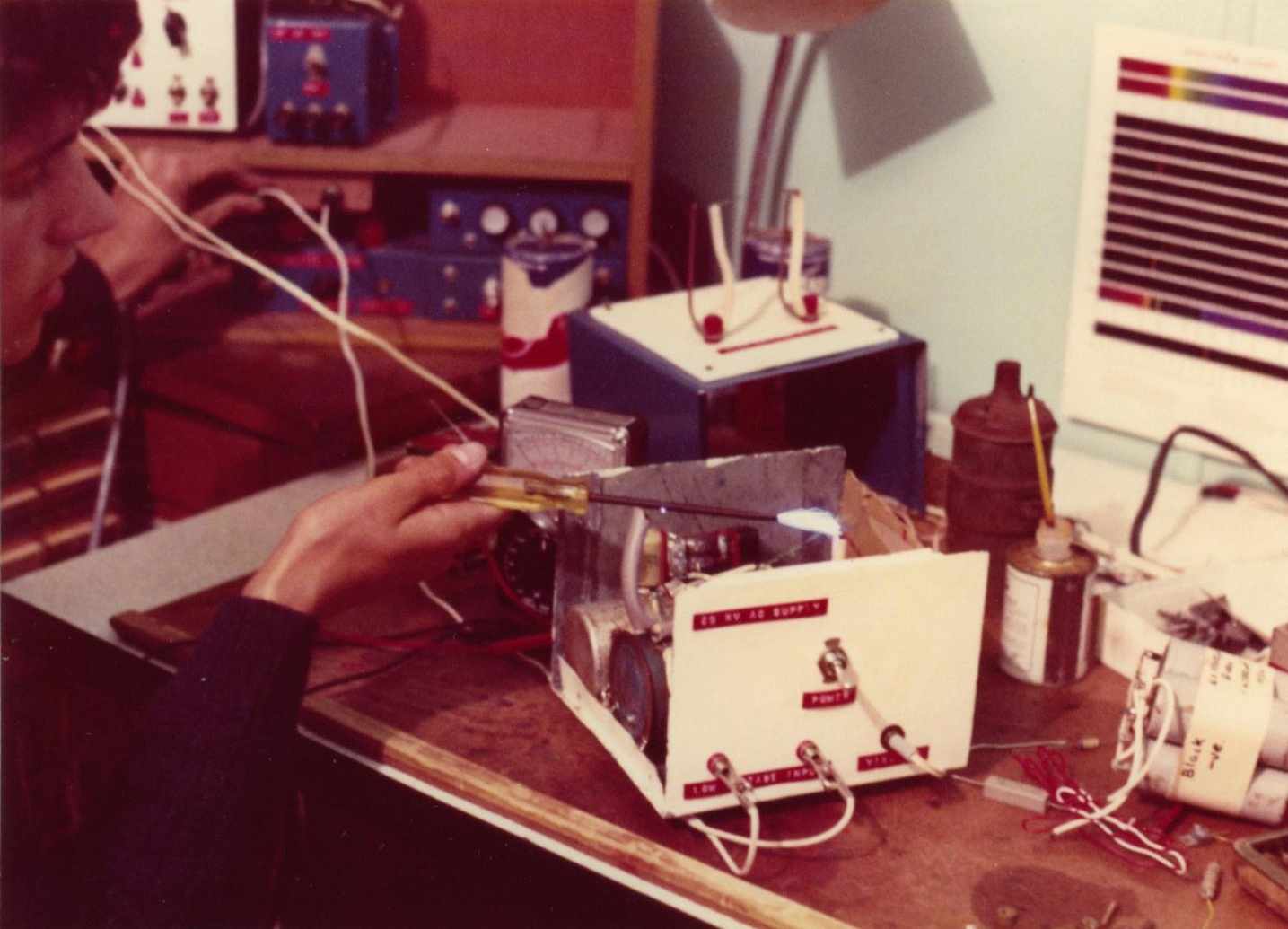 magical moment burned in my memory. This was my first electronics kit from the late 60's. Actually mine is long gone but this is the exact same one from eBay and a very sentimental find. I still remember many of the part numbers. From this I made my first electronic project, a portable radio, when I was 12. High voltage followed a few years later in the course of developing some science projects like this. High voltage 1972 style with twin ignition coils. I won Science Talent Search prizes in 1970, 71 and 72 Since then almost nothing happened for 25 years (a regret of mine) due largely to work and city living with no available shed. In the last 10 years I have had more time to pursue the holy art of electrickery. This has been aided considerably by the internet and sites including those in links. I currently live on the outskirts of a small coastal city in Western Australia on a one acre block. It is rural enough to have kangaroos coming up our drive occasionally and more importantly, neighbors are distant enough not to be bothered by noisy Tesla coils. My shed is below. 'A clean shed is a sign of a sick mind', I think someone said. (Actually the quotation was from Einstein "If a cluttered desk signs a cluttered mind, of what then is an empty desk a sign?".) When not working in the shed, I cycle (my best effort 340 km in 24 hours in April 2006). And I have a day job as well which mostly involves collecting pens (see below). This is 336 of my best pens collected over 10 years which I made into a display in August 2004 with a laser pen and LED light pen hardwired in the display. Two pens are the same - on either side of the airplane . It makes a bit of a change from watercolors for the office. It made the back cover of an Australian magazine and won me a case of wine. Look into my eyes.. deep into my eyes. (my retinal shots from my optometrist). The white disk is where the optic nerve comes into the back of the retina. The dark blurred area is the macula where your prime focus is and has the greatest discrimination. The retinal veins are the larger red vessels and the arteries are paler but thinner and follow roughly the same course. MRI scan (above) just to show that the eyes attach to something. Never mind that my left cerebral cortex is trying to shove the right out of the way. The Tower award from the Gravity Discovery Center for services to the GDS 2010. Here, illuminated by LEDs from my bike. And a straight shot for media.... And a poem by one of my patients, now 80 years old