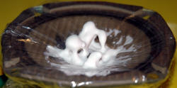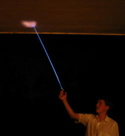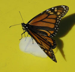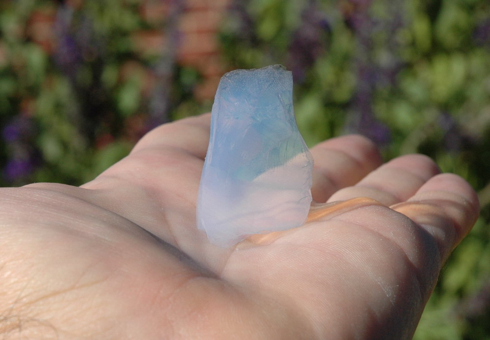 2006 Left photo shows a block of aerogel (from eBay, where else?). The right photo shows a live 0.5 g Monarch butterfly sitting on the aerogel which weighs 0.8 g. Volume of the aerogel here is just on 10 cc hence it is 80 mg/cc. At about AU$ 80 for 0.8 g, this makes it about 4 times as expensive as gold per unit weight. Aerogel is typically 99.8% air and is is made by high temperature and pressure-critical-point drying of a gel composed of colloidal silica structural units filled with solvents. The resulting silica dioxide structure is sponge like with microporosity on a nanometer scale. It has many unusual properties including extreme lightness (as low as 3 mg/cc), excellent insulating properties (39 times better than fibreglass) and high electrical insulation (1018 ohm cm compared with glass 1015). It was discovered in the 1930's but came into the public eye with aerospace uses including Mars Rover insulation and as a comet dust collector with Stardust 2. It can support 4000 times its own weight. It shows laser beams clearly just like thick smoke. This photo does not really show how clear it actually is.