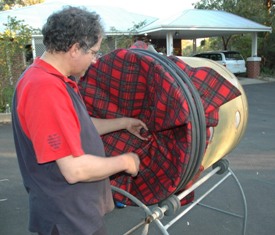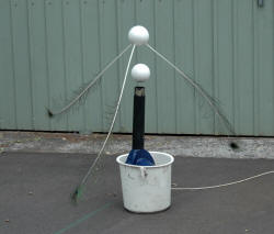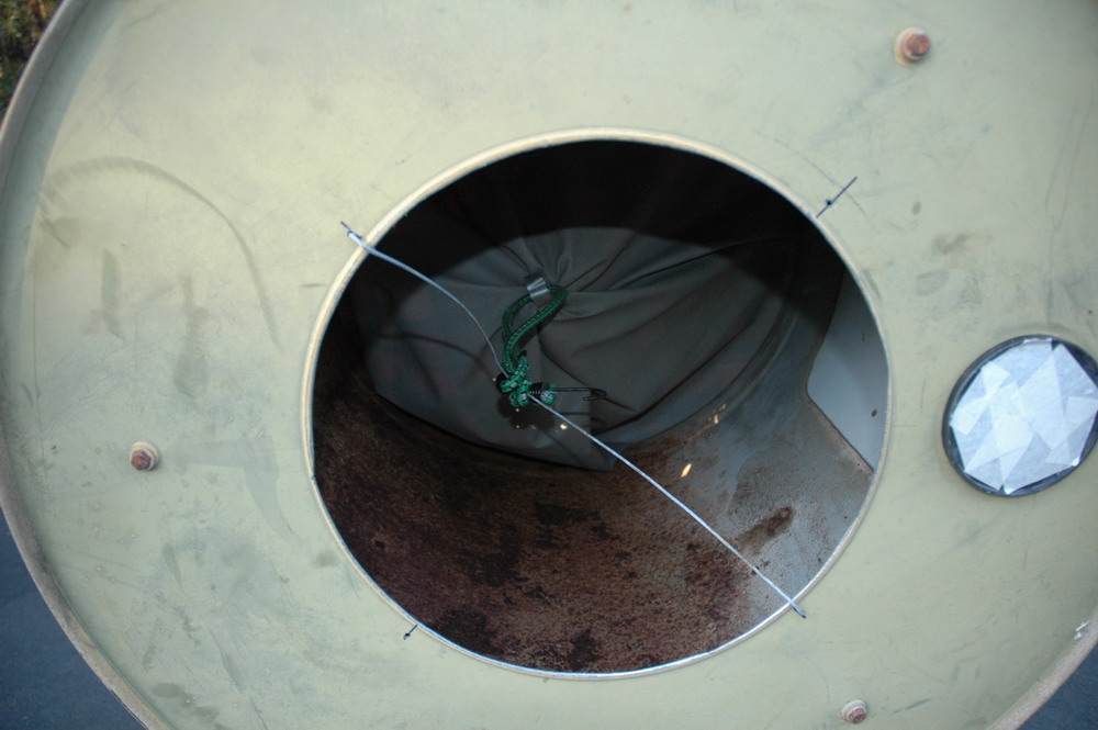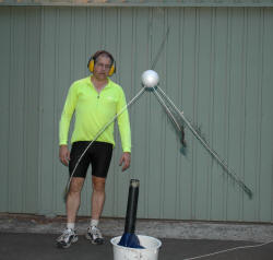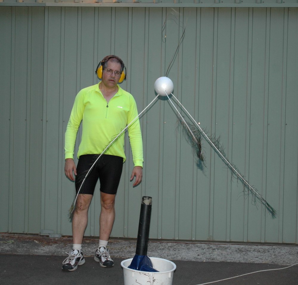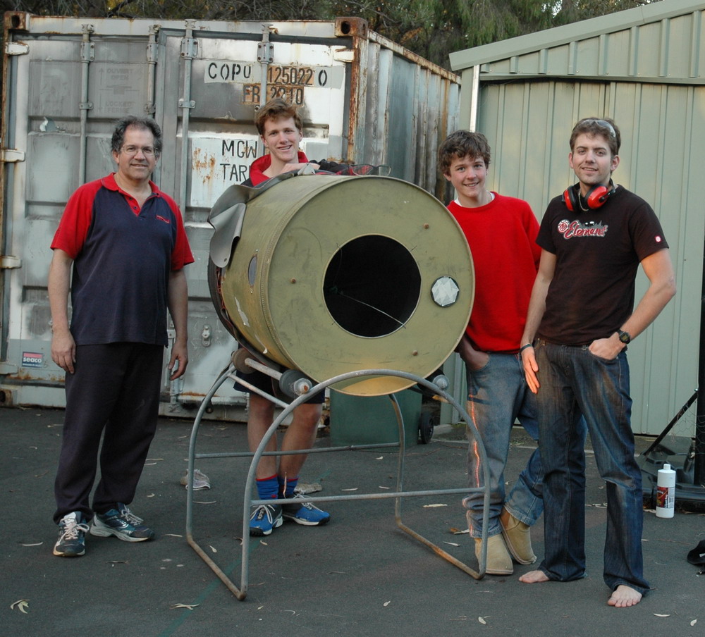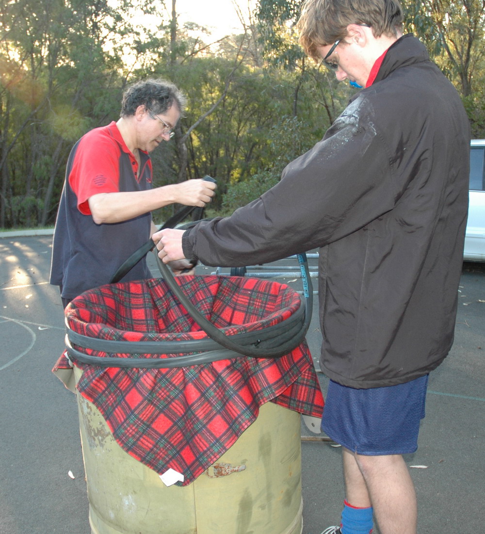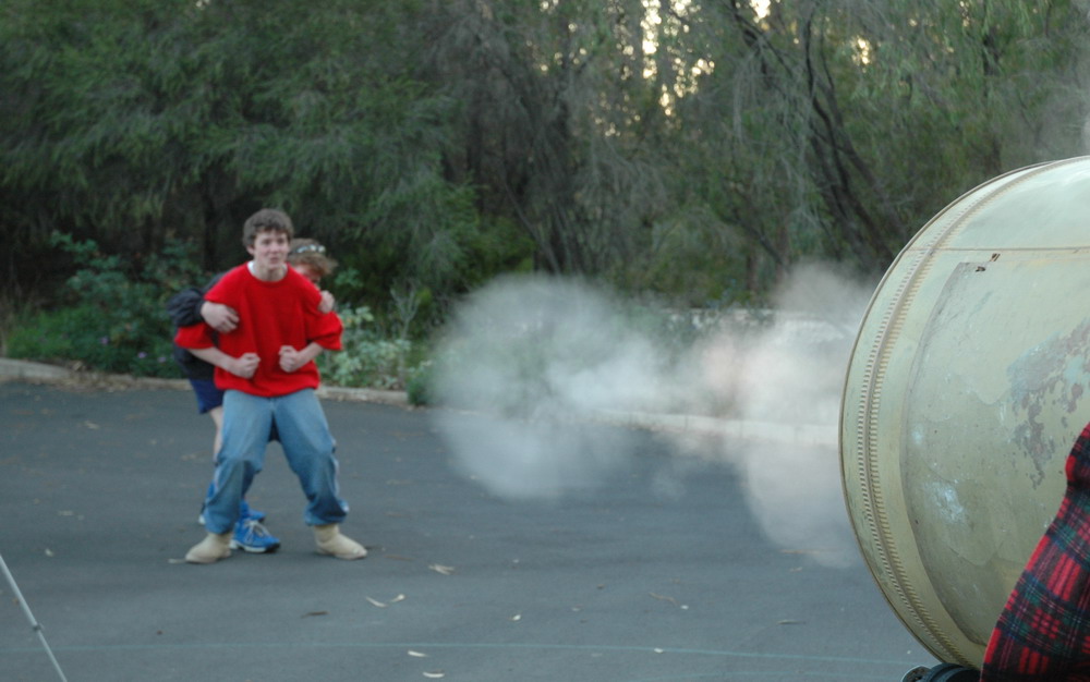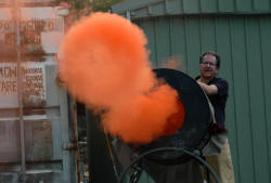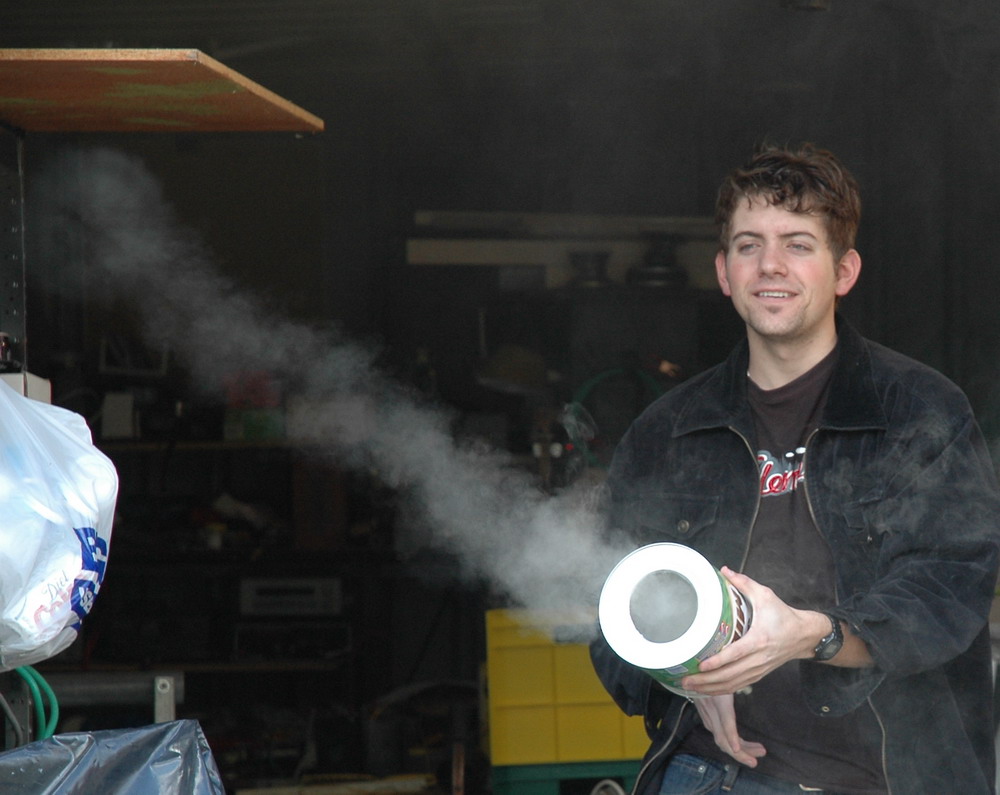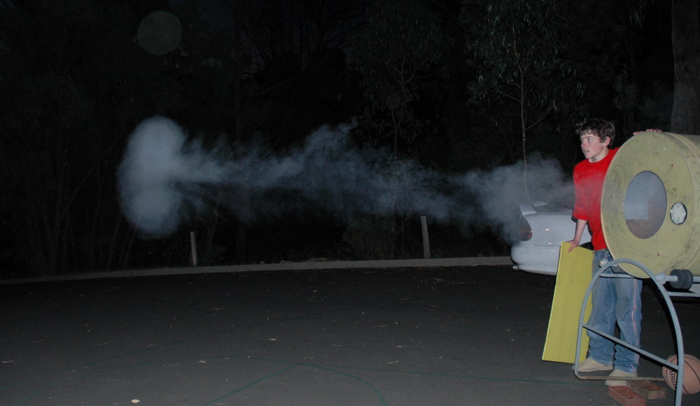 ring launchers 2006 The small can makes an effective and simple vortex generator. Next the big one made from a discarded compost tumbler measuring 80 cm diameter and 90 cm deep and mounted on a sturdy frame. The left photo shows me finally finding a use for those old bike tubes. The centre photo shows the elastic straps attached to the diaphragm made of a rubberized picnic blanket. The right photo shows the heater for the commercial fog fluid. The left photo shows the construction team from left of me, Chris, Michael and Justin. The centre photo shows a flash outdoors on a still night which highlights the vortex well. The right photo shows that there is no escape from the speeding vortex.