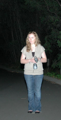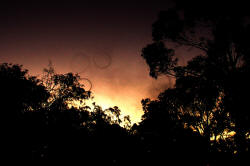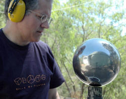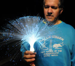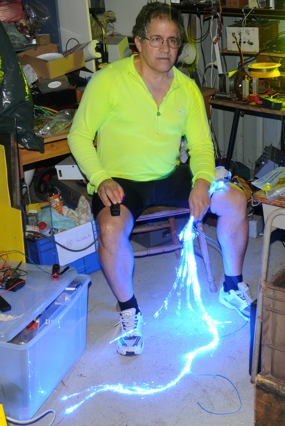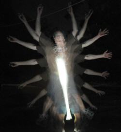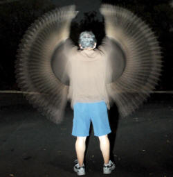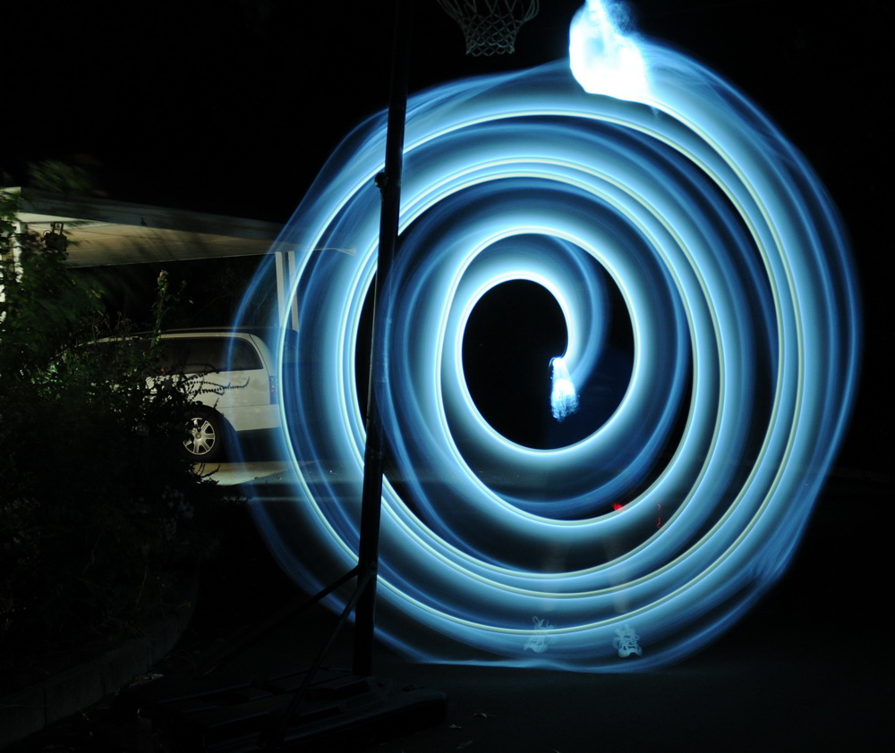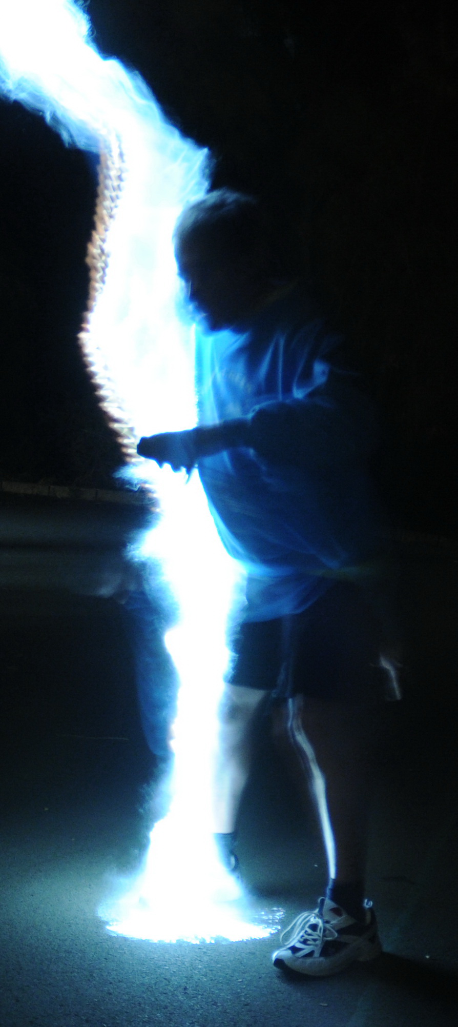 2008 Above left photo This is a small commercial battery powered LED array that my wife wanted suspended above the BBQ. I have covered one of the LED's with blue cellophane. The right photo shows it suspended above the camera. Now just give the lights a push and take a time exposure. Above left photo Pushing the array in a simple circular motion with some spin gives intricate geometric patterns. Center photo It's like you could almost grab it. This looks very much like a toroid used on top of my Tesla coils. The right photo shows the path followed by the one blue colored LED. This next one below is a little fan with programmed LED's in one of the soft plastic blades and was bought in Hong Kong (thanks Gail). The flash rate and sequence of each LED varies. Above left photo The fans with its 5 LED's is stationary. The right photo shows it running and you can see the pattern which constantly changes. Left and centre photos show the fan rotating spiral giving a lot of detailed patterns. Pushing the array in a simple circular motion with some spin gives intricate geometric patterns. It's like you could almost grab it. This looks very much like a toroid used on top of my Tesla coils. The right photo? Hmm.. only a mother could love a nerd like this. Left and centre photos show drawing with light using a handheld LED torch and a fiber optic spray. The right photo shows me drawing what looks a bit like a lightning bolt next to me. Above left photo shows my version of "plasma whip" modelled on the IronMan 2 version. The right photo shows the effect from two small decorative neon tubes spun in a circle.