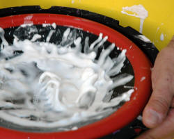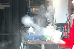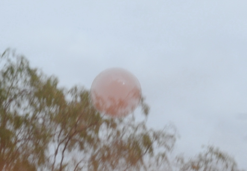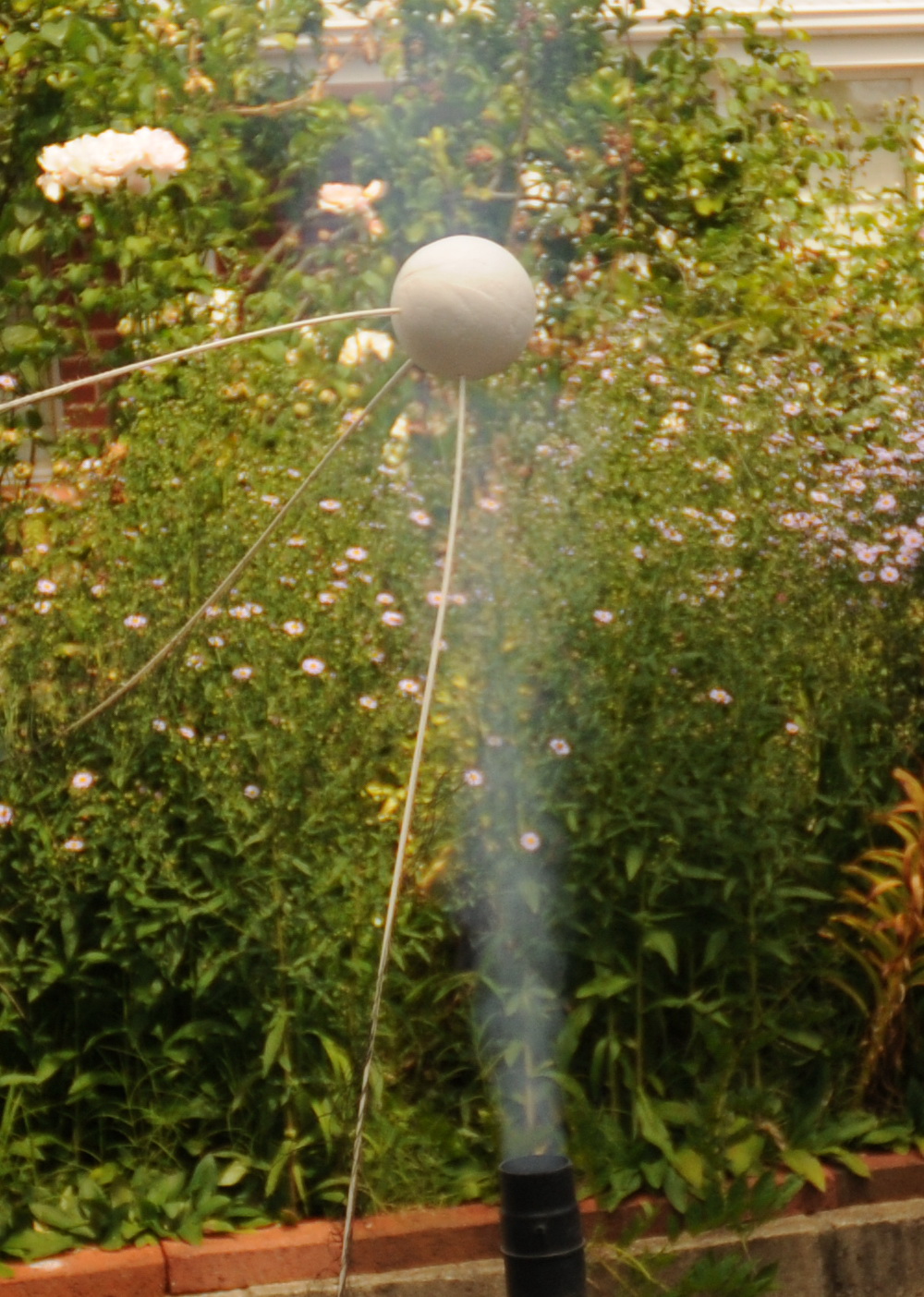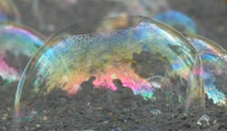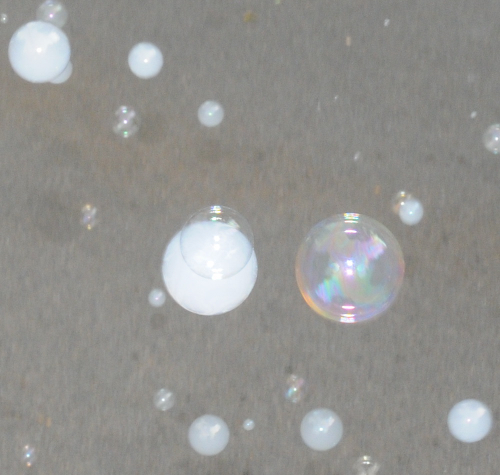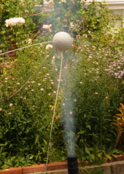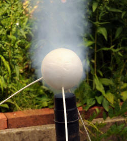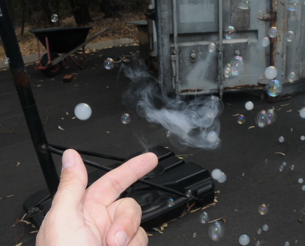 Bubbles 2008 Diorama in a bubble above. Note the thinning film on the top of the bubble which has stopped reflecting light. Reflection shows my son and I plus some trees. Above shows a smoke generator driving the bubble generator giving smoke filled bubbles. They otherwise behave just like ordinary bubbles - except they vanish in a "puff of smoke". How cool is that. You can even make orange smoke filled bubbles using a segment of a marine flare. Except it caught fire and sent flames through my smoke generator like the afterburner in a jet engine.