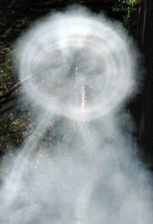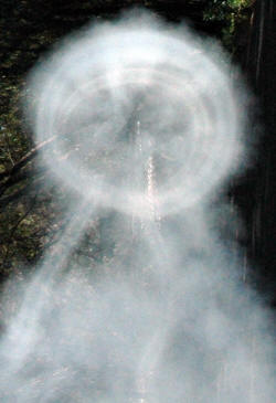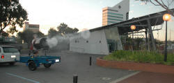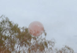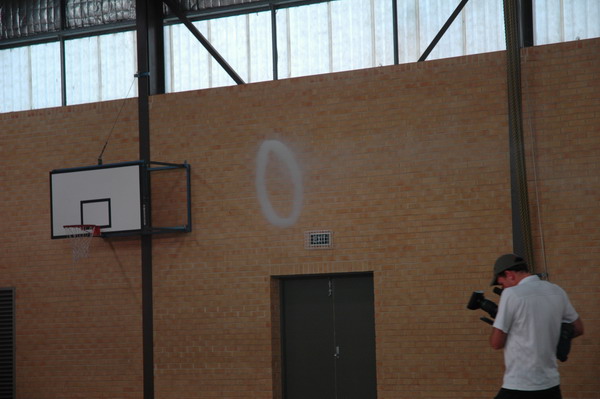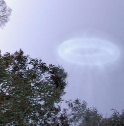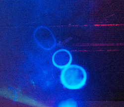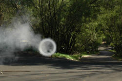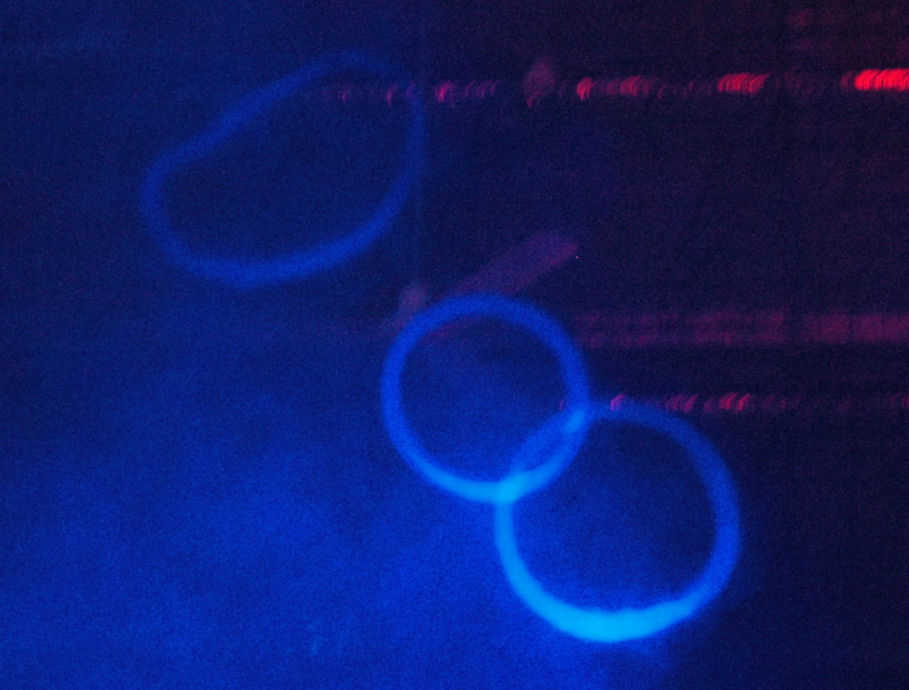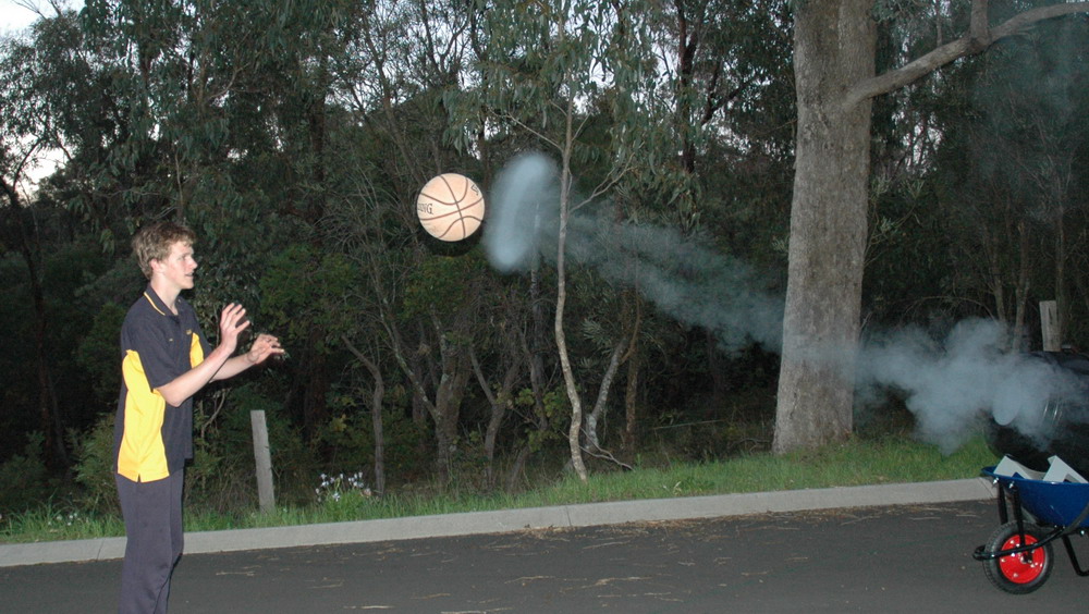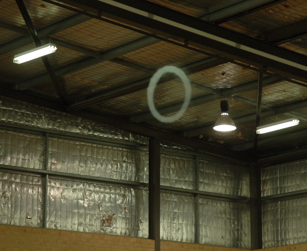 to play. A later version uses a commercial fog generator such as used in discos. The fog is a proprietary mix of propylene glycol and triethylene glycol in water. Above shows another slightly smaller vortex ring launcher made for the Physics Dept. Improvements include being lighter, portable and having an internal light and sights. The left photo shows the red internal light. The centre photo shows a basketball shot. The right photo shows the rings in a lecture theatre (with smoke detectors turned off) being lit by a projector. (Perhaps a use for the Windows blue screen of death). These photos show an oscillation that develops in a slow moving ring (the top one) is passed nearby by a faster ring. The slow moving ring becomes ellipsoidal in each axis alternately which lasts for several cycles. The photos above show some unusual vortex ring shots. The left photo shows a "UFO" shot which has bee rotated to be vertical. The centre photo shows a sunset shot of multiple rings. The right photo shows a ring passing into a tree with the physics building in the background. The flash fired for this one giving a strange quality.