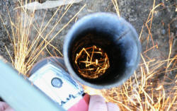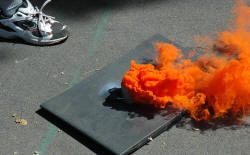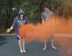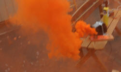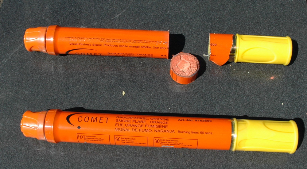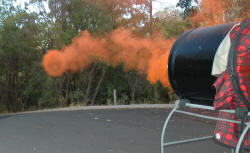 Colored smoke rings 2008 I used a standard boating flare that produces orange smoke. Under Australian maritime law it is required that you carry 2 red light flares for night and two smoke flares for day. This pack of 4 is available for AUD$70. Each smoke flare burns for 60 seconds. If you cut each flare into 1 inch slices with a hacksaw, then the 10 smoke flare slices will cost $7 each for 12 seconds bright orange smoke. The left photo shows the flares with a section cutout. The next photo shows that it won't work in open air as it just burns without orange smoke. Presumably oxygen must be excluded so the next photo shows a short aluminum tube as a firing chamber with ignition by my MAPP gas blowtorch. The right photo shows the dense orange smoke resulting. Above are photos of the orange rings in action.