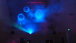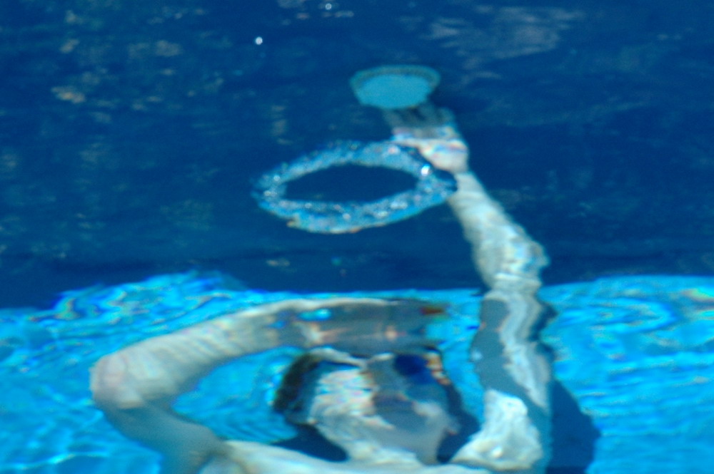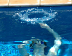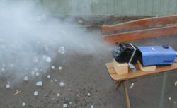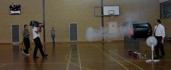 longer to heat. Above shows the long range shots taken in a school gym for the Discovery Channel video. They show the range of the rings and the clarity after a long run. These are going at walking pace and tend to drift up being slightly warm from the smoke generator. Above shows the commercial fog generator (about AUD $80 at Dick Smith's) as used in nightclubs. The fog is a proprietary mix of propylene glycol and triethylene glycol in water and a $10 1 litre container lasts all day. Above, my son, Chris, blows underwater vortex rings of air in the pool. Dolphins can do this as well.