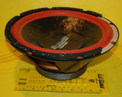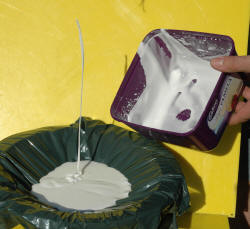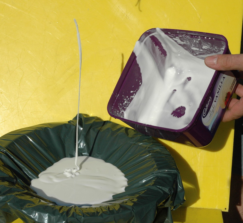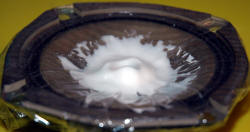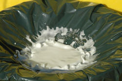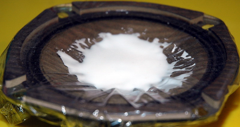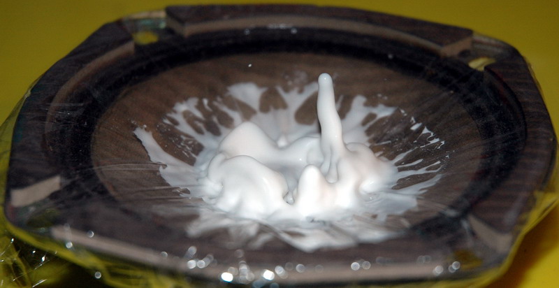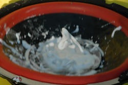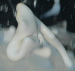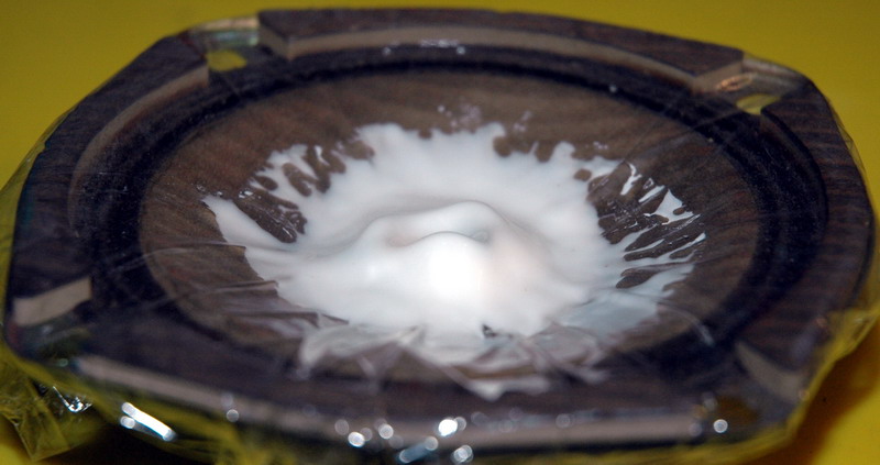 dropping resistor. I needed about 2.0 VAC i.e. 0.5 W. Photos above show varying effects as the power is increased. I tried this with a subwoofer and the results were a bit disappointing initially. The left photo shows the 12 inch subwoofer driven with 40 W at 50 Hz (12 VAC). The right photo shows only limited extension of the corn flour. Removing the plastic had little effect until I got out the frequency generator and a 100 W audio amp and picked out the resonant frequency of about 22 Hz where cone excursion was greatest and up to one inch. The left photo shows the 12 inch subwoofer driven with 40 W at 50 Hz (12 VAC). The center photo shows a shot at 25Hz where the corn flour lumps get thrown around. The right photo shows a close-up of one of the airborne lumps. You can get some unusual shots with the funny properties of corn flour. Here I was pouring it out with a spoon. The pour is falling but nowhere near as fast as it should.