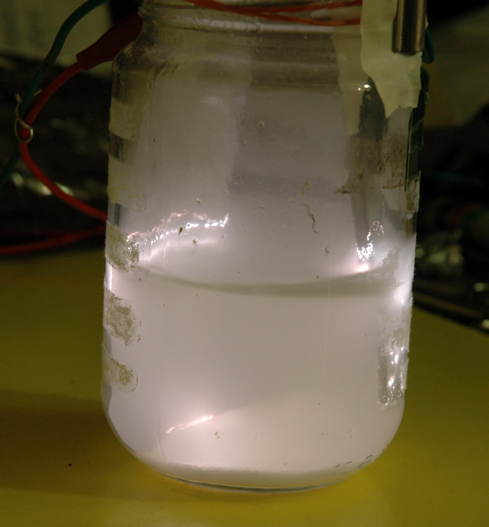 electrolytic capacitor/rectifier 2006 Left photo shows a sparkling of both electrodes with 150 VAC applied. The right photo shows a diffuse glow seen with dark adapted eyes, which starts at about 60 VAC associated with a little sparkling of the solid electrode.