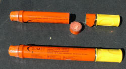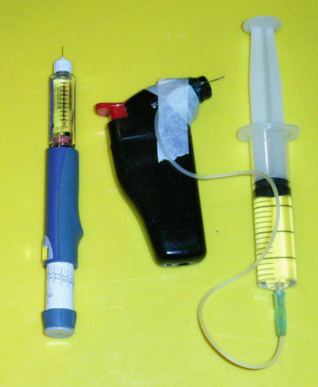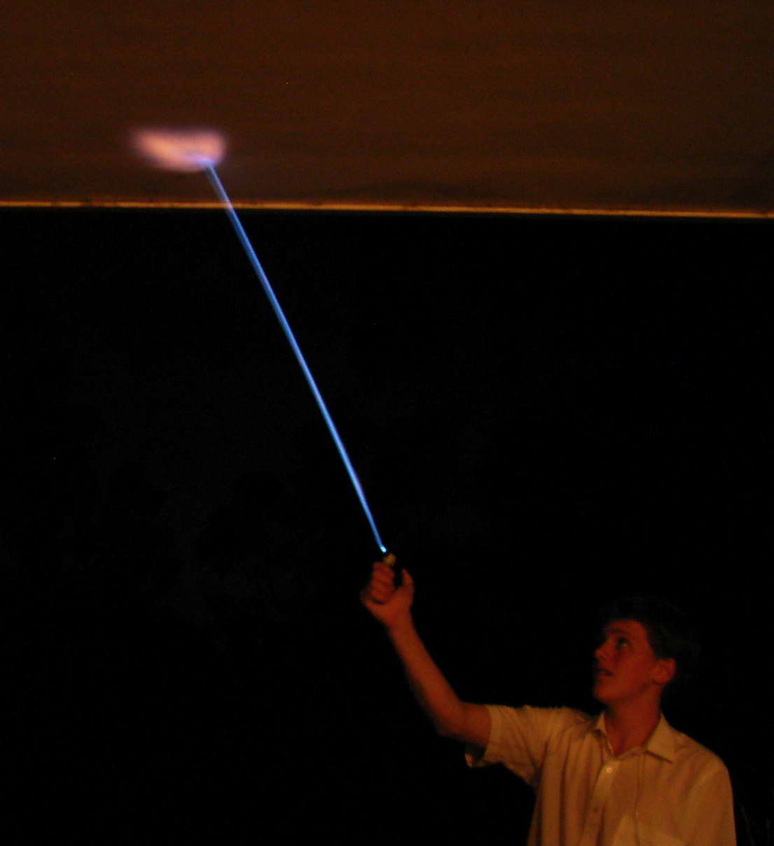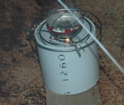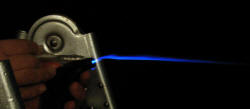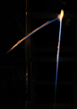 The left photo shows an insulin syringe with 27 G needle spraying methylated spirit (= "metho" - ethanol/methanol) through a little propane burner flame. The right photo shows kerosene which burns more completely but is thicker. The left photo shows a 10 ml syringe with 18 G needle and shows the patch where the unburnt metho lands. The center photo shows an insulin delivery pen with a 30 G needle which was not particularly impressive. The second arrangement had the needle fixed in the flame and was a lot easier to control. The right photo shows crossed beams (remember Ghost Busters - Never cross the beams). I used a 27 G scalp vein (butterfly) needle taped onto my little butane torch. The needle was bent into the flame. On its own this gives too much flow with a droopy and yellow flame. I got better results with crimping the end of the needle in pliers. When I overdid this and blocked it I bent it off to break it and this is what gave the best results. No doubt it is constricted in the end. The beam is visibly flatter with less tendency to fall but there is still unburnt metho droplets at the end of the 'beam'.