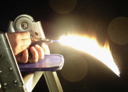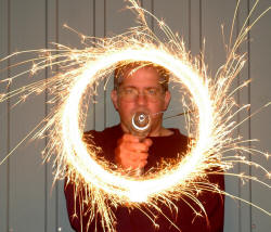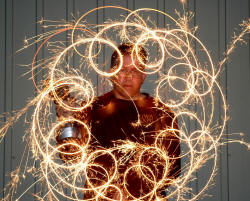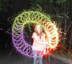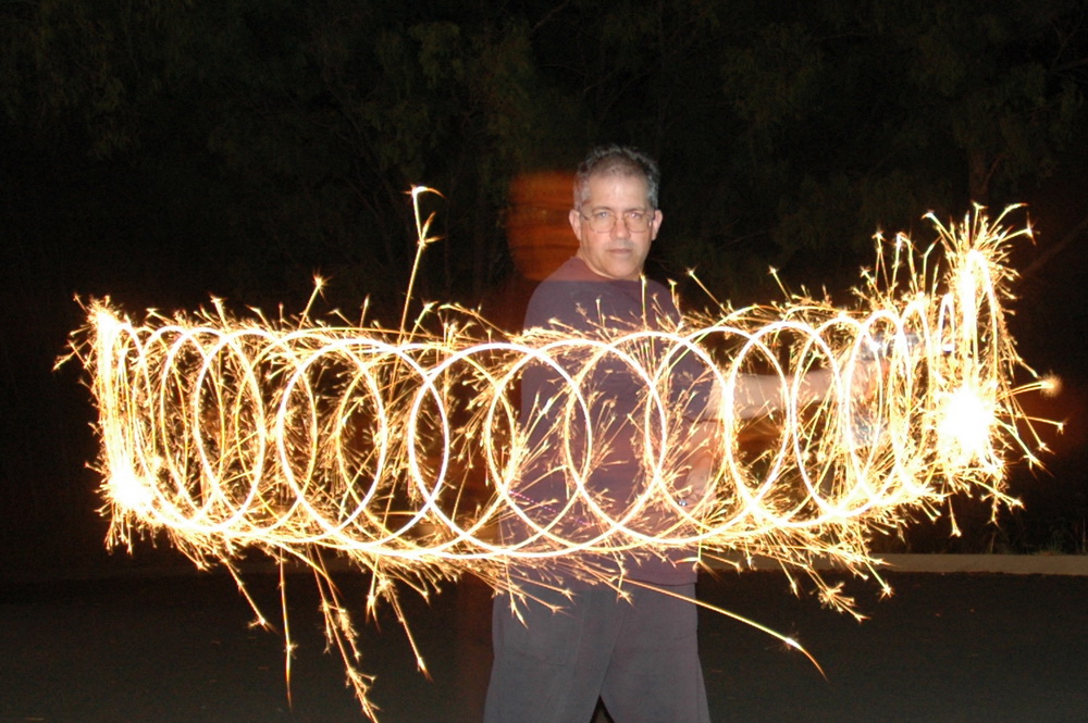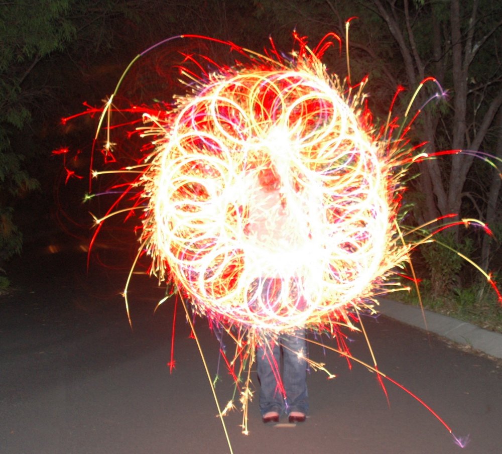Sparkler effects 2008 Photos above show a sparkler attached to an electric drill and a 5 second exposure. Above left photo - Jaimie are you ready? Centre photo: Jaimie unwittingly pushes the RED BUTTON and explodes. The right photo shows how it was meant to be done. Same sparklers in a cordless drill but using a rotating color filter.