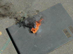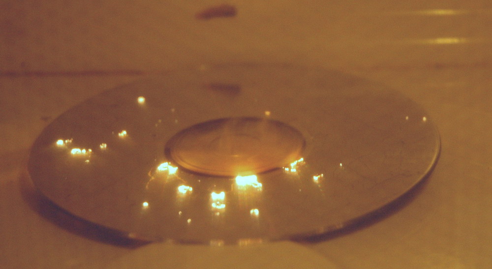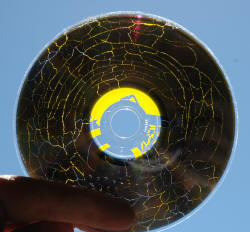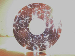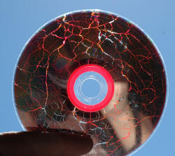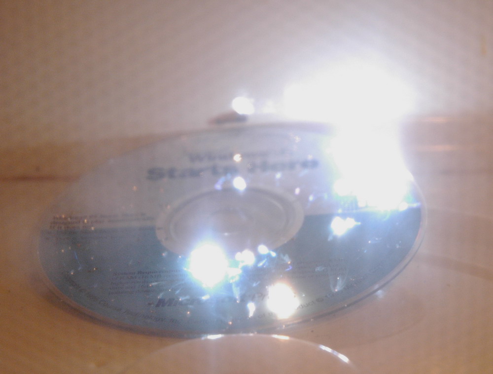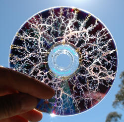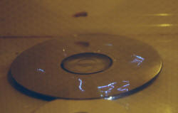 (Dec 2005) First off, here is a CD burner (literally). Place a CD (or presumably DVD) in the MO and run it. After a second or so sparks appear and shortly after flames after which it is wise to turn off to avoid magnetron damage in view of the lack of loading. Left and centre photos show the sparks then flames. The right photo shows "Windows 95 Starts here" and presumably ends here as well. This is a 2 second exposure capturing the fine branching sparks as they spread out over the CD. The fractal patterning is shown nicely if the CD backing is translucent or transparent when held up to the light.