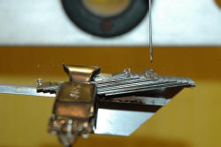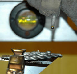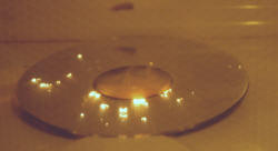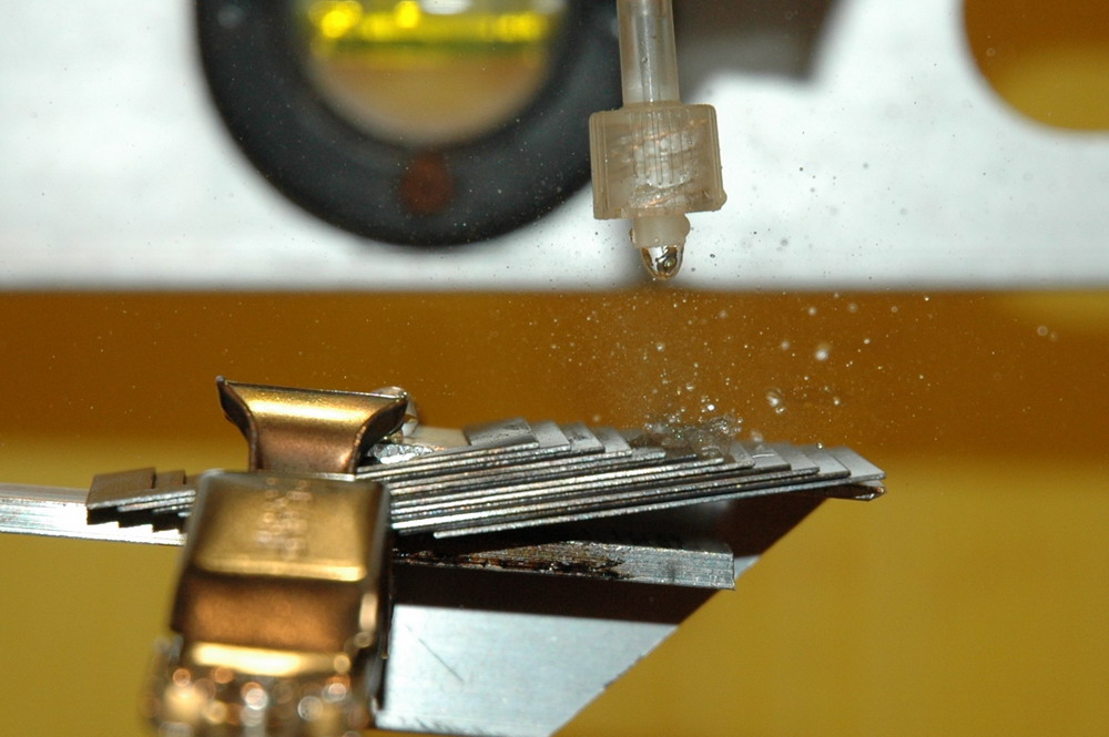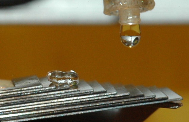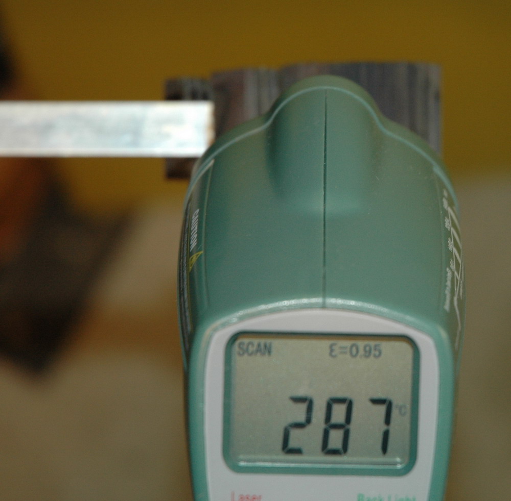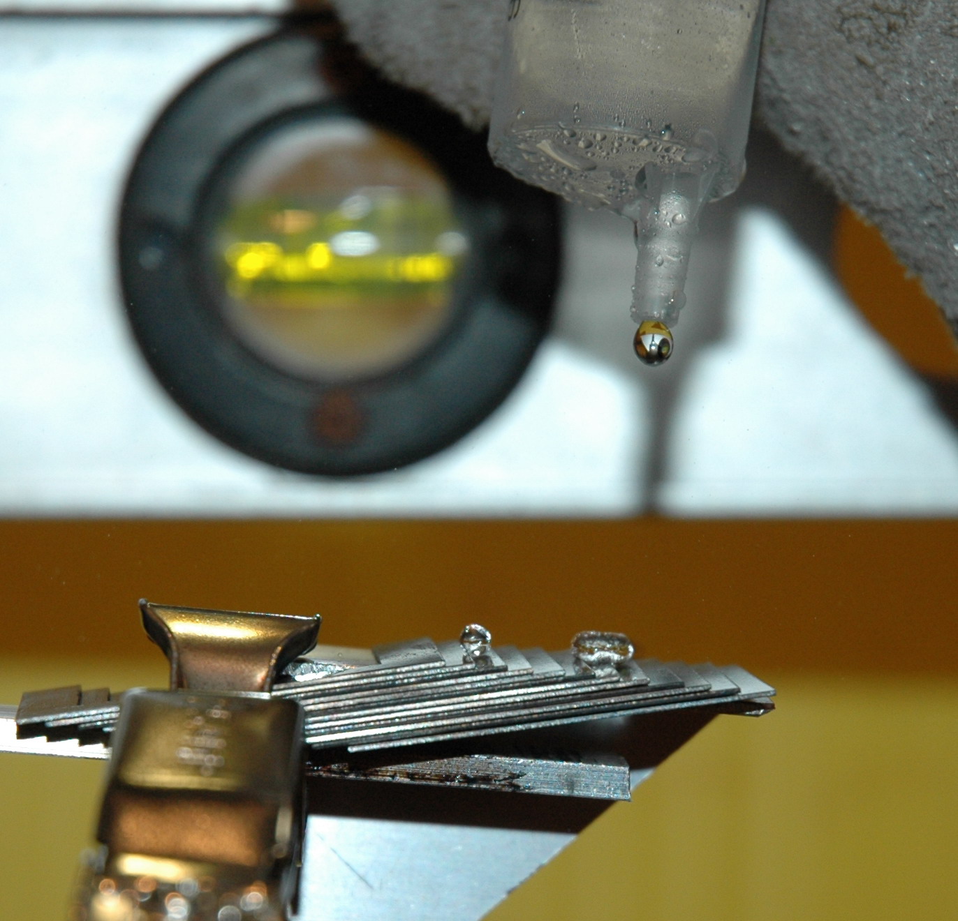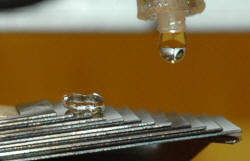 2006 The left photo shows a close up of a large drop of water dropped onto a hot ratcheted surface. It is traveling uphill from left to right. The surface was made from the iron laminations from a very small transformer. They are held in place with a crocodile clip onto an aluminium bar and are tilted downward from left to right. The spirit level in the background is dead level as is the camera. The centre photo shows two drops travelling uphill. The right photo shows a drop that has gone up the hill and down the other side. The left photo shows the MAPP gas blowtorch heating the laminations to 287 degrees C. The centre photo shows the infrared thermometer. Temperatures have an optimal range of perhaps 200 - 300 degrees C The right photo shows that the temperature has dropped to around 140 degrees and a water drop will wet the iron and boil with splashing and disintegration of the drop. Apparently the same happens with many liquids including alcohol and liquid nitrogen.