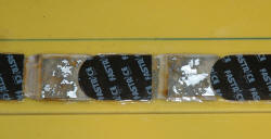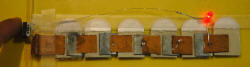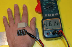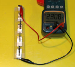 Here is another battery made from small squares of zinc plate each of which is tack soldered to copper foil squares each touching the electrolyte gel of a pad. Initial short circuit current is about 20 mA but this falls rapidly and this LED is being driven at 1.5 mA. Open circuit voltage is 4.8V so about 0.84V per cell.