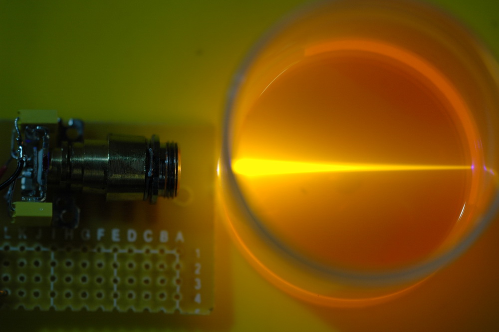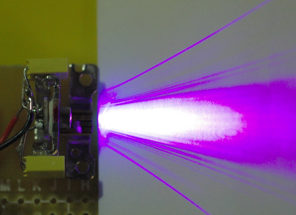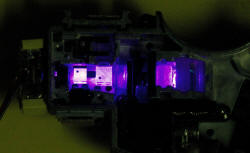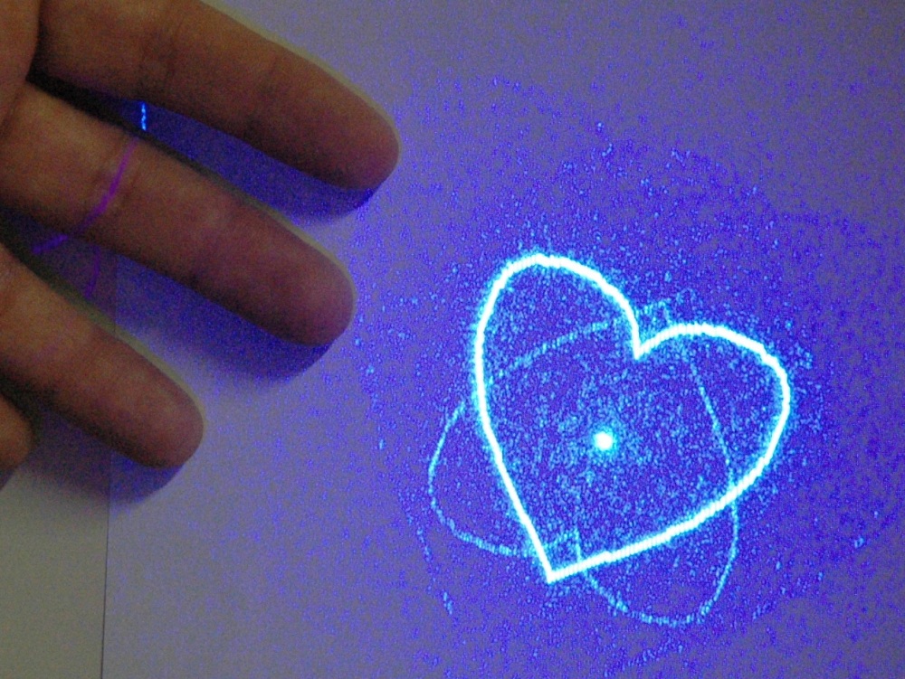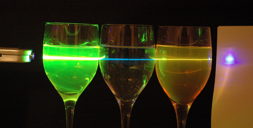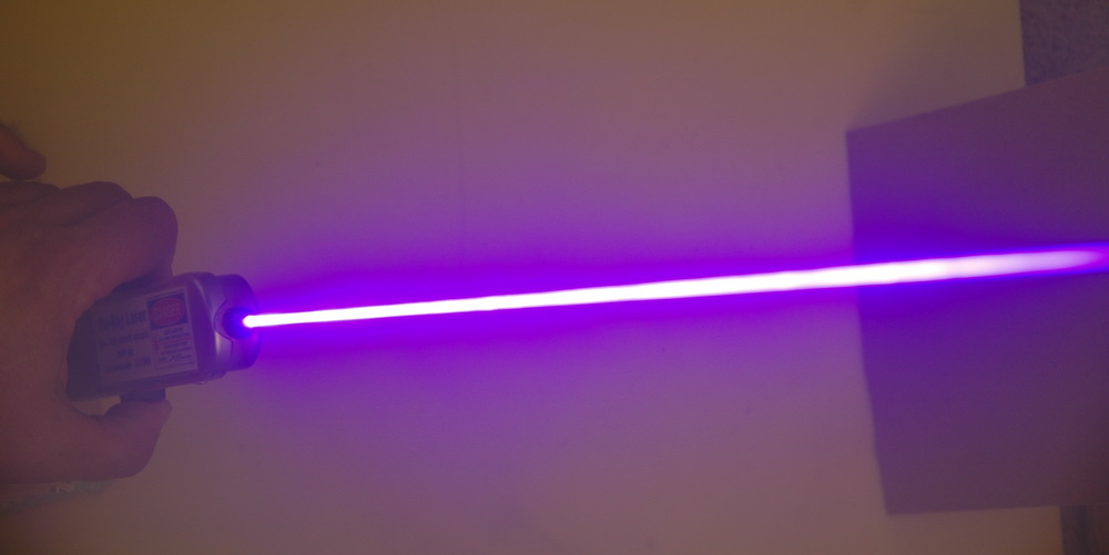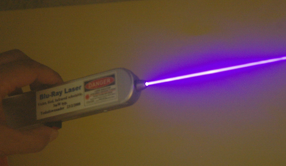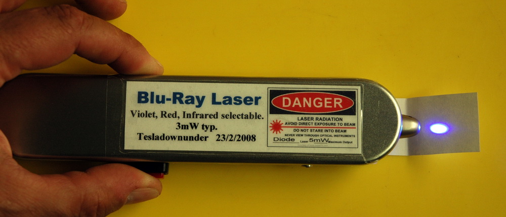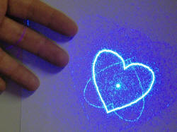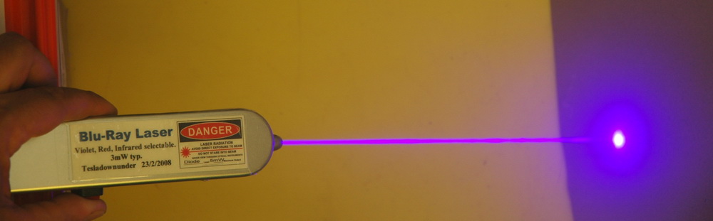 cardboard. The left photo shows the optics side with cover removed. The laser diode is the small assembly at the extreme left with the red mark on it. The center photo shows the other side with the objective lens and voice coil positioning. It is 7.5 cm (3 inches) across. The right photo shows the 5 pins of the laser diode for the 3 lasers and photodiode. The left photo shows red laser turned on. Note the yellow 0.1uF caps epoxied to the heat sink which I added to provide the electrostatic discharge (ESD) protection and a stable base for the wires to the driver. I eventually added three of these, one for each diode. The center photo shows red beam exiting the objective lens on the other side. It is a complicated beam having passed through various diffraction gratings and lenses like Fresnel lenses. The right photo shows the beam projected through translucent plastic a few inches away. The left photo shows the violet laser lighting up the optics. The center photo shows the diode projecting onto a piece of paper which is fluorescing. It is a very broad beam direct from the photodiode and not at all laser like. Safe to look at in this state only but not in the focused setup. The right photo shows the violet objective beam with the various lines and circles as with the red laser. The left photo shows the constant current supply set at around 30mA and the violet laser collimated into a spot. Here it shines onto paper and fluoresces a bright blue. The center photo shows it shining onto the tip of a fluorescent marker pen. The right photo shows the beam through Rhodamine with intense orange fluorescence. The photo above shows fluorescein, tonic water and rhodamine in glasses from left to right. The left photo shows the laser made up in a metal case. Ironically it used to contain a pen/red laser pointer. It shows the switch for selecting red/IR/violet. I wasn't really thinking because I should have had some low value resistors in the lines or some extra current shunting as I have damaged the red and possibly the IR diodes from over voltage or current. The right photo shows the laminated label. It is a nicely weighted comfortable unit. The left photo and center photos show saber like beam highlighted by fog. Pointing up to the camera the brightness is higher. The right photo shows the dog that was very interested in the dot (at first). The left photo shows a heart shaped hologram (from a cheap laser pointer) showing the bright blue fluorescence from paper. Center photo shows the heart hologram modeled by Mandy. Works great on white tee shirts and the hologram is low powered enough to be safe in public. The right photo shows the same pattern through a uranium marble with bright green fluorescence. The left photo shows the highlighted by fog. The right photo shows the beam against my fluoro cycling shirt with brilliant yellow green fluorescence.