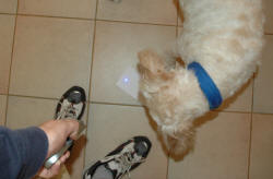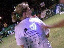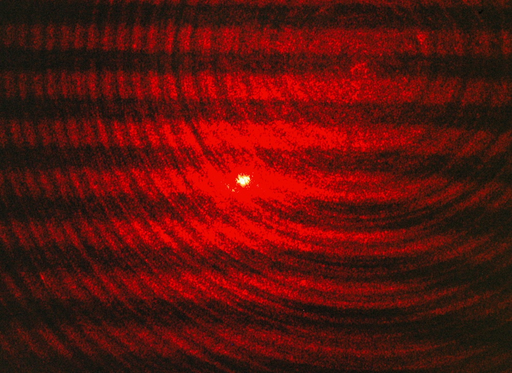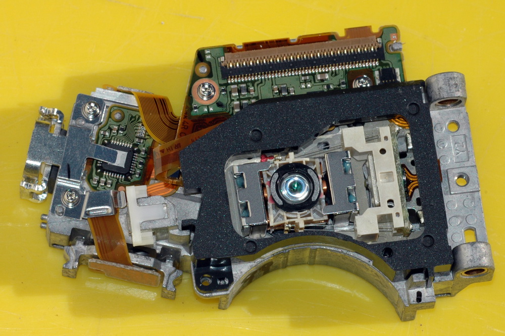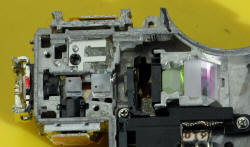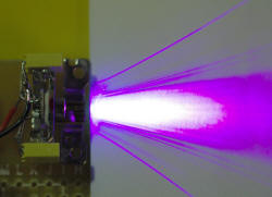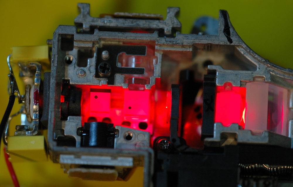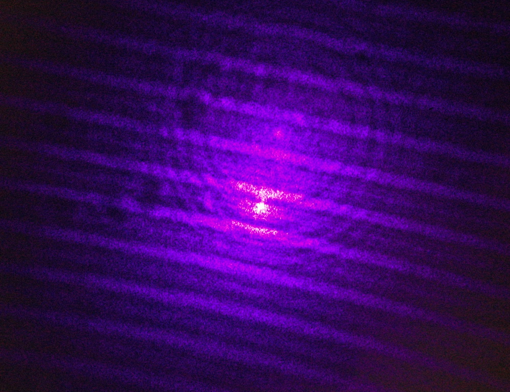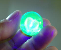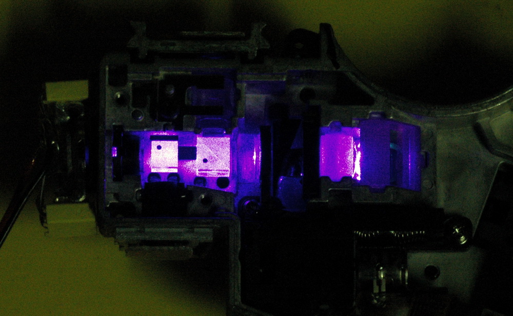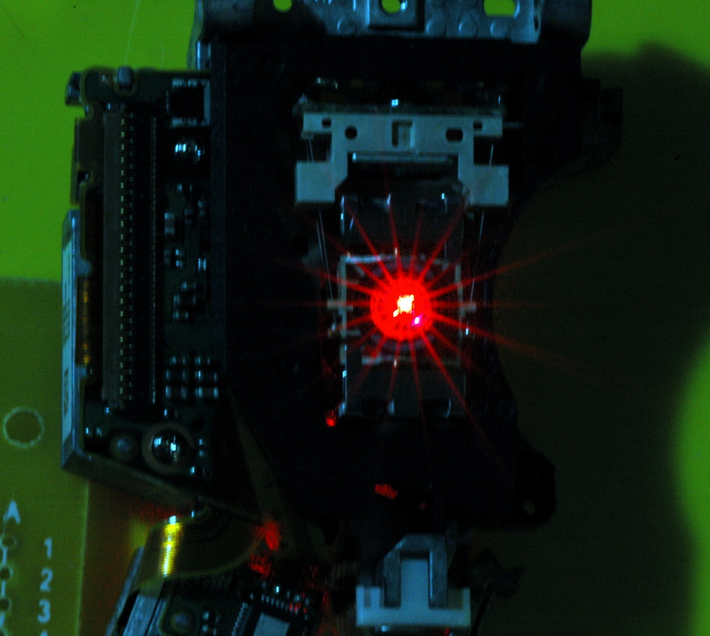 cardboard. The left photo shows the optics side with cover removed. The laser diode is the small assembly at the extreme left with the red mark on it. The center photo shows the other side with the objective lens and voice coil positioning. It is 7.5 cm (3 inches) across. The right photo shows the 5 pins of the laser diode for the 3 lasers and photodiode. The left photo shows red laser turned on. Note the yellow 0.1uF caps epoxied to the heat sink which I added to provide the electrostatic discharge (ESD) protection and a stable base for the wires to the driver. I eventually added three of these, one for each diode. The center photo shows red beam exiting the objective lens on the other side. It is a complicated beam having passed through various diffraction gratings and lenses like Fresnel lenses. The right photo shows the beam projected through translucent plastic a few inches away. The left photo shows the violet laser lighting up the optics. The center photo shows the diode projecting onto a piece of paper which is fluorescing. It is a very broad beam direct from the photodiode and not at all laser like. Safe to look at in this state only but not in the focused setup. The right photo shows the violet objective beam with the various lines and circles as with the red laser. The left photo shows the constant current supply set at around 30mA and the violet laser collimated into a spot. Here it shines onto paper and fluoresces a bright blue. The center photo shows it shining onto the tip of a fluorescent marker pen. The right photo shows the beam through Rhodamine with intense orange fluorescence. The photo above shows fluorescein, tonic water and rhodamine in glasses from left to right. The left photo shows the laser made up in a metal case. Ironically it used to contain a pen/red laser pointer. It shows the switch for selecting red/IR/violet. I wasn't really thinking because I should have had some low value resistors in the lines or some extra current shunting as I have damaged the red and possibly the IR diodes from over voltage or current. The right photo shows the laminated label. It is a nicely weighted comfortable unit. The left photo and center photos show saber like beam highlighted by fog. Pointing up to the camera the brightness is higher. The right photo shows the dog that was very interested in the dot (at first). The left photo shows a heart shaped hologram (from a cheap laser pointer) showing the bright blue fluorescence from paper. Center photo shows the heart hologram modeled by Mandy. Works great on white tee shirts and the hologram is low powered enough to be safe in public. The right photo shows the same pattern through a uranium marble with bright green fluorescence. The left photo shows the highlighted by fog. The right photo shows the beam against my fluoro cycling shirt with brilliant yellow green fluorescence.
