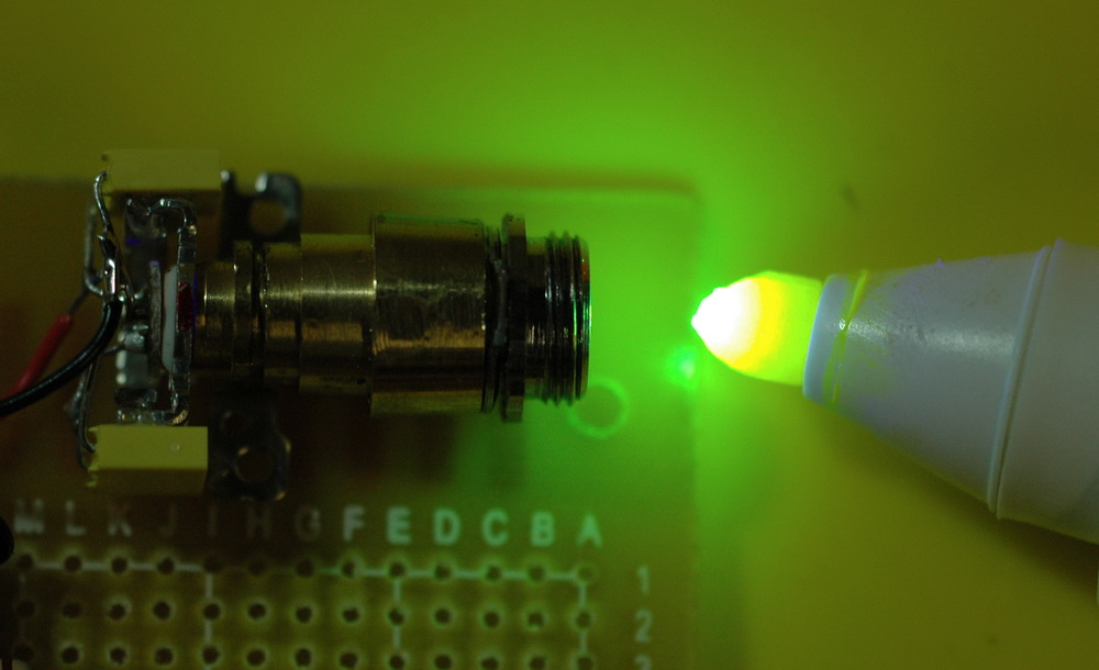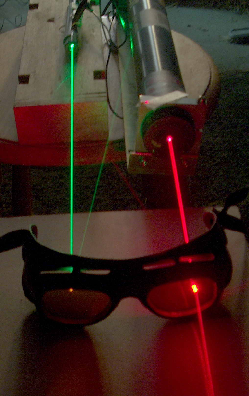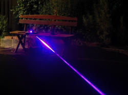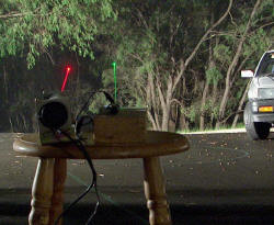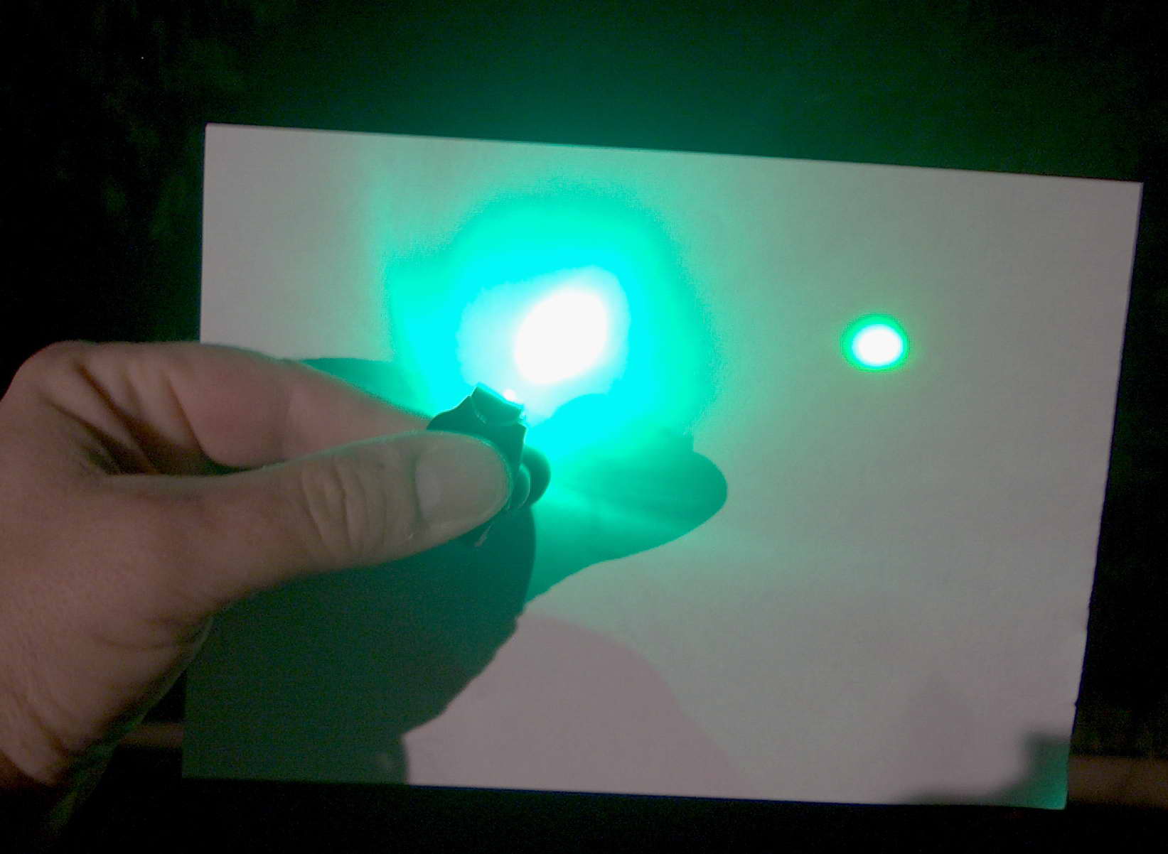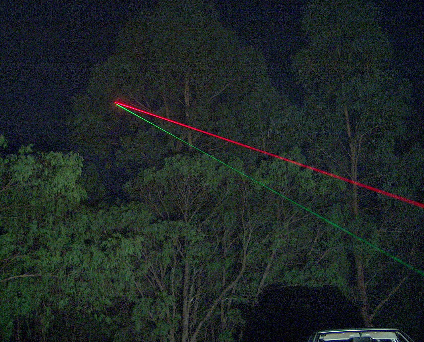 Green diode laser 5 mW 2004 The class IIIa 532nm 5 mW green diode module is lashed up in an old red laser pointer case that takes AAA batteries. Not fancy but effective and still gives me access to the power lines and switch. The light is 50 times as bright as a 1mW red laser pointer (5 times the power and green is 10 times the visual brightness of red). At a current of 400 mA the little AAA batteries are struggling to keep up the voltage much above 2.4 V and the brightness is reduced . For the shots below I have set my power supply to deliver 3.05 V and the head does get warm. The beam is visible in normal night air. The photo on the right is a comparison of the green laser when it has diverged to about 1 cm compared with my green ring which is 14,000 mCd and seems much brighter. I had understood that the output of the LED was about 5 mW. This would suggest that the diode is underperforming. These photos were taken on a foggy night and compare the 5 mW green diode laser and the 10 mW red HeNe laser which interestingly seem of equal brightness to the eye as well as the camera. The first two photos are the same but taken from a different perspective and with different lighting. A shot through my green laser safety glasses to show the effectiveness for green (but not red).