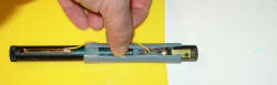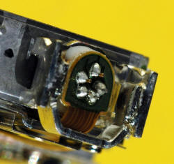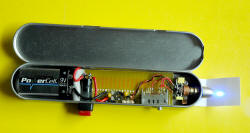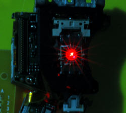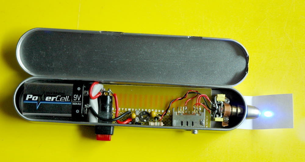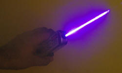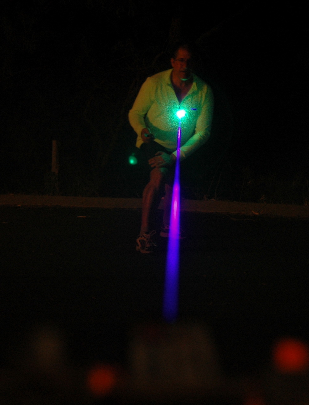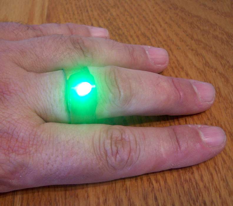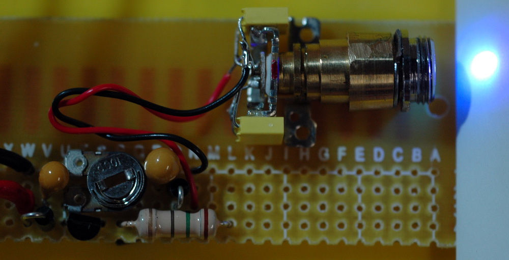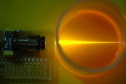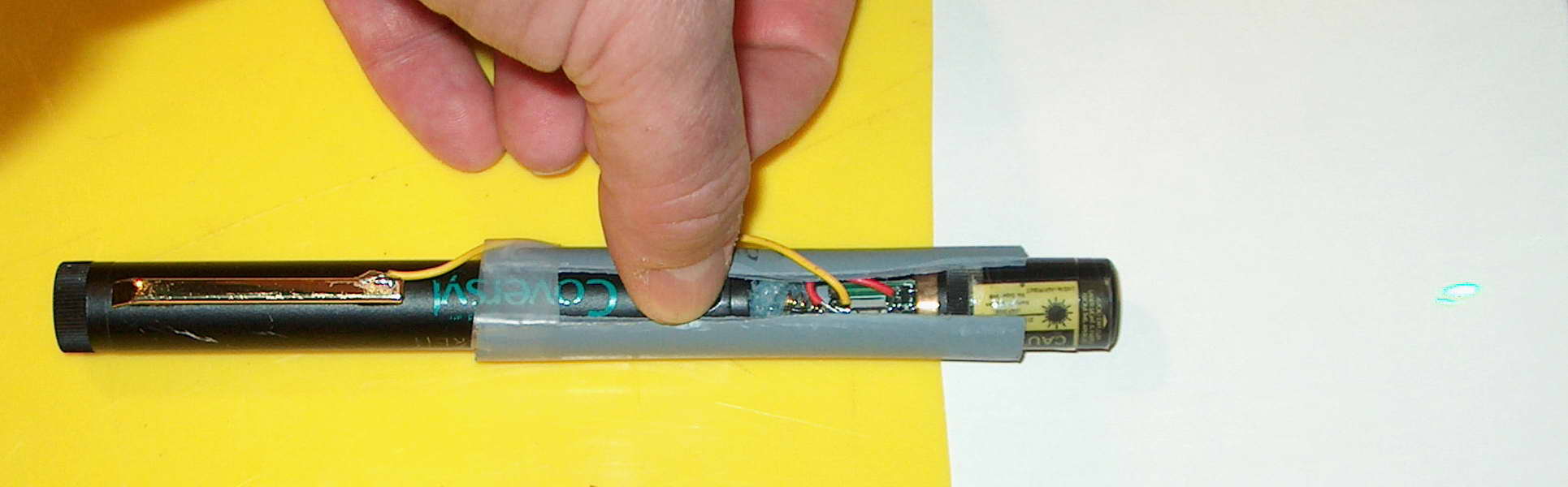 Green diode laser 5 mW 2004 The class IIIa 532nm 5 mW green diode module is lashed up in an old red laser pointer case that takes AAA batteries. Not fancy but effective and still gives me access to the power lines and switch. The light is 50 times as bright as a 1mW red laser pointer (5 times the power and green is 10 times the visual brightness of red). At a current of 400 mA the little AAA batteries are struggling to keep up the voltage much above 2.4 V and the brightness is reduced . For the shots below I have set my power supply to deliver 3.05 V and the head does get warm. The beam is visible in normal night air. The photo on the right is a comparison of the green laser when it has diverged to about 1 cm compared with my green ring which is 14,000 mCd and seems much brighter. I had understood that the output of the LED was about 5 mW. This would suggest that the diode is underperforming. These photos were taken on a foggy night and compare the 5 mW green diode laser and the 10 mW red HeNe laser which interestingly seem of equal brightness to the eye as well as the camera. The first two photos are the same but taken from a different perspective and with different lighting. A shot through my green laser safety glasses to show the effectiveness for green (but not red).