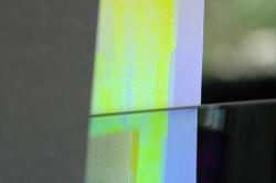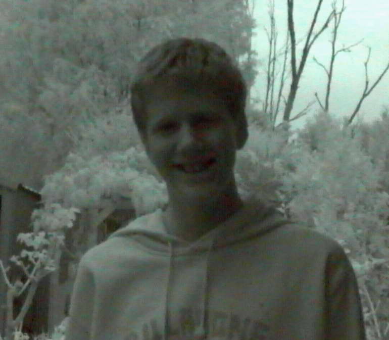 These photos were taken with a video camera without and with an infrared filter, seconds apart. Note the change in shirt colour. The filter coating achieves 90% reflection of the visible, with the remaining energy attenuated by absorption, to a level of OD 5+ attenuation of the visible, while transmitting in excess of 85% of the Infra Red. Cut on wavelength; 810nm +-5nm. Looking through the filter at a normal 150W incandescent globe shows only a faint outline of the the filament, but digital cameras light response often extends into the infrared. One digital video camera got a reputation for being able to "see through" some visibly opaque but infrared transparent clothing in this way.